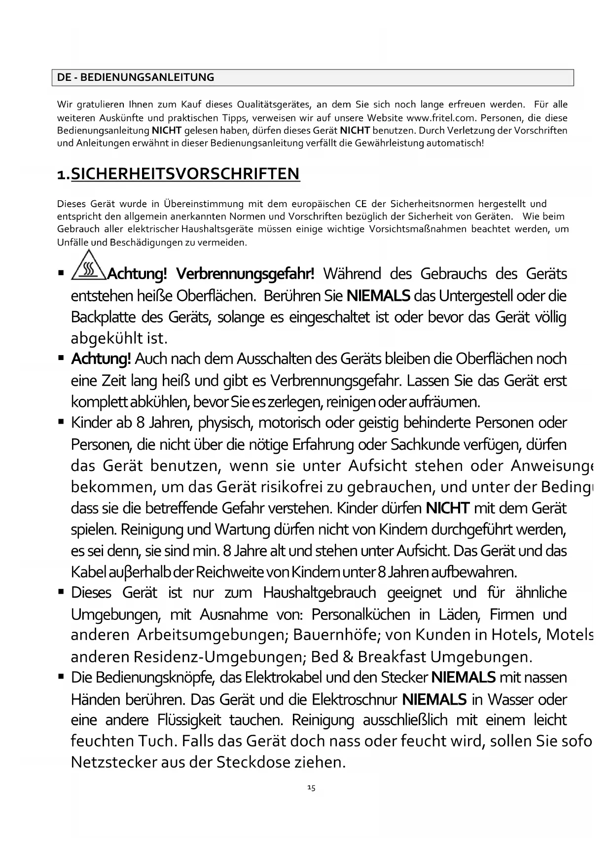 Wir gratulieren Ihnen zum Kauf dieses Qualitätsgerätes, an dem Sie sich noch lange erfreuen werden. Für alle weiteren Auskünfte und praktischen Tipps, verweisen wir auf unsere Website www.fritel.com. Personen, die diese Bedienungsanleitung NICHT gelesen haben, dürfen dieses Gerät NICHT benutzen. Durch Verletzung der Vorschriften und Anleitungen erwähnt in dieser Bedienungsanleitung verfällt die Gewährleistung automatisch! 1.SICHERHEITSVORSCHRIFTEN Dieses Gerät wurde in Übereinstimmung mit dem europäischen CE der Sicherheitsnormen hergestellt und entspricht den allgemein anerkannten Normen und Vorschriften bezüglich der Sicherheit von Geräten. Wie beim Gebrauch aller elektrischer Haushaltsgeräte müssen einige wichtige Vorsichtsmaßnahmen beachtet werden, um Unfälle und Beschädigungen zu vermeiden.