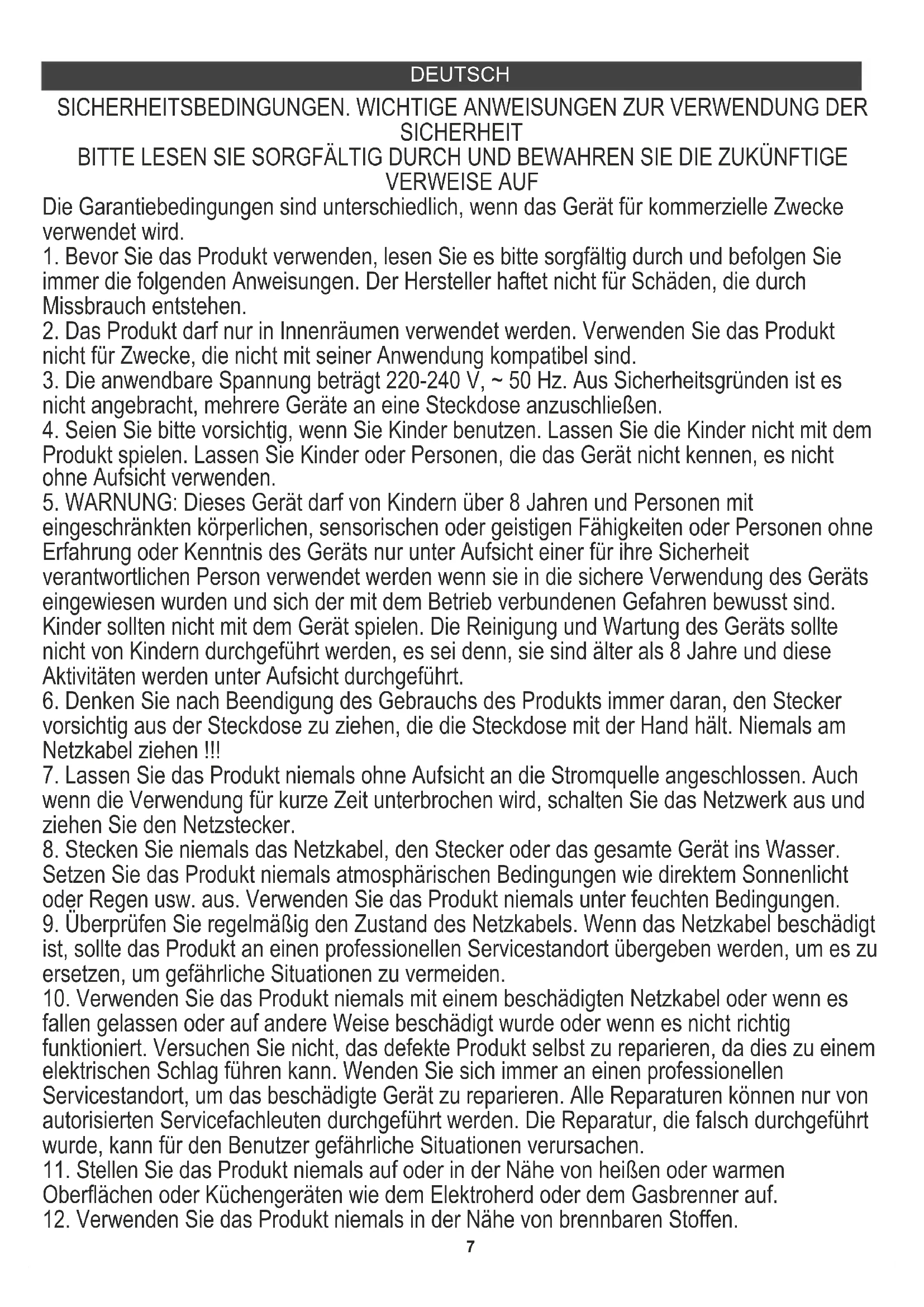 SICHERHEIT BITTE LESEN SIE SORGFÄLTIG DURCH UND BEWAHREN SIE DIE ZUKÜNFTIGE VERWEISE AUF Die Garantiebedingungen sind unterschiedlich, wenn das Gerät für kommerzielle Zwecke verwendet wird.