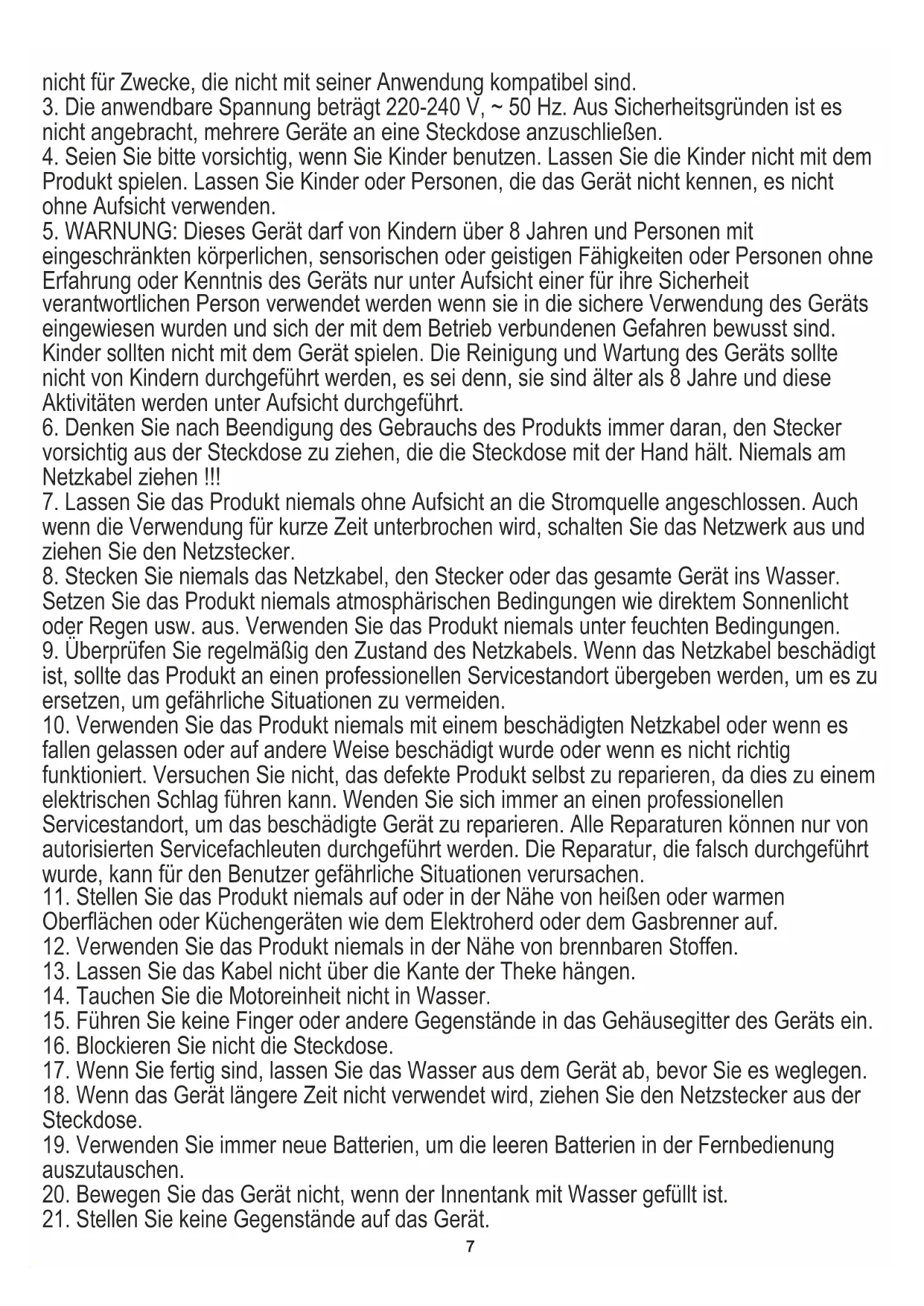 eingeschränkten körperlichen, sensorischen oder geistigen Fähigkeiten oder Personen ohne Erfahrung oder Kenntnis des Geräts nur unter Aufsicht einer für ihre Sicherheit verantwortlichen Person verwendet werden wenn sie in die sichere Verwendung des Geräts eingewiesen wurden und sich der mit dem Betrieb verbundenen Gefahren bewusst sind. Kinder sollten nicht mit dem Gerät spielen. Die Reinigung und Wartung des Geräts sollte nicht von Kindern durchgeführt werden, es sei denn, sie sind älter als 8 Jahre und diese Aktivitäten werden unter Aufsicht durchgeführt.