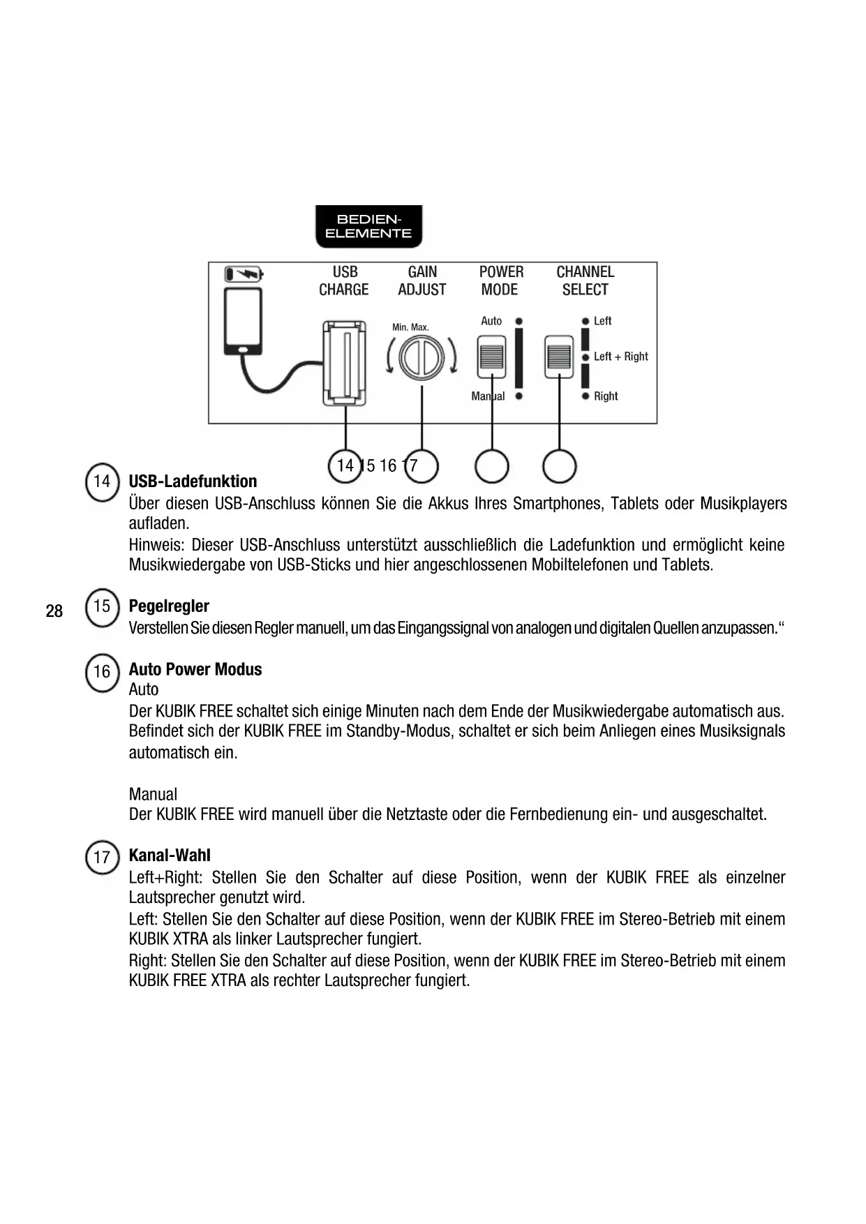 USB-Ladefunktion Über diesen USB-Anschluss können Sie die Akkus Ihres Smartphones, Tablets oder Musikplayers aufladen. Hinweis: Dieser USB-Anschluss unterstützt ausschließlich die Ladefunktion und ermöglicht keine Musikwiedergabe von USB-Sticks und hier angeschlossenen Mobiltelefonen und Tablets. Pegelregler Verstellen Sie diesen Regler manuell, um das Eingangssignal von analogen und digitalen Quellen anzupassen.“ Auto Power Modus Auto Der KUBIK FREE schaltet sich einige Minuten nach dem Ende der Musikwiedergabe automatisch aus. Befindet sich der KUBIK FREE im Standby-Modus, schaltet er sich beim Anliegen eines Musiksignals automatisch ein. Manual Der KUBIK FREE wird manuell über die Netztaste oder die Fernbedienung ein- und ausgeschaltet. Kanal-Wahl Left+Right: Stellen Sie den Schalter auf diese Position, wenn der KUBIK FREE als einzelner Lautsprecher genutzt wird. Left: Stellen Sie den Schalter auf diese Position, wenn der KUBIK FREE im Stereo-Betrieb mit einem KUBIK XTRA als linker Lautsprecher fungiert. Right: Stellen Sie den Schalter auf diese Position, wenn der KUBIK FREE im Stereo-Betrieb mit einem KUBIK FREE XTRA als rechter Lautsprecher fungiert.