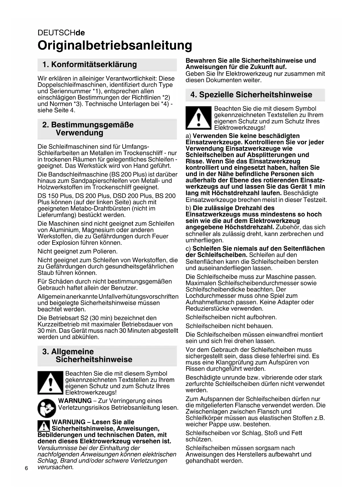 Originalbetriebsanleitung Wir erklären in alleiniger Verantwortlichkeit: Diese Doppelschleifmaschinen, identifiziert durch Type und Seriennummer *1), entsprechen allen einschlägigen Bestimmungen der Richtlinien *2) und Normen *3). Technische Unterlagen bei *4) - siehe Seite 4. Die Schleifmaschinen sind für Umfangs- Schleifarbeiten an Metallen im Trockenschliff - nur in trockenen Räumen für gelegentliches Schleifen - geeignet. Das Werkstück wird von Hand geführt. Die Bandschleifmaschine (BS 200 Plus) ist darüber hinaus zum Sandpapierschleifen von Metall- und Holzwerkstoffen im Trockenschliff geeignet. DS 150 Plus, DS 200 Plus, DSD 200 Plus, BS 200 Plus können (auf der linken Seite) auch mit geeigneten Metabo-Drahtbürsten (nicht im Lieferumfang) bestückt werden. Die Maschinen sind nicht geeignet zum Schleifen von Aluminium, Magnesium oder anderen Werkstoffen, die zu Gefährdungen durch Feuer oder Explosion führen können. Nicht geeignet zum Polieren. Nicht geeignet zum Schleifen von Werkstoffen, die zu Gefährdungen durch gesundheitsgefährlichen Staub führen können. Für Schäden durch nicht bestimmungsgemäßen Gebrauch haftet allein der Benutzer. Allgemein anerkannte Unfallverhütungsvorschriften und beigelegte Sicherheitshinweise müssen beachtet werden. Die Betriebsart S2 (30 min) bezeichnet den Kurzzeitbetrieb mit maximaler Betriebsdauer von 30 min. Das Gerät muss nach 30 Minuten abgestellt werden und abkühlen. Beachten Sie die mit diesem Symbol gekennzeichneten Textstellen zu Ihrem eigenen Schutz und zum Schutz Ihres Elektrowerkzeugs! WARNUNG – Zur Verringerung eines Verletzungsrisikos Betriebsanleitung lesen. WARNUNG – Lesen Sie alle Sicherheitshinweise, Anweisungen, Bebilderungen und technischen Daten, mit denen dieses Elektrowerkzeug versehen ist. Versäumnisse bei der Einhaltung der nachfolgenden Anweisungen können elektrischen Schlag, Brand und/oder schwere Verletzungen verursachen. Bewahren Sie alle Sicherheitshinweise und Anweisungen für die Zukunft auf. Geben Sie Ihr Elektrowerkzeug nur zusammen mit diesen Dokumenten weiter. Beachten Sie die mit diesem Symbol gekennzeichneten Textstellen zu Ihrem eigenen Schutz und zum Schutz Ihres Elektrowerkzeugs! a) Verwenden Sie keine beschädigten Einsatzwerkzeuge. Kontrollieren Sie vor jeder Verwendung Einsatzwerkzeuge wie Schleifscheiben auf Absplitterungen und Risse. Wenn Sie das Einsatzwerkzeug kontrolliert und eingesetzt haben, halten Sie und in der Nähe befindliche Personen sich außerhalb der Ebene des rotierenden Einsatz- werkzeugs auf und lassen Sie das Gerät 1 min lang mit Höchstdrehzahl laufen. Beschädigte Einsatzwerkzeuge brechen meist in dieser Testzeit. b) Die zulässige Drehzahl des Einsatzwerkzeugs muss mindestens so hoch sein wie die auf dem Elektrowerkzeug angegebene Höchstdrehzahl. Zubehör, das sich schneller als zulässig dreht, kann zerbrechen und umherfliegen. c) Schleifen Sie niemals auf den Seitenflächen der Schleifscheiben. Schleifen auf den Seitenflächen kann die Schleifscheiben bersten und auseinanderfliegen lassen. Die Schleifscheibe muss zur Maschine passen. Maximalen Schleifscheibendurchmesser sowie Schleifscheibendicke beachten. Der Lochdurchmesser muss ohne Spiel zum Aufnahmeflansch passen. Keine Adapter oder Reduzierstücke verwenden. Schleifscheiben nicht aufbohren. Schleifscheiben nicht behauen. Die Schleifscheiben müssen einwandfrei montiert sein und sich frei drehen lassen. Vor dem Gebrauch der Schleifscheiben muss sichergestellt sein, dass diese fehlerfrei sind. Es muss eine Klangprüfung zum Aufspüren von Rissen durchgeführt werden. Beschädigte unrunde bzw. vibrierende oder stark zerfurchte Schleifscheiben dürfen nicht verwendet werden. Zum Aufspannen der Schleifscheiben dürfen nur die mitgelieferten Flansche verwendet werden. Die Zwischenlagen zwischen Flansch und Schleifkörper müssen aus elastischen Stoffen z.B. weicher Pappe usw. bestehen. Schleifscheiben vor Schlag, Stoß und Fett schützen. Schleifscheiben müssen sorgsam nach Anweisungen des Herstellers aufbewahrt und gehandhabt werden.