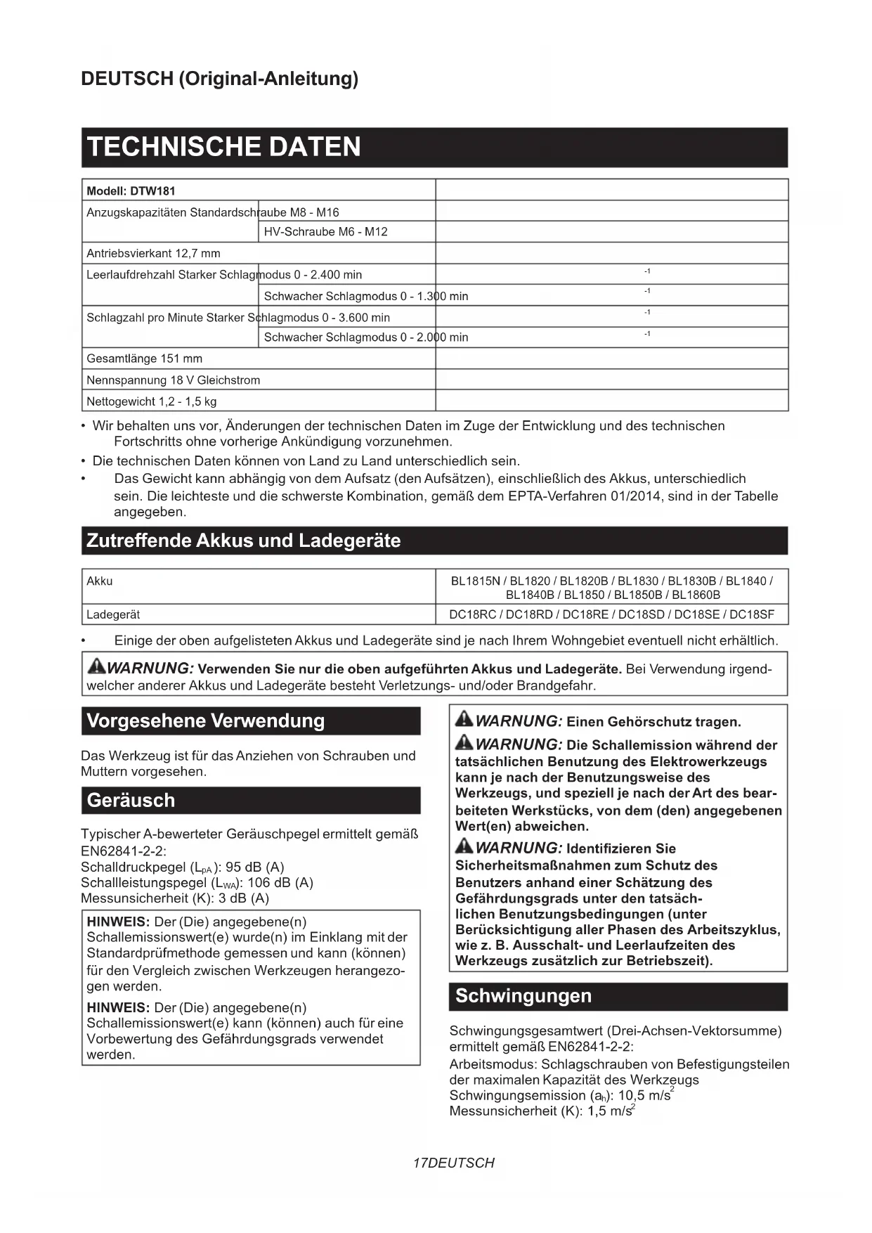 - EinigederobenaufgelistetenAkkusundLadegerätesindjenachIhremWohngebieteventuellnichterhältlich. WARNUNG: Verwenden Sie nur die oben aufgeführten Akkus und Ladegeräte. Bei Verwendung irgend- welcher anderer Akkus und Ladegeräte besteht Verletzungs- und/oder Brandgefahr. Vorgesehene Verwendung Das Werkzeug ist für das Anziehen von Schrauben und Muttern vorgesehen. Geräusch TypischerA-bewerteterGeräuschpegelermitteltgemäß EN62841-2-2: Schalldruckpegel(L