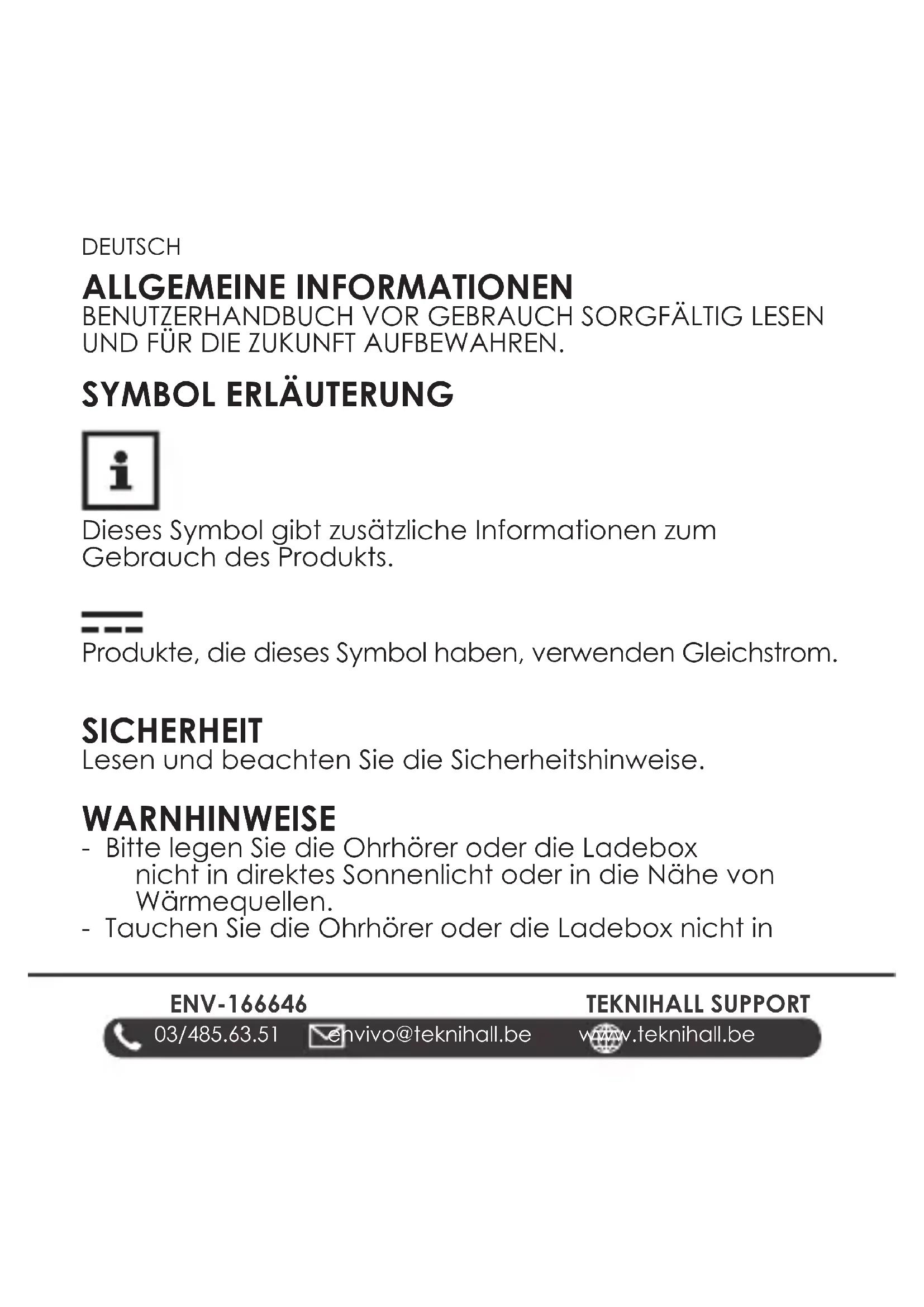 Dieses Symbol gibt zusätzliche Informationen zum Gebrauch des Produkts. Produkte, die dieses Symbol haben, verwenden Gleichstrom. SICHERHEIT Lesen und beachten Sie die Sicherheitshinweise. WARNHINWEISE - Bitte legen Sie die Ohrhörer oder die Ladebox nicht in direktes Sonnenlicht oder in die Nähe von Wärmequellen. - Tauchen Sie die Ohrhörer oder die Ladebox nicht inENV-1666 47 03/485.63.51 envivo@teknihall.be www.teknihall.be TEKNIHALL SUPPORT DEUTSCH Wasser ein, da dies zu Schäden führt. - Die Geräte (Ohrhörer und Ladebox) enthalten jeweils einen Akku. Lassen Sie die Geräte nicht in der Nähe von Flammen/eines Feuers liegen, da dies zu einer Explosion der Geräte führen kann. - Der Gewährleistungsumfang erlischt, wenn der Benutzer versucht, das Gerät eigenmächtig zu reparieren oder zu verändern. - Bitte verwenden Sie die Geräte nur für den Zweck, für die diese Geräte bestimmt sind und keinesfalls für andere Zwecke. - Enthält Kleinteile, die eine Erstickungsgefahr darstellen.