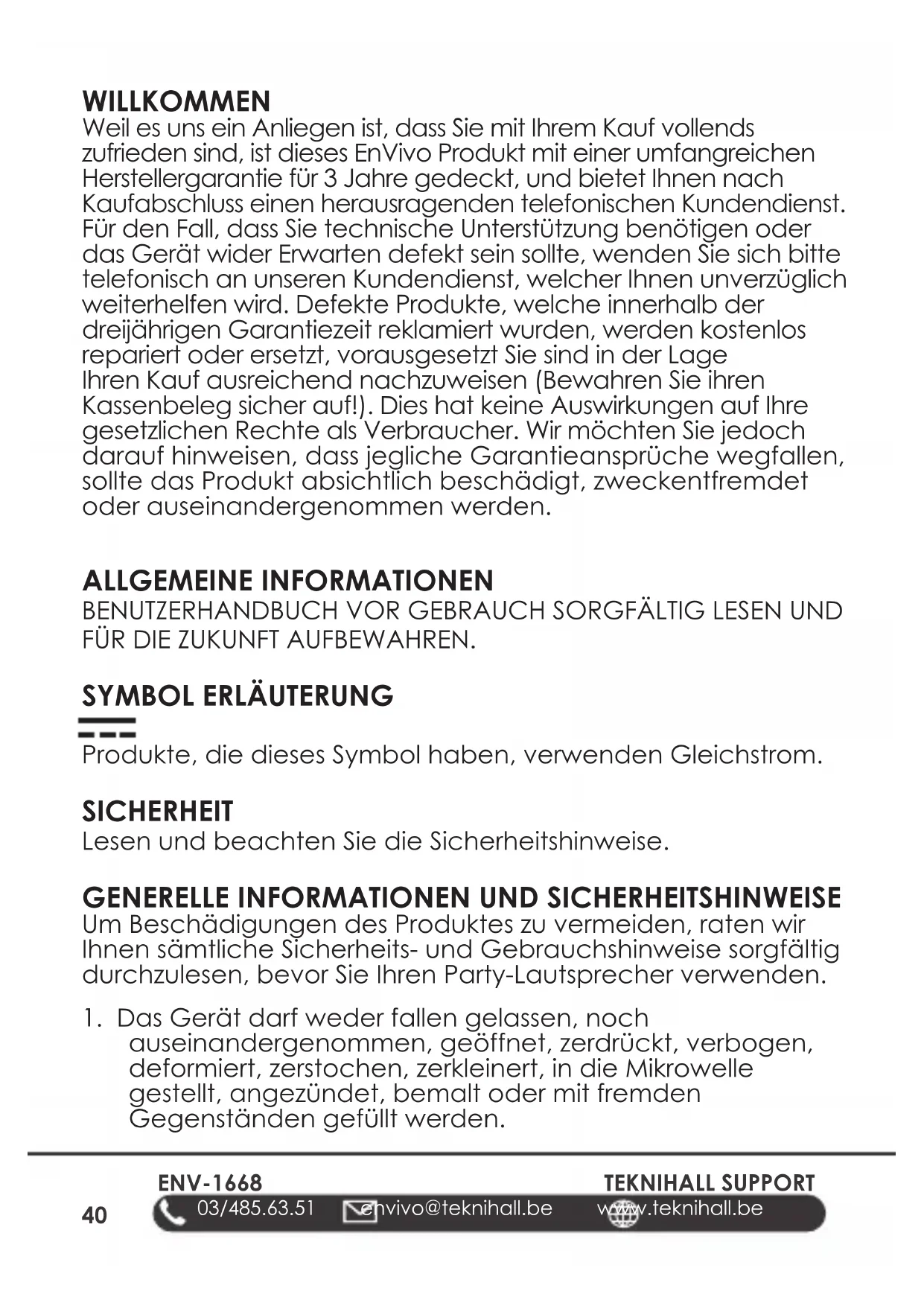 03/485.63.51 envivo@teknihall.be www.teknihall.be TEKNIHALL SUPPORT WILLKOMMEN Weil es uns ein Anliegen ist, dass Sie mit Ihrem Kauf vollends zufrieden sind, ist dieses EnVivo Produkt mit einer umfangreichen Herstellergarantie für 3 Jahre gedeckt, und bietet Ihnen nach Kaufabschluss einen herausragenden telefonischen Kundendienst. Für den Fall, dass Sie technische Unterstützung benötigen oder das Gerät wider Erwarten defekt sein sollte, wenden Sie sich bitte telefonisch an unseren Kundendienst, welcher Ihnen unverzüglich weiterhelfen wird. Defekte Produkte, welche innerhalb der dreijährigen Garantiezeit reklamiert wurden, werden kostenlos repariert oder ersetzt, vorausgesetzt Sie sind in der Lage Ihren Kauf ausreichend nachzuweisen (Bewahren Sie ihren Kassenbeleg sicher auf!). Dies hat keine Auswirkungen auf Ihre gesetzlichen Rechte als Verbraucher. Wir möchten Sie jedoch darauf hinweisen, dass jegliche Garantieansprüche wegfallen, sollte das Produkt absichtlich beschädigt, zweckentfremdet oder auseinandergenommen werden. ALLGEMEINE INFORMATIONEN BENUTZERHANDBUCH VOR GEBRAUCH SORGFÄLTIG LESEN UND FÜR DIE ZUKUNFT AUFBEWAHREN.