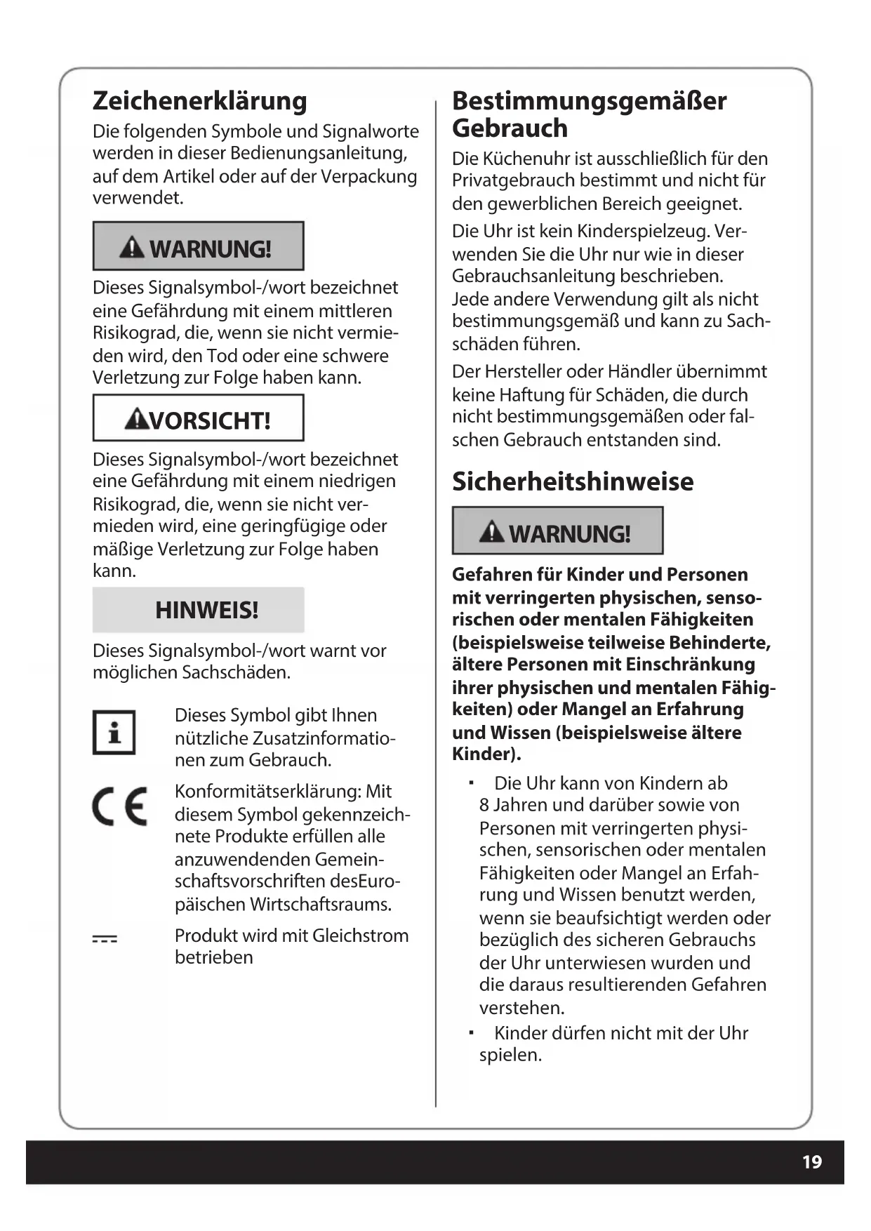 Zeichenerklärung Die folgenden Symbole und Signalworte werden in dieser Bedienungsanleitung, auf dem Artikel oder auf der Verpackung verwendet. WARNUNG! Dieses Signalsymbol-/wort bezeichnet eine Gefährdung mit einem mittleren Risikograd, die, wenn sie nicht vermie- den wird, den Tod oder eine schwere Verletzung zur Folge haben kann. VORSICHT! Dieses Signalsymbol-/wort bezeichnet eine Gefährdung mit einem niedrigen Risikograd, die, wenn sie nicht ver- mieden wird, eine geringfügige oder mäßige Verletzung zur Folge haben kann. HINWEIS! Dieses Signalsymbol-/wort warnt vor möglichen Sachschäden. Dieses Symbol gibt Ihnen nützliche Zusatzinformatio- nen zum Gebrauch. Konformitätserklärung: Mit diesem Symbol gekennzeich- nete Produkte erfüllen alle anzuwendenden Gemein- schaftsvorschriften desEuro- päischen Wirtschaftsraums. Produkt wird mit Gleichstrom betrieben Bestimmungsgemäßer Gebrauch Die Küchenuhr ist ausschließlich für den Privatgebrauch bestimmt und nicht für den gewerblichen Bereich geeignet. Die Uhr ist kein Kinderspielzeug. Ver- wenden Sie die Uhr nur wie in dieser Gebrauchsanleitung beschrieben. Jede andere Verwendung gilt als nicht bestimmungsgemäß und kann zu Sach- schäden führen. Der Hersteller oder Händler übernimmt keine Haftung für Schäden, die durch nicht bestimmungsgemäßen oder fal- schen Gebrauch entstanden sind. Sicherheitshinweise WARNUNG! Gefahren für Kinder und Personen mit verringerten physischen, senso- rischen oder mentalen Fähigkeiten (beispielsweise teilweise Behinderte, ältere Personen mit Einschränkung ihrer physischen und mentalen Fähig- keiten) oder Mangel an Erfahrung und Wissen (beispielsweise ältere Kinder). Die Uhr kann von Kindern ab 8Jahren und darüber sowie von Personen mit verringerten physi- schen, sensorischen oder mentalen Fähigkeiten oder Mangel an Erfah- rung und Wissen benutzt werden, wenn sie beaufsichtigt werden oder bezüglich des sicheren Gebrauchs der Uhr unterwiesen wurden und die daraus resultierenden Gefahren verstehen. Kinder dürfen nicht mit der Uhr spielen. Druckbuch BEL.indb 19Druckbuch BEL.indb 19 29.10.2020 12:50:3829.10.2020 12:50:3820 Reinigung und Benutzerwartung dürfen nicht von Kindern ohne Beaufsichtigung durchgeführt werden. Lassen Sie Kinder nicht mit Ver- packungsmaterial spielen sondern entsorgen sie es sofort. VORSICHT! Explosions- und Verätzungsgefahr! Unsachgemäßer Umgang mit der Batterie kann zu Verletzungen führen. Ersatz nur durch denselben oder gleichwertigen Typ (siehe „Techni- sche Daten“). Laden Sie Batterien nicht wieder auf und reaktivieren Sie Batterien nicht mit anderen Mitteln. Achten Sie beim Einlegen der Batterie auf die richtige Polarität
