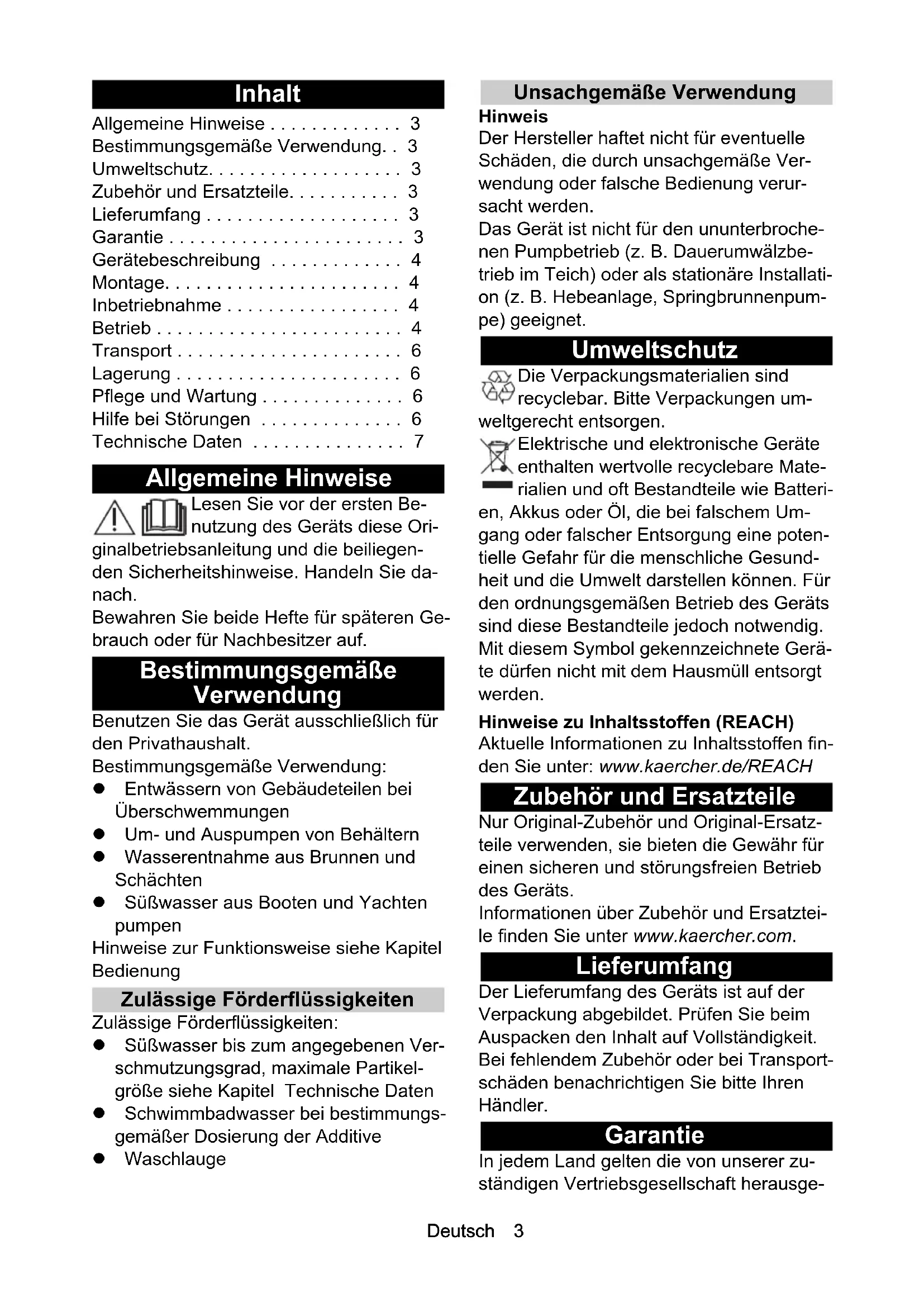 - Deutsch 3 English 8 Français 12 Italiano 17 Nederlands 22 Español 27 Português 32 Dansk 37 Norsk 41 Svenska 45 Suomi 50 Ελληνικά 54 Türkçe 59 Русский 63 Magyar 69 Čeština 74 Slovenščina 78 Polski 82 Româneşte 87 Slovenčina 92 Hrvatski 96 Srpski 101 Български 105 Eesti 110 Latviešu 115 Lietuviškai 119 Українська 124 Қазақша 129 中文 134 ﻪﻴﺑﺮﻌﻟا 138A B C D E F G H IDeutsch 3 Inhalt Allgemeine Hinweise Lesen Sie vor der ersten Be- nutzung des Geräts diese Ori- ginalbetriebsanleitung und die beiliegen- den Sicherheitshinweise. Handeln Sie da- nach. Bewahren Sie beide Hefte für späteren Ge- brauch oder für Nachbesitzer auf. Bestimmungsgemäße Verwendung Benutzen Sie das Gerät ausschließlich für den Privathaushalt. Bestimmungsgemäße Verwendung: Entwässern von Gebäudeteilen bei Überschwemmungen Um- und Auspumpen von Behältern Wasserentnahme aus Brunnen und Schächten Süßwasser aus Booten und Yachten pumpen Hinweise zur Funktionsweise siehe Kapitel Bedienung Zulässige Förderflüssigkeiten Zulässige Förderflüssigkeiten: Süßwasser bis zum angegebenen Ver- schmutzungsgrad, maximale Partikel- größe siehe Kapitel Technische Daten Schwimmbadwasser bei bestimmungs- gemäßer Dosierung der Additive Waschlauge Unsachgemäße Verwendung Hinweis Der Hersteller haftet nicht für eventuelle Schäden, die durch unsachgemäße Ver- wendung oder falsche Bedienung verur- sacht werden. Das Gerät ist nicht für den ununterbroche- nen Pumpbetrieb (z. B. Dauerumwälzbe- trieb im Teich) oder als stationäre Installati- on (z. B. Hebeanlage, Springbrunnenpum- pe) geeignet. Umweltschutz Die Verpackungsmaterialien sind recyclebar. Bitte Verpackungen um- weltgerecht entsorgen. Elektrische und elektronische Geräte enthalten wertvolle recyclebare Mate- rialien und oft Bestandteile wie Batteri- en, Akkus oder Öl, die bei falschem Um- gang oder falscher Entsorgung eine poten- tielle Gefahr für die menschliche Gesund- heit und die Umwelt darstellen können. Für den ordnungsgemäßen Betrieb des Geräts sind diese Bestandteile jedoch notwendig. Mit diesem Symbol gekennzeichnete Gerä- te dürfen nicht mit dem Hausmüll entsorgt werden. Hinweise zu Inhaltsstoffen (REACH) Aktuelle Informationen zu Inhaltsstoffen fin- den Sie unter: www.kaercher.de/REACH Zubehör und Ersatzteile Nur Original-Zubehör und Original-Ersatz- teile verwenden, sie bieten die Gewähr für einen sicheren und störungsfreien Betrieb des Geräts. Informationen über Zubehör und Ersatztei- le finden Sie unter www.kaercher.com. Lieferumfang Der Lieferumfang des Geräts ist auf der Verpackung abgebildet. Prüfen Sie beim Auspacken den Inhalt auf Vollständigkeit. Bei fehlendem Zubehör oder bei Transport- schäden benachrichtigen Sie bitte Ihren Händler. Garantie In jedem Land gelten die von unserer zu- ständigen Vertriebsgesellschaft herausge- Allgemeine Hinweise p. 3