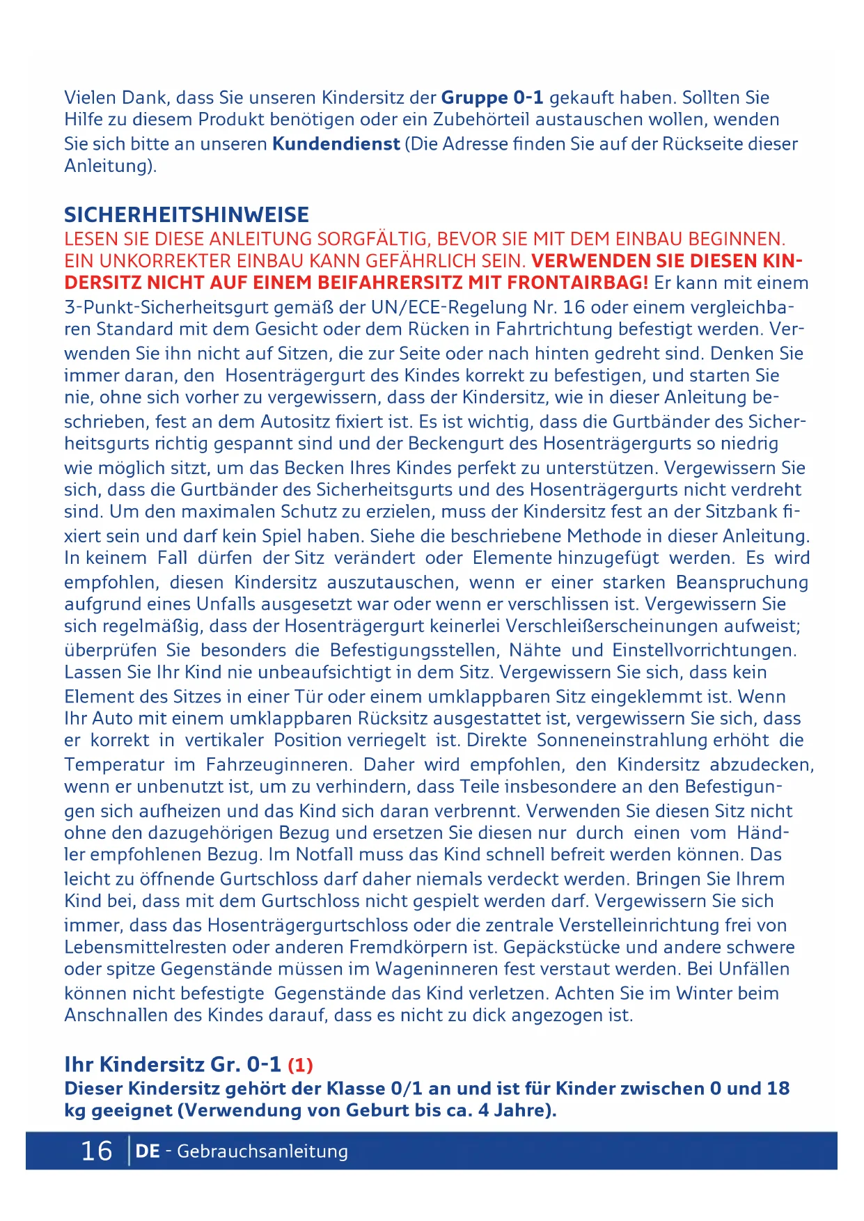 - If in doubt, contact the manufacturer or retailer of the restraint system.16 DE - Gebrauchsanleitung Vielen Dank, dass Sie unseren Kindersitz der Gruppe 0-1 gekauft haben. Sollten Sie Hilfe zu diesem Produkt benötigen oder ein Zubehörteil austauschen wollen, wenden Sie sich bitte an unseren Kundendienst (Die Adresse finden Sie auf der Rückseite dieser Anleitung). SICHERHEITSHINWEISE LESEN SIE DIESE ANLEITUNG SORGFÄLTIG, BEVOR SIE MIT DEM EINBAU BEGINNEN. EIN UNKORREKTER EINBAU KANN GEFÄHRLICH SEIN. VERWENDEN SIE DIESEN KIN- DERSITZ NICHT AUF EINEM BEIFAHRERSITZ MIT FRONTAIRBAG! Er kann mit einem 3-Punkt-Sicherheitsgurt gemäß der UN/ECE-Regelung Nr. 16 oder einem vergleichba- ren Standard mit dem Gesicht oder dem Rücken in Fahrtrichtung befestigt werden. Ver- wenden Sie ihn nicht auf Sitzen, die zur Seite oder nach hinten gedreht sind. Denken Sie immer daran, den Hosenträgergurt des Kindes korrekt zu befestigen, und starten Sie nie, ohne sich vorher zu vergewissern, dass der Kindersitz, wie in dieser Anleitung be- schrieben, fest an dem Autositz fixiert ist. Es ist wichtig, dass die Gurtbänder des Sicher- heitsgurts richtig gespannt sind und der Beckengurt des Hosenträgergurts so niedrig wie möglich sitzt, um das Becken Ihres Kindes perfekt zu unterstützen. Vergewissern Sie sich, dass die Gurtbänder des Sicherheitsgurts und des Hosenträgergurts nicht verdreht sind. Um den maximalen Schutz zu erzielen, muss der Kindersitz fest an der Sitzbank fi- xiert sein und darf kein Spiel haben. Siehe die beschriebene Methode in dieser Anleitung. In keinem Fall dürfen der Sitz verändert oder Elemente hinzugefügt werden. Es wird empfohlen, diesen Kindersitz auszutauschen, wenn er einer starken Beanspruchung aufgrund eines Unfalls ausgesetzt war oder wenn er verschlissen ist. Vergewissern Sie sich regelmäßig, dass der Hosenträgergurt keinerlei Verschleißerscheinungen aufweist; überprüfen Sie besonders die Befestigungsstellen, Nähte und Einstellvorrichtungen. Lassen Sie Ihr Kind nie unbeaufsichtigt in dem Sitz. Vergewissern Sie sich, dass kein Element des Sitzes in einer Tür oder einem umklappbaren Sitz eingeklemmt ist. Wenn Ihr Auto mit einem umklappbaren Rücksitz ausgestattet ist, vergewissern Sie sich, dass er korrekt in vertikaler Position verriegelt ist. Direkte Sonneneinstrahlung erhöht die Temperatur im Fahrzeuginneren. Daher wird empfohlen, den Kindersitz abzudecken, wenn er unbenutzt ist, um zu verhindern, dass Teile insbesondere an den Befestigun- gen sich aufheizen und das Kind sich daran verbrennt. Verwenden Sie diesen Sitz nicht ohne den dazugehörigen Bezug und ersetzen Sie diesen nur durch einen vom Händ- ler empfohlenen Bezug. Im Notfall muss das Kind schnell befreit werden können. Das leicht zu öffnende Gurtschloss darf daher niemals verdeckt werden. Bringen Sie Ihrem Kind bei, dass mit dem Gurtschloss nicht gespielt werden darf. Vergewissern Sie sich immer, dass das Hosenträgergurtschloss oder die zentrale Verstelleinrichtung frei von Lebensmittelresten oder anderen Fremdkörpern ist. Gepäckstücke und andere schwere oder spitze Gegenstände müssen im Wageninneren fest verstaut werden. Bei Unfällen können nicht befestigte Gegenstände das Kind verletzen. Achten Sie im Winter beim Anschnallen des Kindes darauf, dass es nicht zu dick angezogen ist. Ihr Kindersitz Gr. 0-1 (1) Dieser Kindersitz gehört der Klasse 0/1 an und ist für Kinder zwischen 0 und 18 kg geeignet (Verwendung von Geburt bis ca. 4 Jahre).17 Gebrauchsanleitung - DE