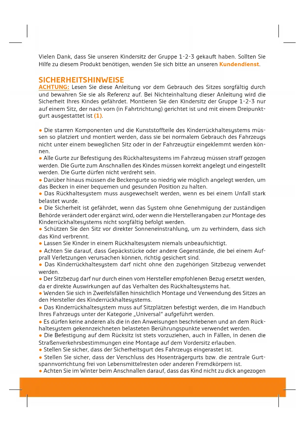 - Raadpleeg bij twijfel de fabrikant van het kinderzitje of uw kleinhandelaar.13 Gebrauchsanleitung - DE Vielen Dank, dass Sie unseren Kindersitz der Gruppe 1-2-3 gekauft haben. Sollten Sie Hilfe zu diesem Produkt benötigen, wenden Sie sich bitte an unseren Kundendienst. SICHERHEITSHINWEISE ACHTUNG: Lesen Sie diese Anleitung vor dem Gebrauch des Sitzes sorgfältig durch und bewahren Sie sie als Referenz auf. Bei Nichteinhaltung dieser Anleitung wird die Sicherheit Ihres Kindes gefährdet. Montieren Sie den Kindersitz der Gruppe 1-2-3 nur auf einem Sitz, der nach vorn (in Fahrtrichtung) gerichtet ist und mit einem Dreipunkt- gurt ausgestattet ist (1).