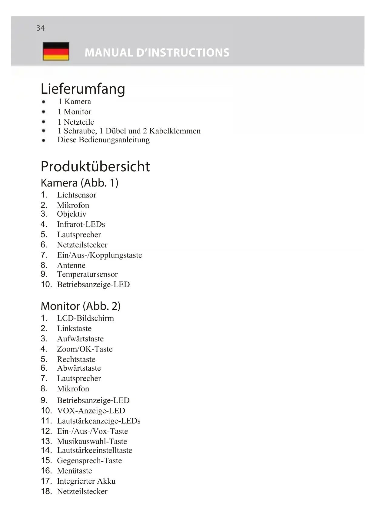 Lieferumfang 1 Kamera 1 Monitor 1 Netzteile 1 Schraube, 1 Dübel und 2 Kabelklemmen Diese Bedienungsanleitung Produktübersicht Kamera (Abb. 1)