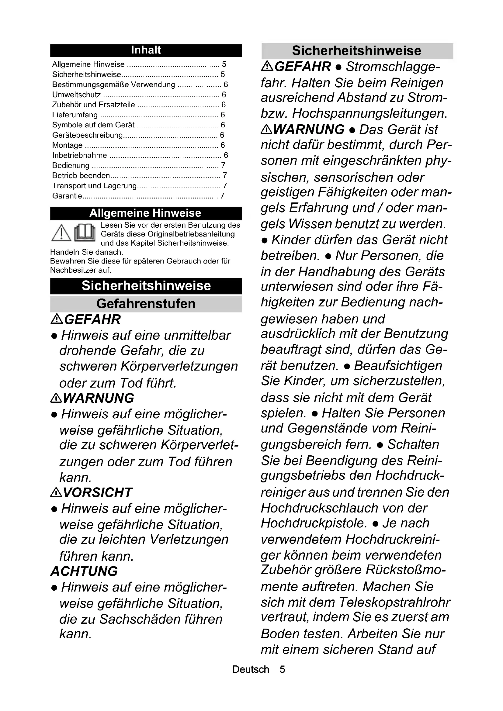- 93AB C D E F G H IJ KDeutsch 5 Inhalt Allgemeine Hinweise Lesen Sie vor der ersten Benutzung des Geräts diese Originalbetriebsanleitung und das Kapitel Sicherheitshinweise. Handeln Sie danach. Bewahren Sie diese für späteren Gebrauch oder für Nachbesitzer auf. Sicherheitshinweise Gefahrenstufen GEFAHR ● Hinweis auf eine unmittelbar drohende Gefahr, die zu schweren Körperverletzungen oder zum Tod führt. 몇 WARNUNG ● Hinweis auf eine möglicher- weise gefährliche Situation, die zu schweren Körperverlet- zungen oder zum Tod führen kann. 몇 VORSICHT ● Hinweis auf eine möglicher- weise gefährliche Situation, die zu leichten Verletzungen führen kann. ACHTUNG ● Hinweis auf eine möglicher- weise gefährliche Situation, die zu Sachschäden führen kann. Sicherheitshinweise GEFAHR ● Stromschlagge- fahr. Halten Sie beim Reinigen ausreichend Abstand zu Strom- bzw. Hochspannungsleitungen. 몇 WARNUNG ● Das Gerät ist nicht dafür bestimmt, durch Per- sonen mit eingeschränkten phy- sischen, sensorischen oder geistigen Fähigkeiten oder man- gels Erfahrung und / oder man- gels Wissen benutzt zu werden. ● Kinder dürfen das Gerät nicht betreiben. ● Nur Personen, die in der Handhabung des Geräts unterwiesen sind oder ihre Fä- higkeiten zur Bedienung nach- gewiesen haben und ausdrücklich mit der Benutzung beauftragt sind, dürfen das Ge- rät benutzen. ● Beaufsichtigen Sie Kinder, um sicherzustellen, dass sie nicht mit dem Gerät spielen. ● Halten Sie Personen und Gegenstände vom Reini- gungsbereich fern. ● Schalten Sie bei Beendigung des Reini- gungsbetriebs den Hochdruck- reiniger aus und trennen Sie den Hochdruckschlauch von der Hochdruckpistole. ● Je nach verwendetem Hochdruckreini- ger können beim verwendeten Zubehör größere Rückstoßmo- mente auftreten. Machen Sie sich mit dem Teleskopstrahlrohr vertraut, indem Sie es zuerst am Boden testen. Arbeiten Sie nur mit einem sicheren Stand auf Allgemeine Hinweise p. 5