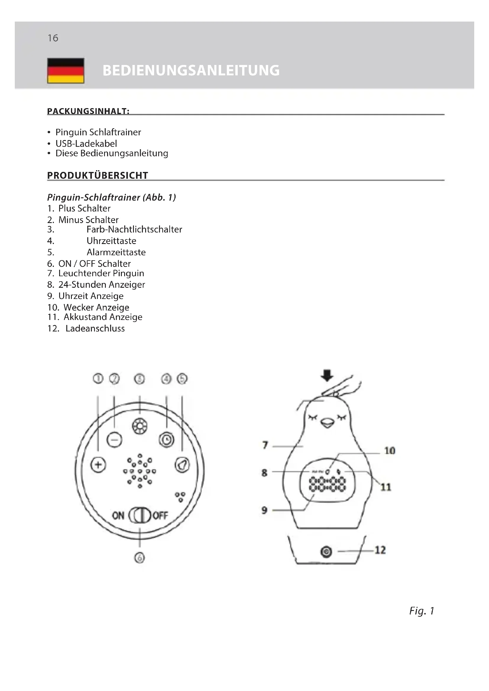 - Diese Bedienungsanleitung PRODUKTÜBERSICHT Pinguin-Schlaftrainer (Abb. 1)
