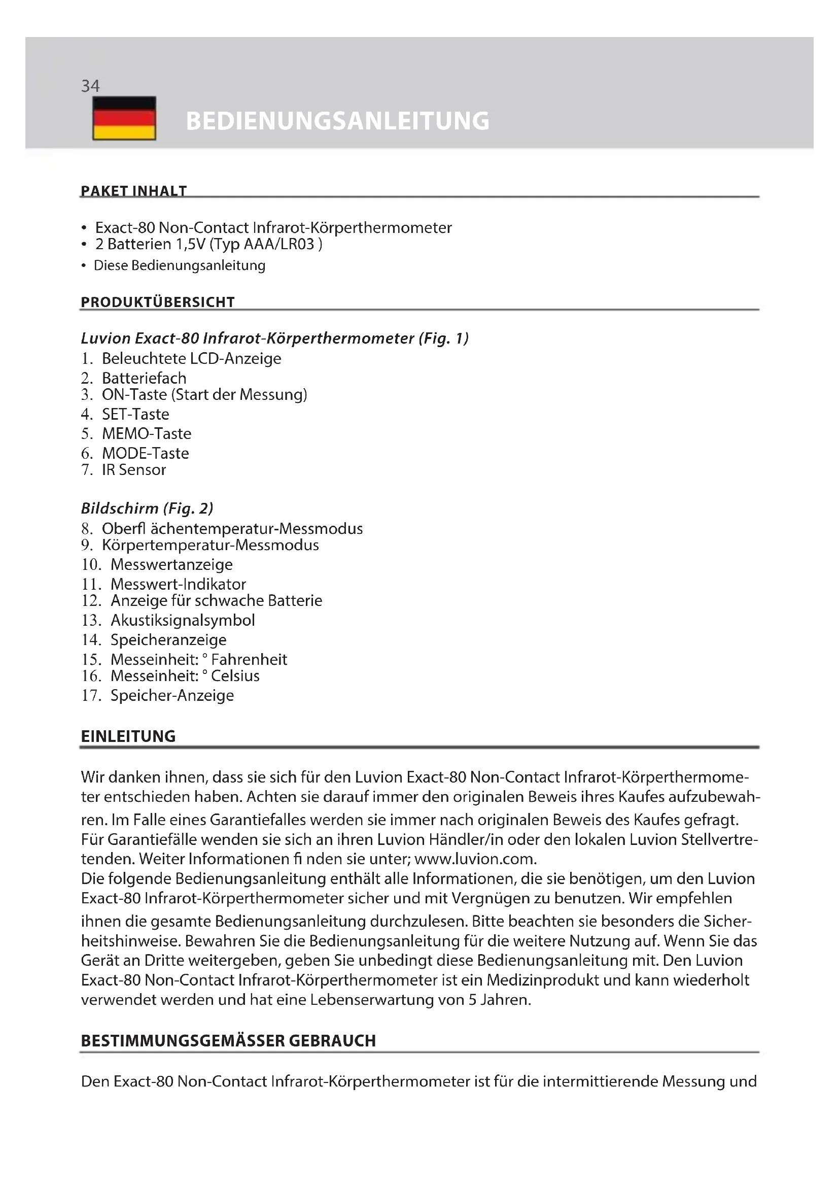 - Diese Bedienungsanleitung PRODUKTÜBERSICHT Luvion Exact-80 Infrarot-Körperthermometer (Fig. 1)