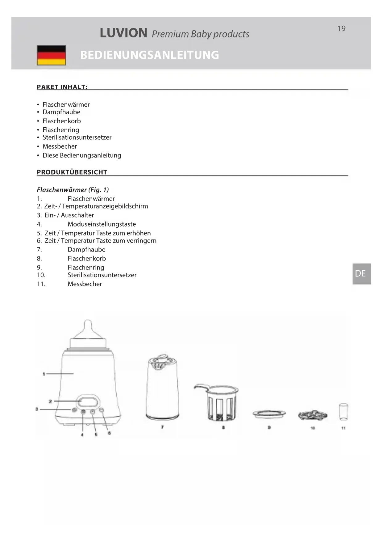 BEDIENUNGSANLEITUNG PAKET INHALT:• Flaschenwärmer • Dampfhaube • Flaschenkorb • Flaschenring• Sterilisationsuntersetzer • Messbecher • Diese BedienungsanleitungPRODUKTÜBERSICHTFlaschenwärmer (Fig. 1)1. Flaschenwärmer2. Zeit- / Temperaturanzeigebildschirm3. Ein- / Ausschalter4. Moduseinstellungstaste5. Zeit / Temperatur Taste zum erhöhen6. Zeit / Temperatur Taste zum verringern7. Dampfhaube8. Flaschenkorb9. Flaschenring10. Sterilisationsuntersetzer 11. Messbecher20 EINLEITUNG Wir danken ihnen, dass sie sich für den Luvion Eco Fast Delux Flaschenwärmer entschieden ha- ben. Achten sie darauf immer den originalen Beweis ihres Kaufes aufzubewahren. Im Falle eines Garantiefalles werden sie immer nach originalen Beweis des Kaufes gefragt. Für Garantiefälle wenden sie sich an ihren Luvion Händler/in oder den lokalen Luvion Stellvertretenden. Weiter Informationen nden sie unter; www.luvion.com. Die folgende Bedienungsanleitung enthält alle Informationen, die sie benötigen, um den Luvion Eco Fast Deluxe Flaschenwärmer sicher und mit Vergnügen zu benutzen. Wir empfehlen ihnen die gesamte Bedienungsanleitung durchzulesen. Bitte beachten sie besonders die Sicherheit- shinweise. Achtung! ATTENTION!