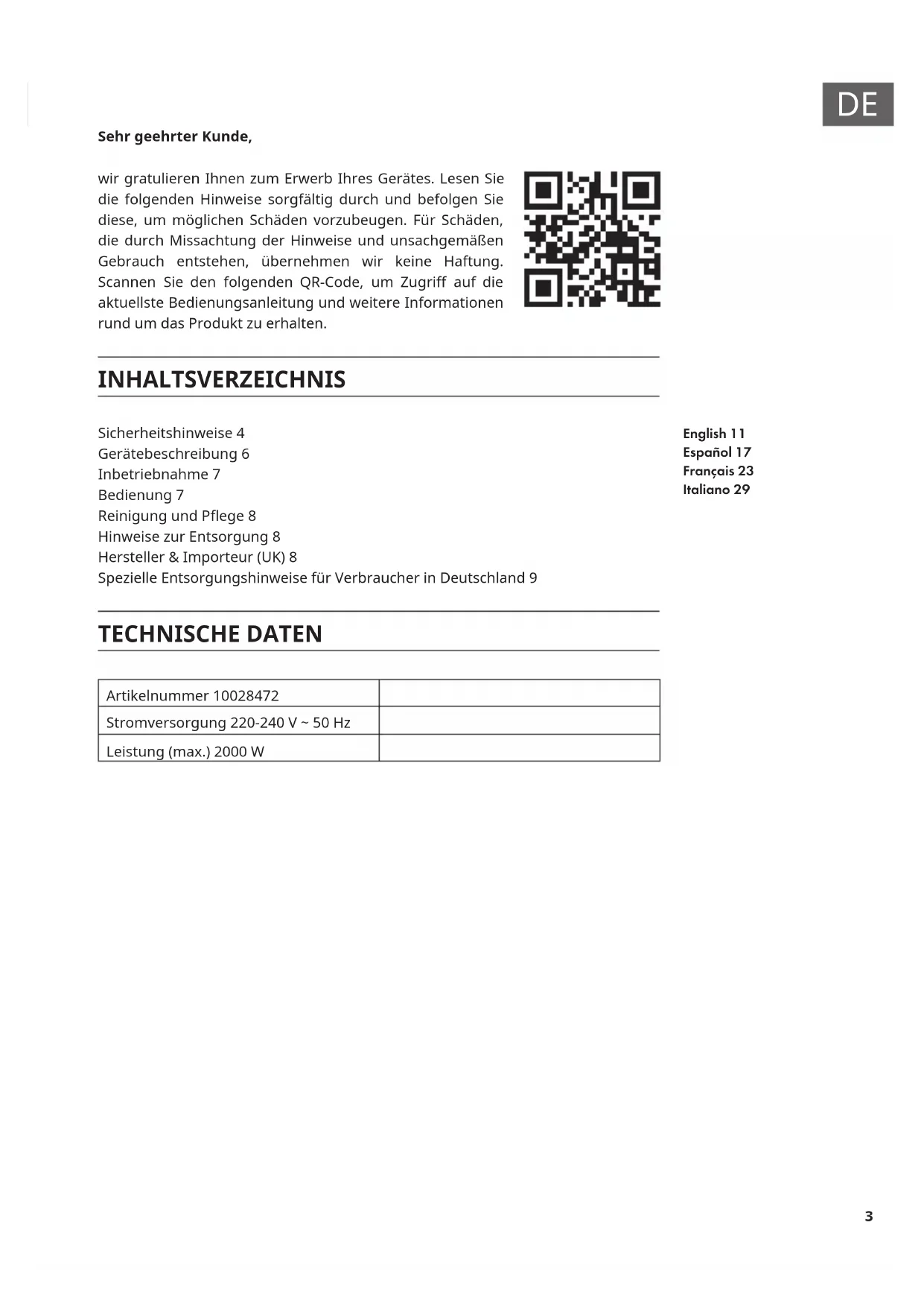 Sehr geehrter Kunde, wir gratulieren Ihnen zum Erwerb Ihres Gerätes. Lesen Sie die folgenden Hinweise sorgfältig durch und befolgen Sie diese, um möglichen Schäden vorzubeugen. Für Schäden, die durch Missachtung der Hinweise und unsachgemäßen Gebrauch entstehen, übernehmen wir keine Haftung. Scannen Sie den folgenden QR-Code, um Zugri auf die aktuellste Bedienungsanleitung und weitere Informationen rund um das Produkt zu erhalten. INHALTSVERZEICHNIS Sicherheitshinweise 4 Gerätebeschreibung 6 Inbetriebnahme 7 Bedienung 7 Reinigung und Pege 8 Hinweise zur Entsorgung 8 Hersteller & Importeur (UK) 8 Spezielle Entsorgungshinweise für Verbraucher in Deutschland 9 TECHNISCHE DATEN Artikelnummer 10028472 Stromversorgung 220-240 V ~ 50 Hz Leistung (max.) 2000 W English 11 Español 17 Français 23 Italiano 294