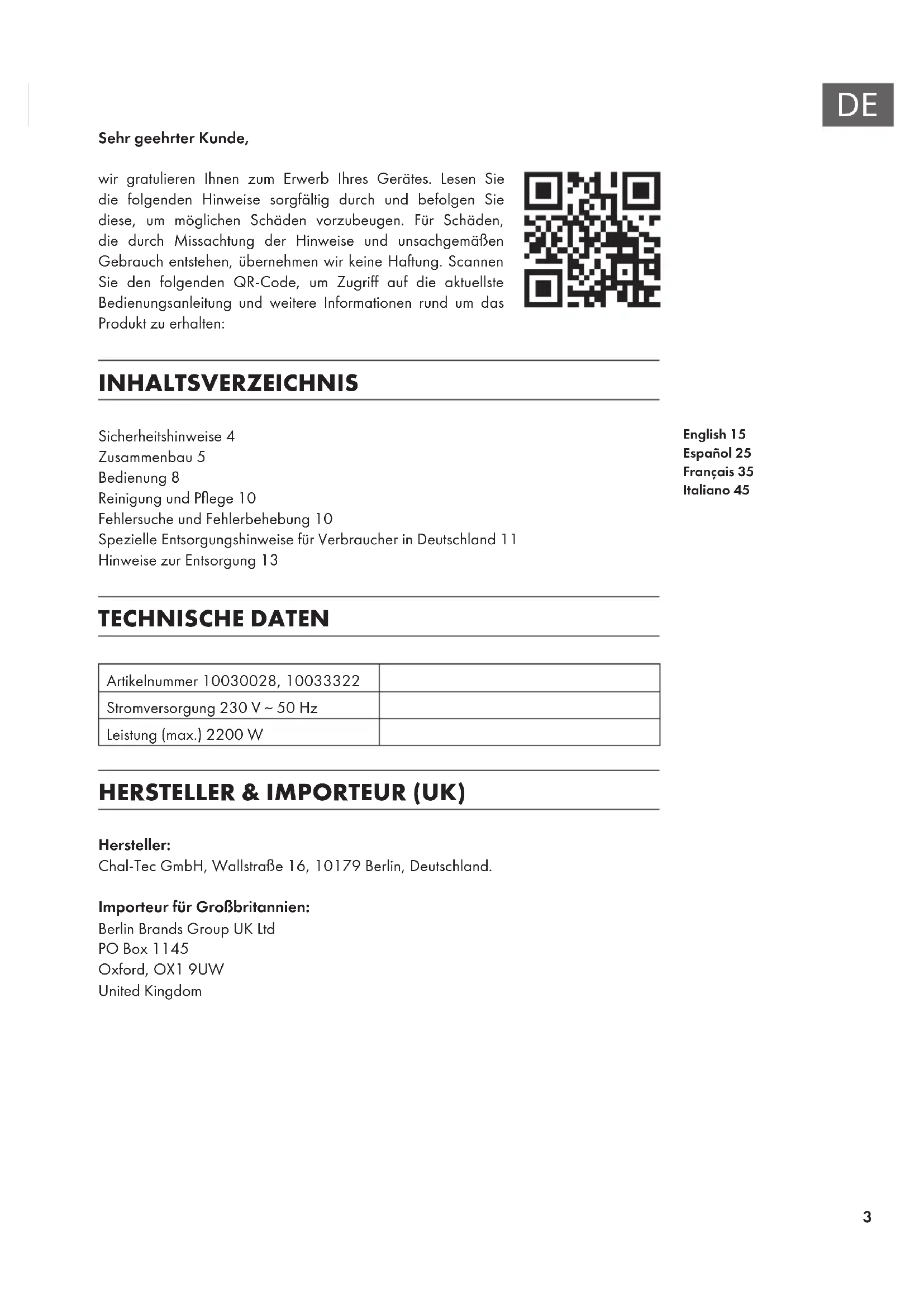 Sehr geehrter Kunde, wir gratulieren Ihnen zum Erwerb Ihres Gerätes. Lesen Sie die folgenden Hinweise sorgfältig durch und befolgen Sie diese, um möglichen Schäden vorzubeugen. Für Schäden, die durch Missachtung der Hinweise und unsachgemäßen Gebrauch entstehen, übernehmen wir keine Haftung. Scannen Sie den folgenden QR-Code, um Zugriff auf die aktuellste Bedienungsanleitung und weitere Informationen rund um das Produkt zu erhalten: INHALTSVERZEICHNIS Sicherheitshinweise4 Zusammenbau5 Bedienung8 Reinigung und Pege10 Fehlersuche und Fehlerbehebung10 Spezielle Entsorgungshinweise für Verbraucher in Deutschland11 Hinweise zur Entsorgung13 TECHNISCHE DATEN Artikelnummer 10030028, 10033322 Stromversorgung 230 V ~ 50 Hz Leistung (max.) 2200 W HERSTELLER & IMPORTEUR (UK) Hersteller: Chal-Tec GmbH, Wallstraße 16, 10179 Berlin, Deutschland. Importeur für Großbritannien: Berlin Brands Group UK Ltd PO Box 1145 Oxford, OX1 9UW United Kingdom English 15 Español 25 Français 35 Italiano 454