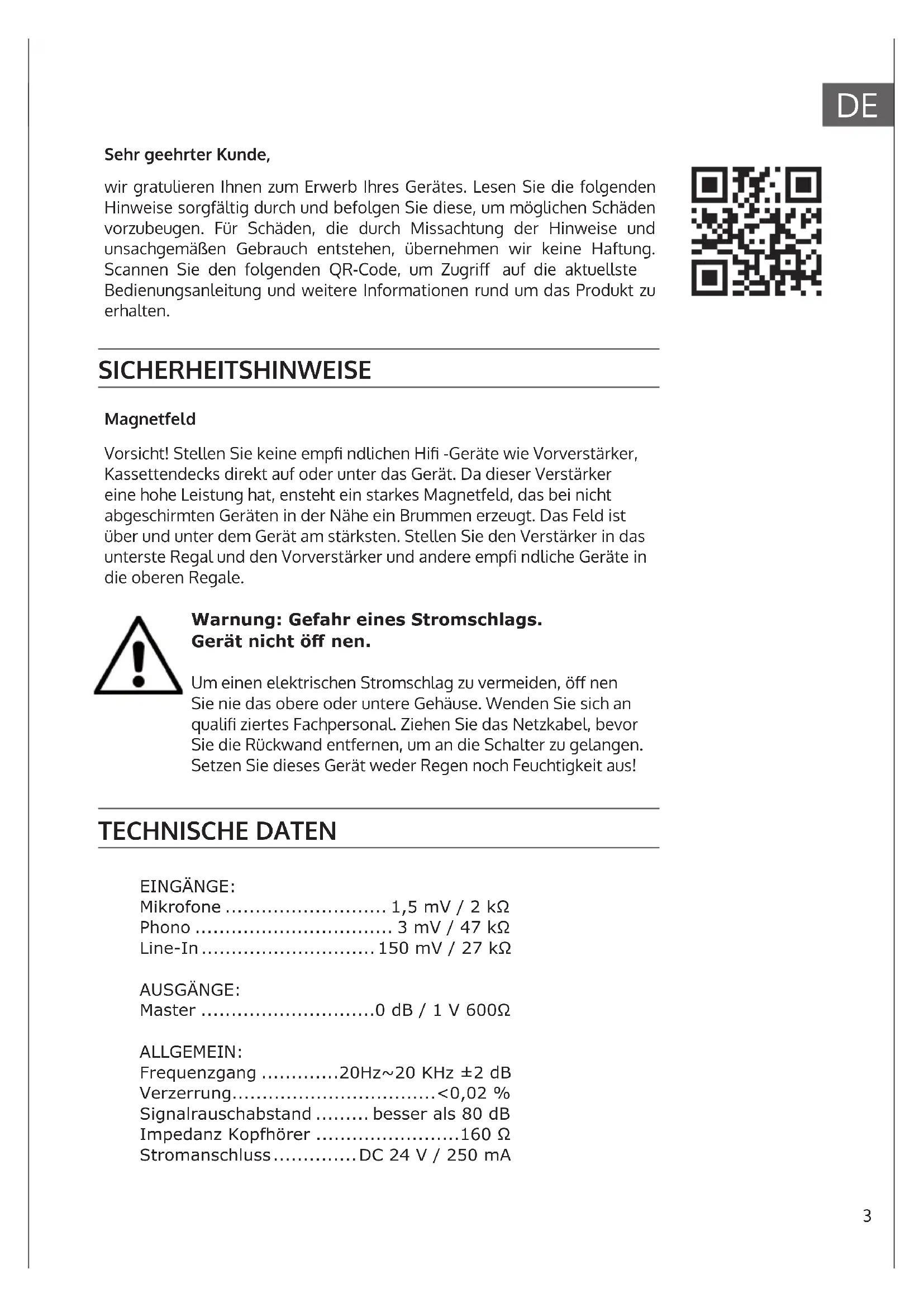 Sehr geehrter Kunde, wir gratulieren Ihnen zum Erwerb Ihres Gerätes. Lesen Sie die folgenden Hinweise sorgfältig durch und befolgen Sie diese, um möglichen Schäden vorzubeugen. Für Schäden, die durch Missachtung der Hinweise und unsachgemäßen Gebrauch entstehen, übernehmen wir keine Haftung. Scannen Sie den folgenden QR-Code, um Zugri auf die aktuellste Bedienungsanleitung und weitere Informationen rund um das Produkt zu erhalten. SICHERHEITSHINWEISE Magnetfeld Vorsicht! Stellen Sie keine emp ndlichen Hi -Geräte wie Vorverstärker, Kassettendecks direkt auf oder unter das Gerät. Da dieser Verstärker eine hohe Leistung hat, ensteht ein starkes Magnetfeld, das bei nicht abgeschirmten Geräten in der Nähe ein Brummen erzeugt. Das Feld ist über und unter dem Gerät am stärksten. Stellen Sie den Verstärker in das unterste Regal und den Vorverstärker und andere emp ndliche Geräte in die oberen Regale. Warnung: Gefahr eines Stromschlags. Gerät nicht öff nen. Um einen elektrischen Stromschlag zu vermeiden, ö nen Sie nie das obere oder untere Gehäuse. Wenden Sie sich an quali ziertes Fachpersonal. Ziehen Sie das Netzkabel, bevor Sie die Rückwand entfernen, um an die Schalter zu gelangen. Setzen Sie dieses Gerät weder Regen noch Feuchtigkeit aus! TECHNISCHE DATEN EINGÄNGE: Mikrofone ........................... 1,5 mV / 2 kΩ Phono ................................. 3 mV / 47 kΩ Line-In ............................. 150 mV / 27 kΩ AUSGÄNGE: Master .............................0 dB / 1 V 600Ω ALLGEMEIN: Frequenzgang .............20Hz~20 KHz ±2 dB Verzerrung..................................<0,02 % Signalrauschabstand ......... besser als 80 dB Impedanz Kopfhörer ........................160 Ω Stromanschluss .............. DC 24 V / 250 mA4