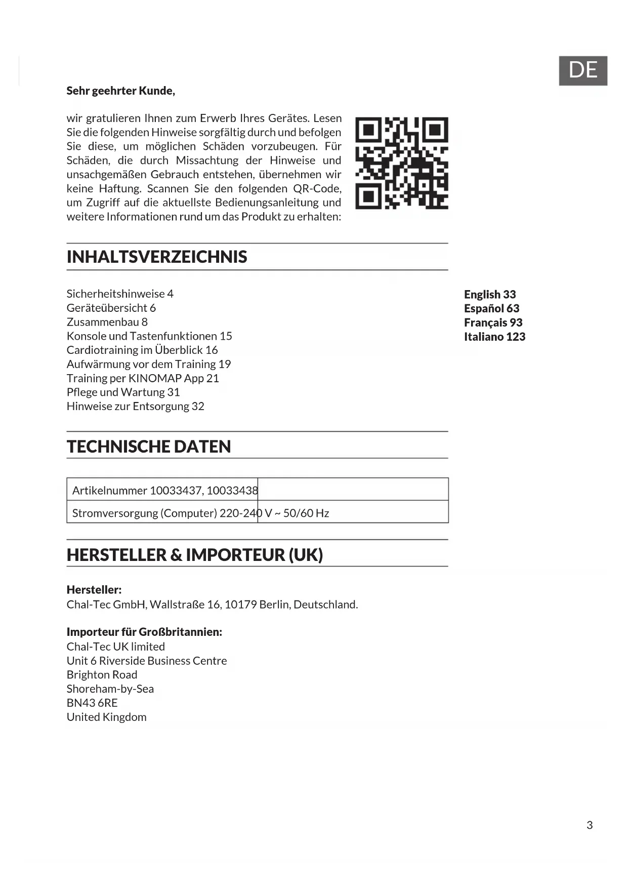 English 33 Español 63 Français 93 Italiano 123 Sehr geehrter Kunde, wir gratulieren Ihnen zum Erwerb Ihres Gerätes. Lesen Sie die folgenden Hinweise sorgfältig durch und befolgen Sie diese, um möglichen Schäden vorzubeugen. Für Schäden, die durch Missachtung der Hinweise und unsachgemäßen Gebrauch entstehen, übernehmen wir keine Haftung. Scannen Sie den folgenden QR-Code, um Zugriff auf die aktuellste Bedienungsanleitung und weitere Informationen rund um das Produkt zu erhalten: INHALTSVERZEICHNIS Sicherheitshinweise 4 Geräteübersicht 6 Zusammenbau 8 Konsole und Tastenfunktionen 15 Cardiotraining im Überblick 16 Aufwärmung vor dem Training 19 Training per KINOMAP App 21 Pege und Wartung 31 Hinweise zur Entsorgung 32 TECHNISCHE DATEN Artikelnummer 10033437, 10033438 Stromversorgung (Computer) 220-240 V ~ 50/60 Hz HERSTELLER & IMPORTEUR (UK) Hersteller: Chal-Tec GmbH, Wallstraße 16, 10179 Berlin, Deutschland. Importeur für Großbritannien: Chal-Tec UK limited Unit 6 Riverside Business Centre Brighton Road Shoreham-by-Sea BN43 6RE United Kingdom4