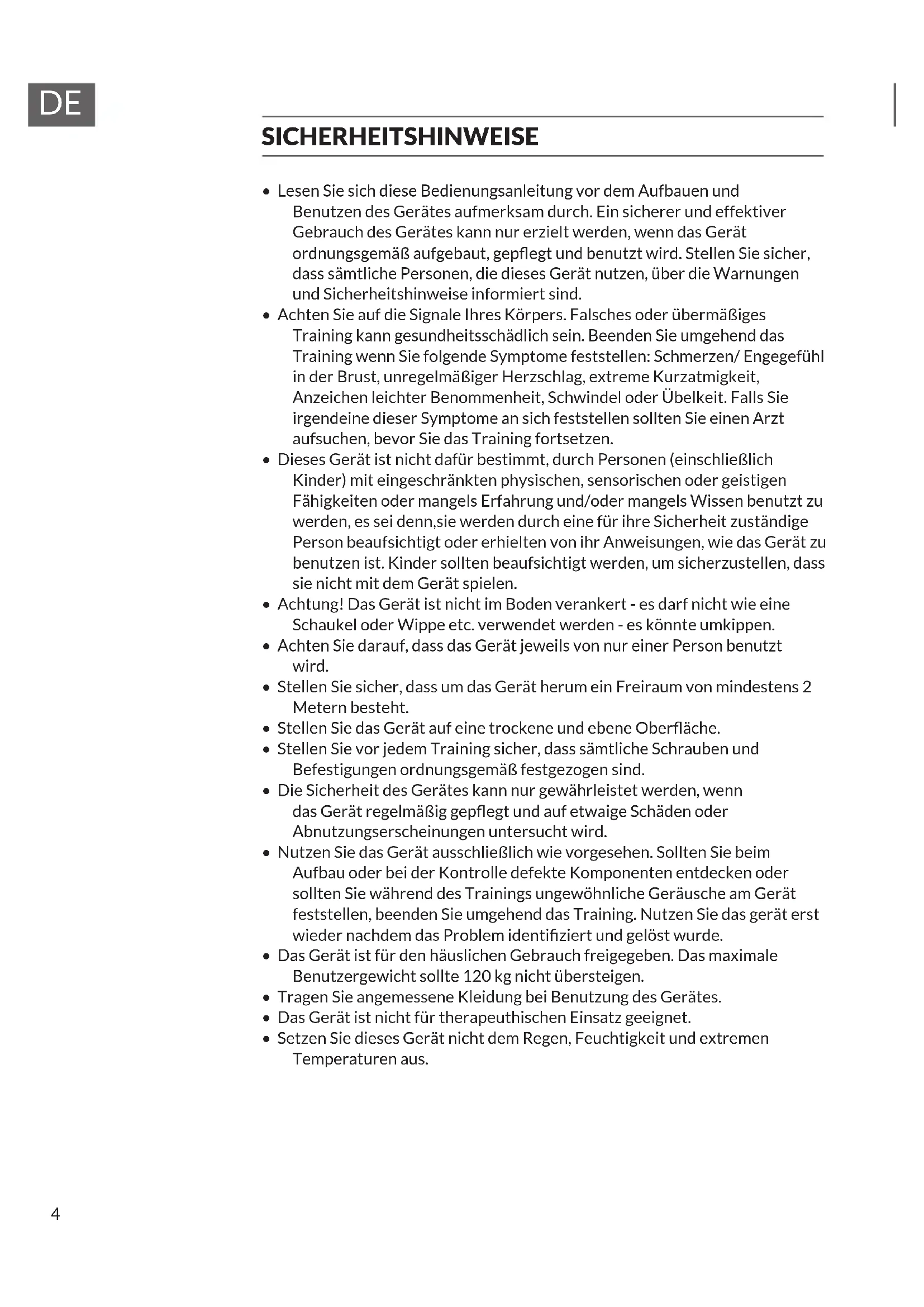 - Stellen Sie vor jedem Training sicher, dass sümttliche Schrauben und Befestigungen ordnungsgemäß festgezogen sind.