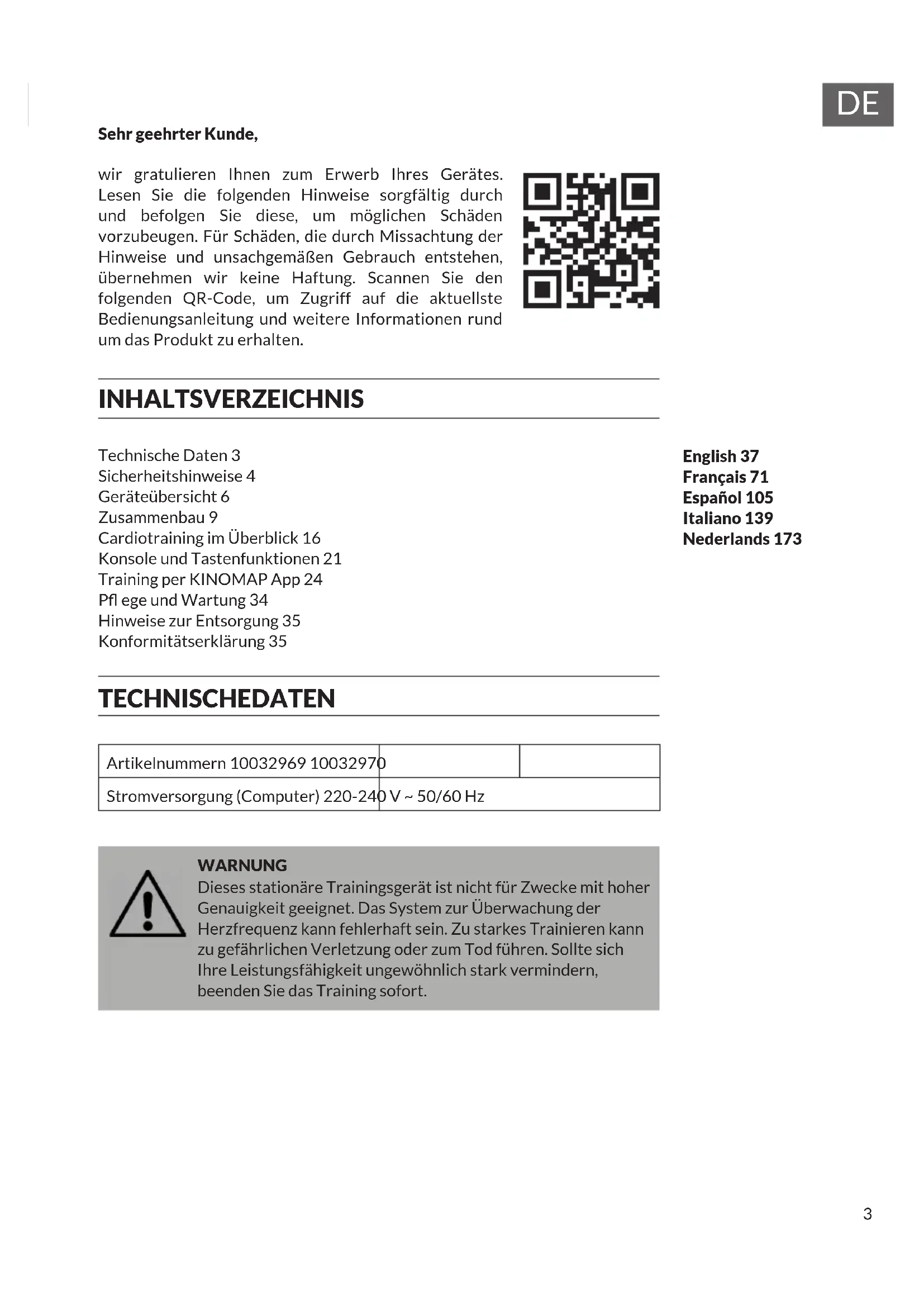 English 37 Français 71 Español 105 Italiano 139 Nederlands 173 Technische Daten 3 Sicherheitshinweise 4 Geräteübersicht 6 Zusammenbau 9 Cardiotraining im Überblick 16 Konsole und Tastenfunktionen 21 Training per KINOMAP App 24 P ege und Wartung 34 Hinweise zur Entsorgung 35 Konformitätserklärung 35 TECHNISCHE DATEN Artikelnummern 10032969 10032970 Stromversorgung (Computer) 220-240 V ~ 50/60 Hz WARNUNG Dieses stationäre Trainingsgerät ist nicht für Zwecke mit hoher Genauigkeit geeignet. Das System zur Überwachung der Herzfrequenz kann fehlerhaft sein. Zu starkes Trainieren kann zu gefährlichen Verletzung oder zum Tod führen. Sollte sich Ihre Leistungsfähigkeit ungewöhnlich stark vermindern, beenden Sie das Training sofort. Sehr geehrter Kunde, wir gratulieren Ihnen zum Erwerb Ihres Gerätes. Lesen Sie die folgenden Hinweise sorgfältig durch und befolgen Sie diese, um möglichen Schäden vorzubeugen. Für Schäden, die durch Missachtung der Hinweise und unsachgemäßen Gebrauch entstehen, übernehmen wir keine Haftung. Scannen Sie den folgenden QR-Code, um Zugriff auf die aktuellste Bedienungsanleitung und weitere Informationen rund um das Produkt zu erhalten. INHALTSVERZEICHNIS4
