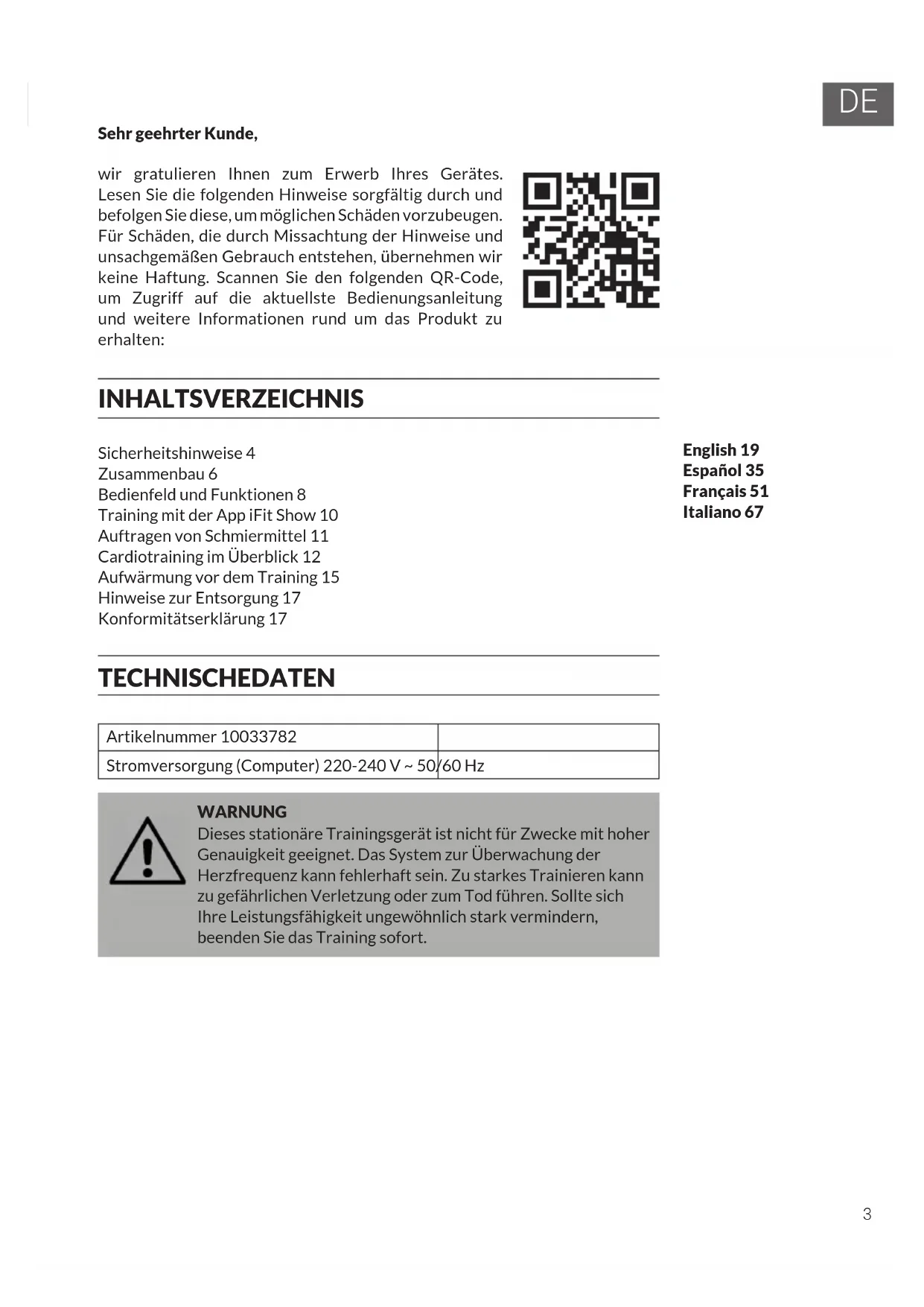 English 19 Español 35 Français 51 Italiano 67 Sehr geehrter Kunde, wir gratulieren Ihnen zum Erwerb Ihres Gerätes. Lesen Sie die folgenden Hinweise sorgfältig durch und befolgen Sie diese, um möglichen Schäden vorzubeugen. Für Schäden, die durch Missachtung der Hinweise und unsachgemäßen Gebrauch entstehen, übernehmen wir keine Haftung. Scannen Sie den folgenden QR-Code, um Zugriff auf die aktuellste Bedienungsanleitung und weitere Informationen rund um das Produkt zu erhalten: INHALTSVERZEICHNIS Sicherheitshinweise 4 Zusammenbau 6 Bedienfeld und Funktionen 8 Training mit der App iFit Show 10 Auftragen von Schmiermittel 11 Cardiotraining im Überblick 12 Aufwärmung vor dem Training 15 Hinweise zur Entsorgung 17 Konformitätserklärung 17 TECHNISCHE DATEN Artikelnummer 10033782 Stromversorgung (Computer) 220-240 V ~ 50/60 Hz WARNUNG Dieses stationäre Trainingsgerät ist nicht für Zwecke mit hoher Genauigkeit geeignet. Das System zur Überwachung der Herzfrequenz kann fehlerhaft sein. Zu starkes Trainieren kann zu gefährlichen Verletzung oder zum Tod führen. Sollte sich Ihre Leistungsfähigkeit ungewöhnlich stark vermindern, beenden Sie das Training sofort.4