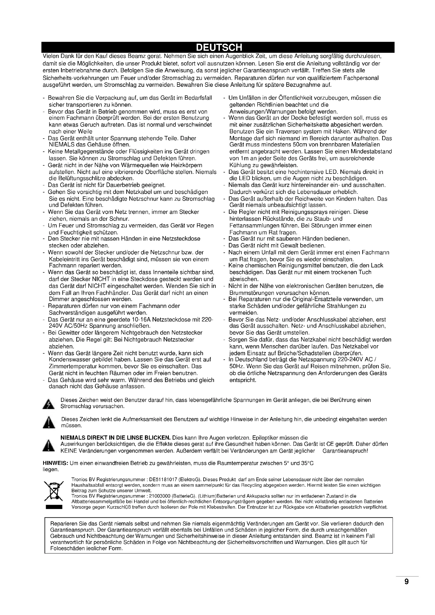 Reinig de machine in een goed geventileerde ruimte!9 DEUTSCH Vielen Dank für den Kauf dieses Beamz gerat. Nehmen Sie sich einen Augenblick Zeit, um diese Anleitung sorgfältig durchzulesen, damit sie die Möglichkeiten, die unser Produkt bietet, sofort voll ausnutzen können. Lesen Sie erst die Anleitung vollständig vor der ersten Inbetriebnahme durch. Befolgen Sie die Anweisung, da sonst jeglicher Garantieanspruch verfällt. Treffen Sie stets alle Sicherheits-vorkehrungen um Feuer und/oder Stromschlag zu vermeiden. Reparaturen dürfen nur von qualifiziertem Fachpersonal ausgeführt werden, um Stromschlag zu vermeiden. Bewahren Sie diese Anleitung für spätere Bezugnahme auf. - Bewahren Sie die Verpackung auf, um das Gerät im Bedarfsfall sicher transportieren zu können. - Bevor das Gerät in Betrieb genommen wird, muss es erst von einem Fachmann überprüft werden. Bei der ersten Benutzung kann etwas Geruch auftreten. Das ist normal und verschwindet nach einer Weile - Das Gerät enthält unter Spannung stehende Teile. Daher NIEMALS das Gehäuse öffnen. - Keine Metallgegenstände oder Flüssigkeiten ins Gerät dringen lassen. Sie können zu Stromschlag und Defekten führen. - Gerät nicht in der Nähe von Wärmequellen wie Heizkörpern aufstellen. Nicht auf eine vibrierende Oberfläche stellen. Niemals die Belüftungsschlitze abdecken. - Das Gerät ist nicht für Dauerbetrieb geeignet. - Gehen Sie vorsichtig mit dem Netzkabel um und beschädigen Sie es nicht. Eine beschädigte Netzschnur kann zu Stromschlag und Defekten führen. - Wenn Sie das Gerät vom Netz trennen, immer am Stecker ziehen, niemals an der Schnur. - Um Feuer und Stromschlag zu vermeiden, das Gerät vor Regen und Feuchtigkeit schützen. - Den Stecker nie mit nassen Händen in eine Netzsteckdose stecken oder abziehen. - Wenn sowohl der Stecker und/oder die Netzschnur bzw. der Kabeleintritt ins Gerät beschädigt sind, müssen sie von einem Fachmann repariert werden. - Wenn das Gerät so beschädigt ist, dass Innenteile sichtbar sind, darf der Stecker NICHT in eine Steckdose gesteckt werden und das Gerät darf NICHT eingeschaltet werden. Wenden Sie sich in dem Fall an Ihren Fachhändler. Das Gerät darf nicht an einen Dimmer angeschlossen werden. - Reparaturen dürfen nur von einem Fachmann oder Sachverständigen ausgeführt werden. - Das Gerät nur an eine geerdete 10-16A Netzsteckdose mit 220- 240V AC/50Hz Spannung anschließen. - Bei Gewitter oder längerem Nichtgebrauch den Netzstecker abziehen. Die Regel gilt: Bei Nichtgebrauch Netzstecker abziehen. - Wenn das Gerät längere Zeit nicht benutzt wurde, kann sich Kondenswasser gebildet haben. Lassen Sie das Gerät erst auf Zimmertemperatur kommen, bevor Sie es einschalten. Das Gerät nicht in feuchten Räumen oder im Freien benutzen. - Das Gehäuse wird sehr warm. Während des Betriebs und gleich danach nicht das Gehäuse anfassen. - Um Unfällen in der Öffentlichkeit vorzubeugen, müssen die geltenden Richtlinien beachtet und die Anweisungen/Warnungen befolgt werden. - Wenn das Gerät an der Decke befestigt werden soll, muss es mit einer zusätzlichen Sicherheitskette abgesichert werden. Benutzen Sie ein Traversen system mit Haken. Während der Montage darf sich niemand im Bereich darunter aufhalten. Das Gerät muss mindestens 50cm von brennbaren Materialien entfernt angebracht werden. Lassen Sie einen Mindestabstand von 1m an jeder Seite des Geräts frei, um ausreichende Kühlung zu gewährleisten. - Das Gerät besitzt eine hochintensive LED. Niemals direkt in die LED blicken, um die Augen nicht zu beschädigen. - Niemals das Gerät kurz hintereinander ein- und ausschalten. Dadurch verkürzt sich die Lebensdauer erheblich. - Das Gerät außerhalb der Reichweite von Kindern halten. Das Gerät niemals unbeaufsichtigt lassen. - Die Regler nicht mit Reinigungssprays reinigen. Diese hinterlassen Rückstände, die zu Staub- und Fettansammlungen führen. Bei Störungen immer einen Fachmann um Rat fragen. - Das Gerät nur mit sauberen Händen bedienen. - Das Gerät nicht mit Gewalt bedienen. - Nach einem Unfall mit dem Gerät immer erst einen Fachmann um Rat fragen, bevor Sie es wieder einschalten. - Keine chemischen Reinigungsmittel benutzen, die den Lack beschädigen. Das Gerät nur mit einem trockenen Tuch abwischen. - Nicht in der Nähe von elektronischen Geräten benutzen, die Brummstörungen verursachen können. - Bei Reparaturen nur die Original-Ersatzteile verwenden, um starke Schäden und/oder gefährliche Strahlungen zu vermeiden. - Bevor Sie das Netz- und/oder Anschlusskabel abziehen, erst das Gerät ausschalten. Netz- und Anschlusskabel abziehen, bevor Sie das Gerät umstellen. - Sorgen Sie dafür, dass das Netzkabel nicht beschädigt werden kann, wenn Menschen darüber laufen. Das Netzkabel vor jedem Einsatz auf Brüche/Schadstellen überprüfen. - In Deutschland beträgt die Netzspannung 220-240V AC / 50Hz. Wenn Sie das Gerät auf Reisen mitnehmen, prüfen Sie, ob die örtliche Netzspannung den Anforderungen des Geräts entspricht. Dieses Zeichen weist den Benutzer darauf hin, dass lebensgefährliche Spannungen im Gerät anliegen, die bei Berührung einen Stromschlag verursachen. Dieses Zeichen lenkt die Aufmerksamkeit des Benutzers auf wichtige Hinweise in der Anleitung hin, die unbedingt eingehalten werden müssen. NIEMALS DIREKT IN DIE LINSE BLICKEN. Dies kann Ihre Augen verletzen. Epileptiker müssen die Auswirkungen berücksichtigen, die die Effekte dieses gerat auf ihre Gesundheit haben können. Das Gerät ist CE geprüft. Daher dürfen KEINE Veränderungen vorgenommen werden. Außerdem verfällt bei Veränderungen am Gerät jeglicher Garantieanspruch! HINWEIS: Um einen einwandfreien Betrieb zu gewährleisten, muss die Raumtemperatur zwischen 5° und 35°C liegen. Tronios BV Registrierungsnummer : DE51181017 (ElektroG). Dieses Produkt darf am Ende seiner Lebensdauer nicht über den normalen Haushaltsabfall entsorgt werden, sondern muss an einem samme
