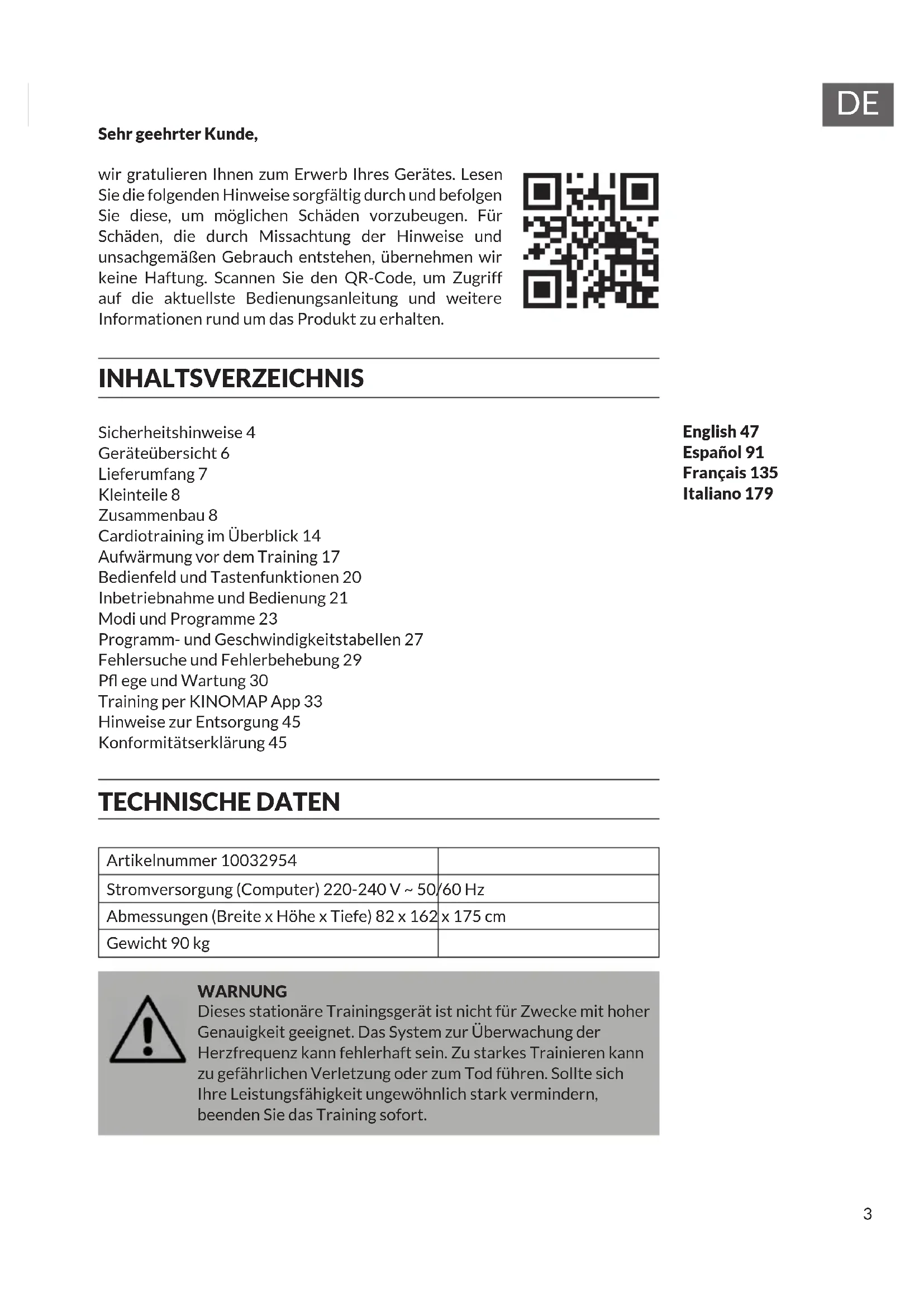English 47 Español 91 Français 135 Italiano 179 Sehr geehrter Kunde, wir gratulieren Ihnen zum Erwerb Ihres Gerätes. Lesen Sie die folgenden Hinweise sorgfältig durch und befolgen Sie diese, um möglichen Schäden vorzubeugen. Für Schäden, die durch Missachtung der Hinweise und unsachgemäßen Gebrauch entstehen, übernehmen wir keine Haftung. Scannen Sie den QR-Code, um Zugriff auf die aktuellste Bedienungsanleitung und weitere Informationen rund um das Produkt zu erhalten. INHALTSVERZEICHNIS Sicherheitshinweise 4 Geräteübersicht 6 Lieferumfang 7 Kleinteile 8 Zusammenbau 8 Cardiotraining im Überblick 14 Aufwärmung vor dem Training 17 Bedienfeld und Tastenfunktionen 20 Inbetriebnahme und Bedienung 21 Modi und Programme 23 Programm- und Geschwindigkeitstabellen 27 Fehlersuche und Fehlerbehebung 29 P ege und Wartung 30 Training per KINOMAP App 33 Hinweise zur Entsorgung 45 Konformitätserklärung 45 TECHNISCHE DATEN Artikelnummer 10032954 Stromversorgung (Computer) 220-240 V ~ 50/60 Hz Abmessungen (Breite x Höhe x Tiefe) 82 x 162 x 175 cm Gewicht 90 kg WARNUNG Dieses stationäre Trainingsgerät ist nicht für Zwecke mit hoher Genauigkeit geeignet. Das System zur Überwachung der Herzfrequenz kann fehlerhaft sein. Zu starkes Trainieren kann zu gefährlichen Verletzung oder zum Tod führen. Sollte sich Ihre Leistungsfähigkeit ungewöhnlich stark vermindern, beenden Sie das Training sofort.4