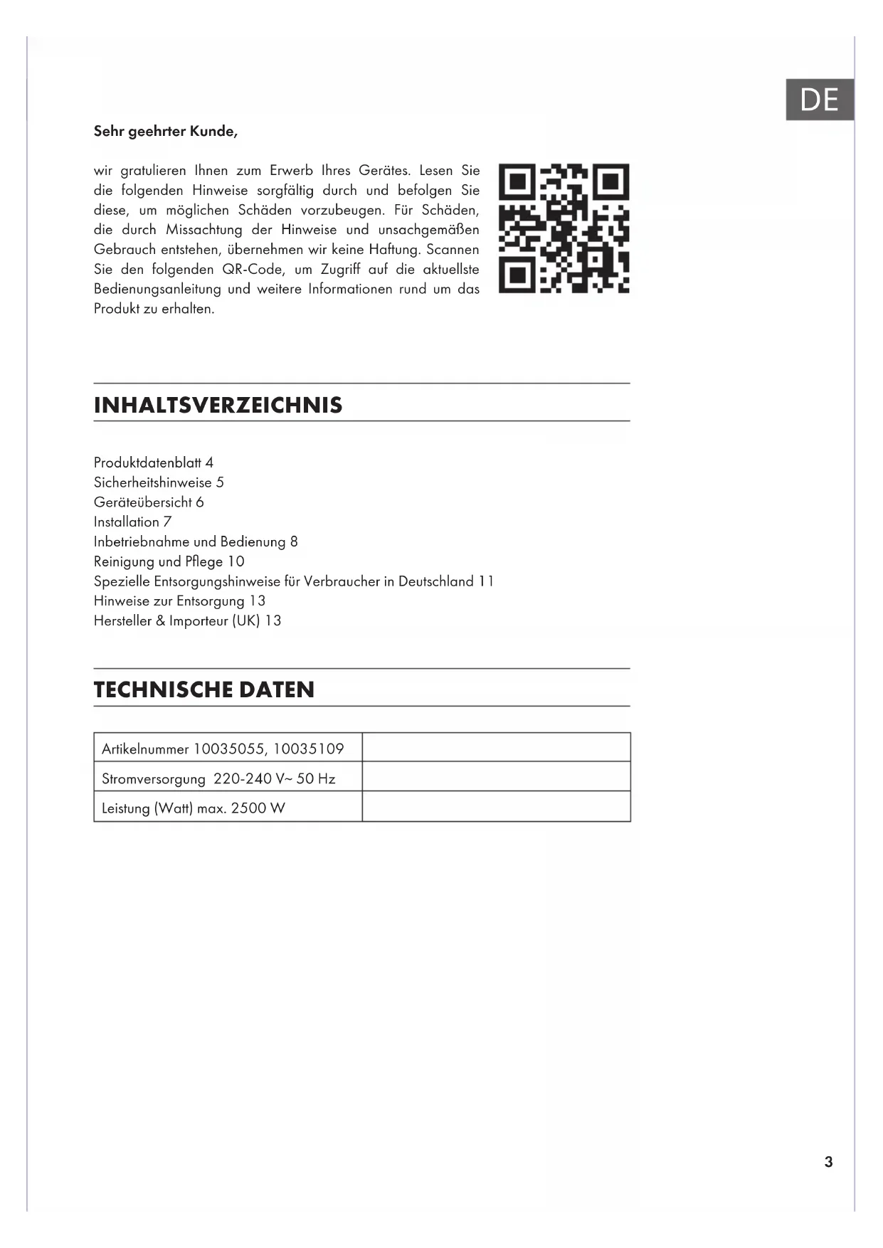 Sehr geehrter Kunde, wir gratulieren Ihnen zum Erwerb Ihres Gerätes. Lesen Sie die folgenden Hinweise sorgfältig durch und befolgen Sie diese, um möglichen Schäden vorzubeugen. Für Schäden, die durch Missachtung der Hinweise und unsachgemäßen Gebrauch entstehen, übernehmen wir keine Haftung. Scannen Sie den folgenden QR-Code, um Zugriff auf die aktuellste Bedienungsanleitung und weitere Informationen rund um das Produkt zu erhalten. INHALTSVERZEICHNIS TECHNISCHE DATEN Artikelnummer 10035055, 10035109 Stromversorgung 220-240 V~ 50 Hz Leistung (Watt) max. 2500 W Produktdatenblatt4 Sicherheitshinweise5 Geräteübersicht6 Installation7 Inbetriebnahme und Bedienung8 Reinigung und Pege10 Spezielle Entsorgungshinweise für Verbraucher in Deutschland11 Hinweise zur Entsorgung13 Hersteller & Importeur (UK)134