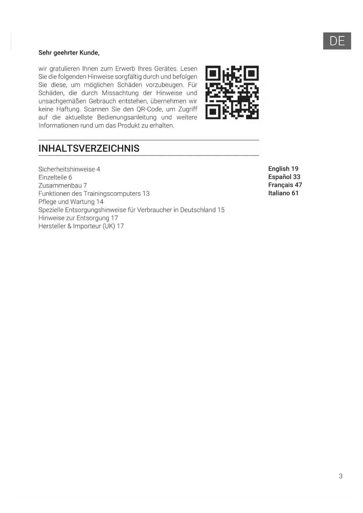 English 19 Español 33 Français 47 Italiano 61 Sehr geehrter Kunde, wir gratulieren Ihnen zum Erwerb Ihres Gerätes. Lesen Sie die folgenden Hinweise sorgfältig durch und befolgen Sie diese, um möglichen Schäden vorzubeugen. Für Schäden, die durch Missachtung der Hinweise und unsachgemäßen Gebrauch entstehen, übernehmen wir keine Haftung. Scannen Sie den QR-Code, um Zugriff auf die aktuellste Bedienungsanleitung und weitere Informationen rund um das Produkt zu erhalten. INHALTSVERZEICHNIS Sicherheitshinweise 4 Einzelteile 6 Zusammenbau 7 Funktionen des Trainingscomputers 13 Pflege und Wartung 14 Spezielle Entsorgungshinweise für Verbraucher in Deutschland 15 Hinweise zur Entsorgung 17 Hersteller & Importeur (UK) 174