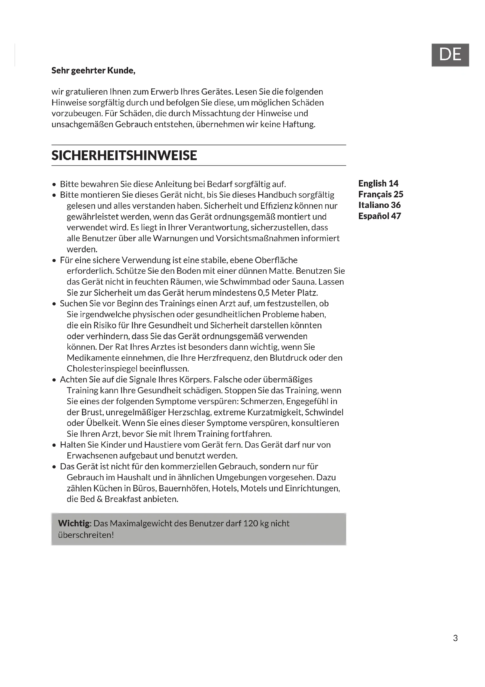 - Das Gerät ist nicht für den kommerziellen Gebrauch, sondern nur für Gebrauch im Haushalt und in ähnlichen Umgebungen vorgesehen. Dazu zählen Küchen in Büros, Bauernhöfen, Hotels, Motels und Einrichtungen, die Bed & Breakfast anbieten. Wichtig: Das Maximalgewicht des Benutzer darf 120 kg nicht überschreiten!4