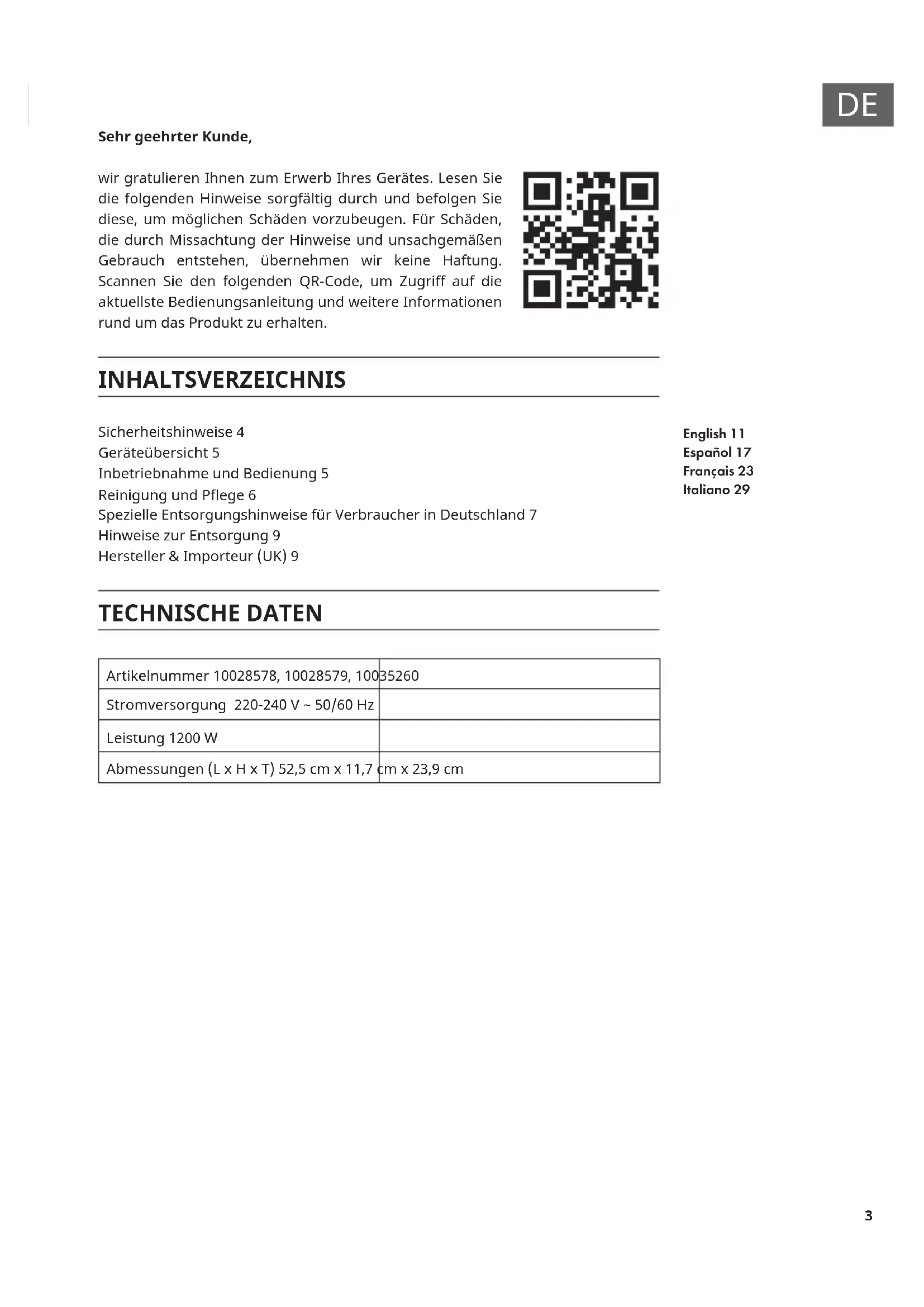 Sehr geehrter Kunde, wir gratulieren Ihnen zum Erwerb Ihres Gerätes. Lesen Sie die folgenden Hinweise sorgfältig durch und befolgen Sie diese, um möglichen Schäden vorzubeugen. Für Schäden, die durch Missachtung der Hinweise und unsachgemäßen Gebrauch entstehen, übernehmen wir keine Haftung. Scannen Sie den folgenden QR-Code, um Zugriff auf die aktuellste Bedienungsanleitung und weitere Informationen rund um das Produkt zu erhalten. INHALTSVERZEICHNIS Sicherheitshinweise 4 Geräteübersicht 5 Inbetriebnahme und Bedienung 5 Reinigung und Pege 6 Spezielle Entsorgungshinweise für Verbraucher in Deutschland 7 Hinweise zur Entsorgung 9 Hersteller & Importeur (UK) 9 TECHNISCHE DATEN Artikelnummer 10028578, 10028579, 10035260 Stromversorgung 220-240 V ~ 50/60 Hz Leistung 1200 W Abmessungen (L x H x T) 52,5 cm x 11,7 cm x 23,9 cm English 11 Español 17 Français 23 Italiano 294