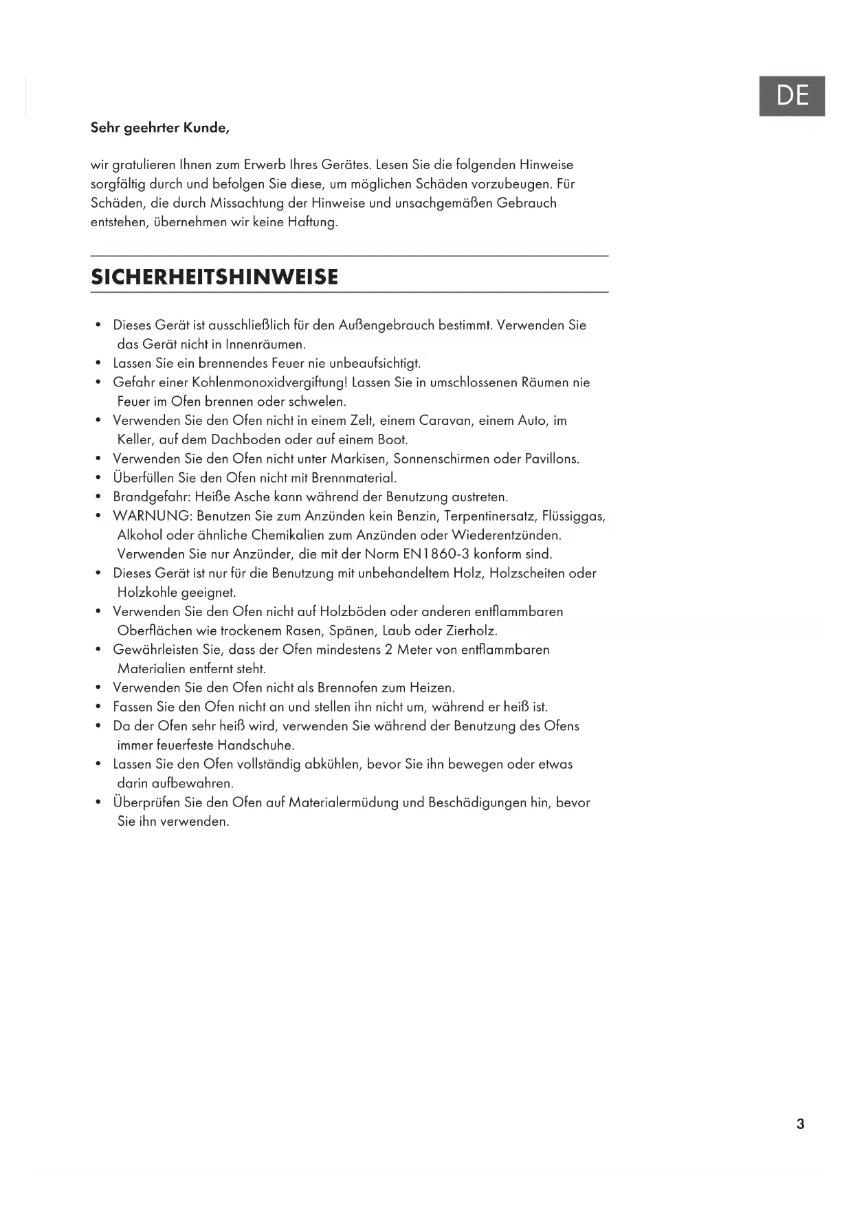 - WARNUNG: Benutzen Sie zum Anzünden kein Benzin, Terpentinersatz, Flüssiggas, Alkohol oder ähnliche Chemikalien zum Anzünden oder Wiederentzünden. Verwenden Sie nur Anzünder, die mit der Norm EN1860-3 konform sind.
