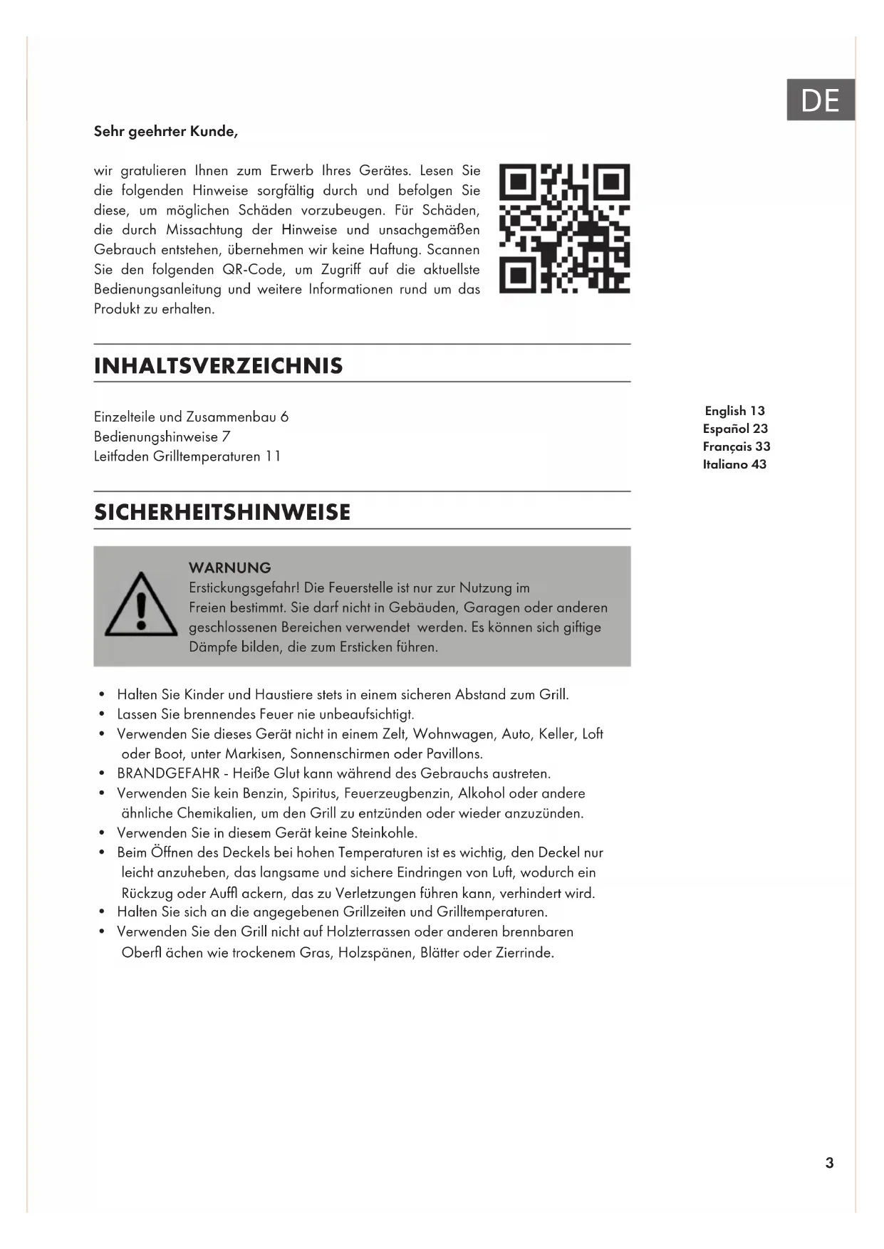 Sehr geehrter Kunde, wir gratulieren Ihnen zum Erwerb Ihres Gerätes. Lesen Sie die folgenden Hinweise sorgfältig durch und befolgen Sie diese, um möglichen Schäden vorzubeugen. Für Schäden, die durch Missachtung der Hinweise und unsachgemäßen Gebrauch entstehen, übernehmen wir keine Haftung. Scannen Sie den folgenden QR-Code, um Zugriff auf die aktuellste Bedienungsanleitung und weitere Informationen rund um das Produkt zu erhalten. INHALTSVERZEICHNIS Einzelteile und Zusammenbau6 Bedienungshinweise7 Leitfaden Grilltemperaturen11 SICHERHEITSHINWEISE WARNUNG Erstickungsgefahr! Die Feuerstelle ist nur zur Nutzung im Freien bestimmt. Sie darf nicht in Gebäuden, Garagen oder anderen geschlossenen Bereichen verwendet werden. Es können sich giftige Dämpfe bilden, die zum Ersticken führen.
