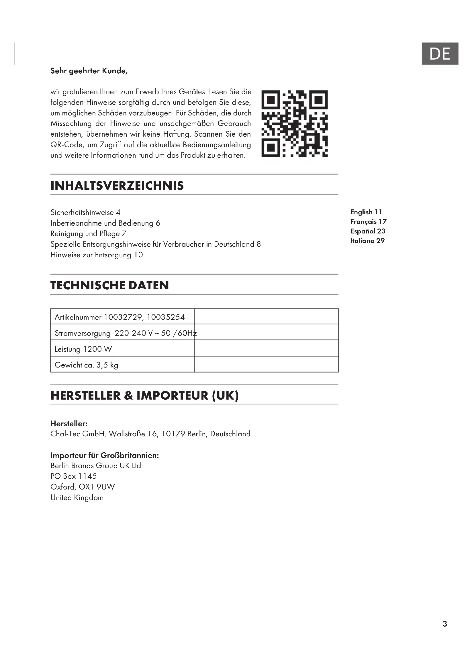 Sehr geehrter Kunde, wir gratulieren Ihnen zum Erwerb Ihres Gerätes. Lesen Sie die folgenden Hinweise sorgfältig durch und befolgen Sie diese, um möglichen Schäden vorzubeugen. Für Schäden, die durch Missachtung der Hinweise und unsachgemäßen Gebrauch entstehen, übernehmen wir keine Haftung. Scannen Sie den QR-Code, um Zugriff auf die aktuellste Bedienungsanleitung und weitere Informationen rund um das Produkt zu erhalten. INHALTSVERZEICHNIS Sicherheitshinweise4 Inbetriebnahme und Bedienung6 Reinigung und Pege7 Spezielle Entsorgungshinweise für Verbraucher in Deutschland8 Hinweise zur Entsorgung10 TECHNISCHE DATEN Artikelnummer 10032729, 10035254 Stromversorgung 220-240 V ~ 50 /60Hz Leistung 1200 W Gewicht ca. 3,5 kg HERSTELLER & IMPORTEUR (UK) Hersteller: Chal-Tec GmbH, Wallstraße 16, 10179 Berlin, Deutschland. Importeur für Großbritannien: Berlin Brands Group UK Ltd PO Box 1145 Oxford, OX1 9UW United Kingdom English 11 Français 17 Español 23 Italiano 294