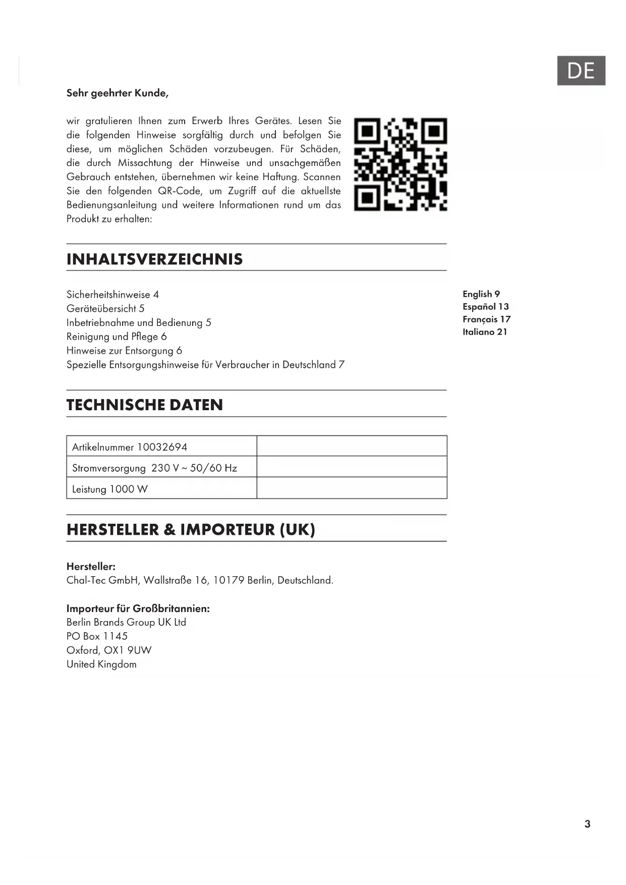 Sehr geehrter Kunde, wir gratulieren Ihnen zum Erwerb Ihres Gerätes. Lesen Sie die folgenden Hinweise sorgfältig durch und befolgen Sie diese, um möglichen Schäden vorzubeugen. Für Schäden, die durch Missachtung der Hinweise und unsachgemäßen Gebrauch entstehen, übernehmen wir keine Haftung. Scannen Sie den folgenden QR-Code, um Zugriff auf die aktuellste Bedienungsanleitung und weitere Informationen rund um das Produkt zu erhalten: INHALTSVERZEICHNIS Sicherheitshinweise4 Geräteübersicht5 Inbetriebnahme und Bedienung5 Reinigung und Pege6 Hinweise zur Entsorgung6 Spezielle Entsorgungshinweise für Verbraucher in Deutschland7 TECHNISCHE DATEN Artikelnummer 10032694 Stromversorgung 230 V ~ 50/60 Hz Leistung 1000 W HERSTELLER & IMPORTEUR (UK) Hersteller: Chal-Tec GmbH, Wallstraße 16, 10179 Berlin, Deutschland. Importeur für Großbritannien: Berlin Brands Group UK Ltd PO Box 1145 Oxford, OX1 9UW United Kingdom English 9 Español 13 Français 17 Italiano 214