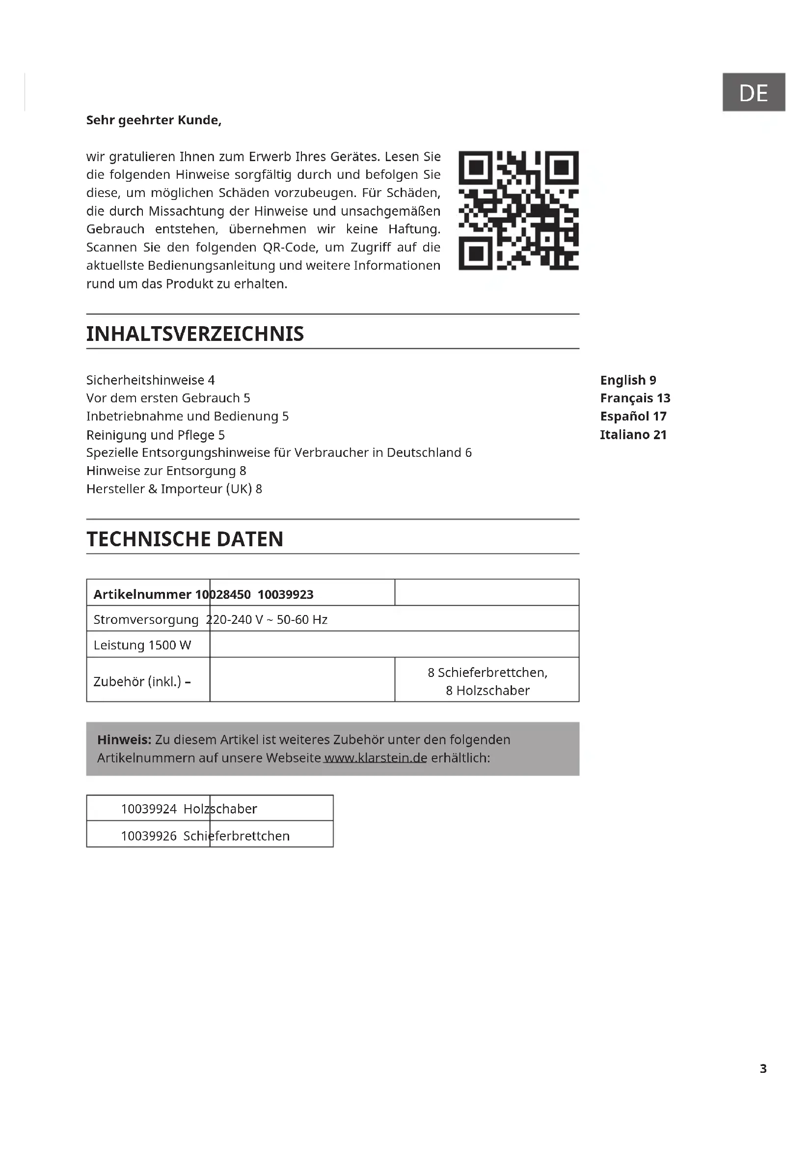 Sehr geehrter Kunde, wir gratulieren Ihnen zum Erwerb Ihres Gerätes. Lesen Sie die folgenden Hinweise sorgfältig durch und befolgen Sie diese, um möglichen Schäden vorzubeugen. Für Schäden, die durch Missachtung der Hinweise und unsachgemäßen Gebrauch entstehen, übernehmen wir keine Haftung. Scannen Sie den folgenden QR-Code, um Zugriff auf die aktuellste Bedienungsanleitung und weitere Informationen rund um das Produkt zu erhalten. INHALTSVERZEICHNIS Sicherheitshinweise 4 Vor dem ersten Gebrauch 5 Inbetriebnahme und Bedienung 5 Reinigung und Pege 5 Spezielle Entsorgungshinweise für Verbraucher in Deutschland 6 Hinweise zur Entsorgung 8 Hersteller & Importeur (UK) 8 TECHNISCHE DATEN Artikelnummer 10028450 10039923 Stromversorgung 220-240 V ~ 50-60 Hz Leistung 1500 W Zubehör (inkl.) – 8 Schieferbrettchen, 8 Holzschaber Hinweis: Zu diesem Artikel ist weiteres Zubehör unter den folgenden Artikelnummern auf unsere Webseite www.klarstein.de erhältlich: 10039924 Holzschaber 10039926 Schieferbrettchen English 9 Français 13 Español 17 Italiano 214