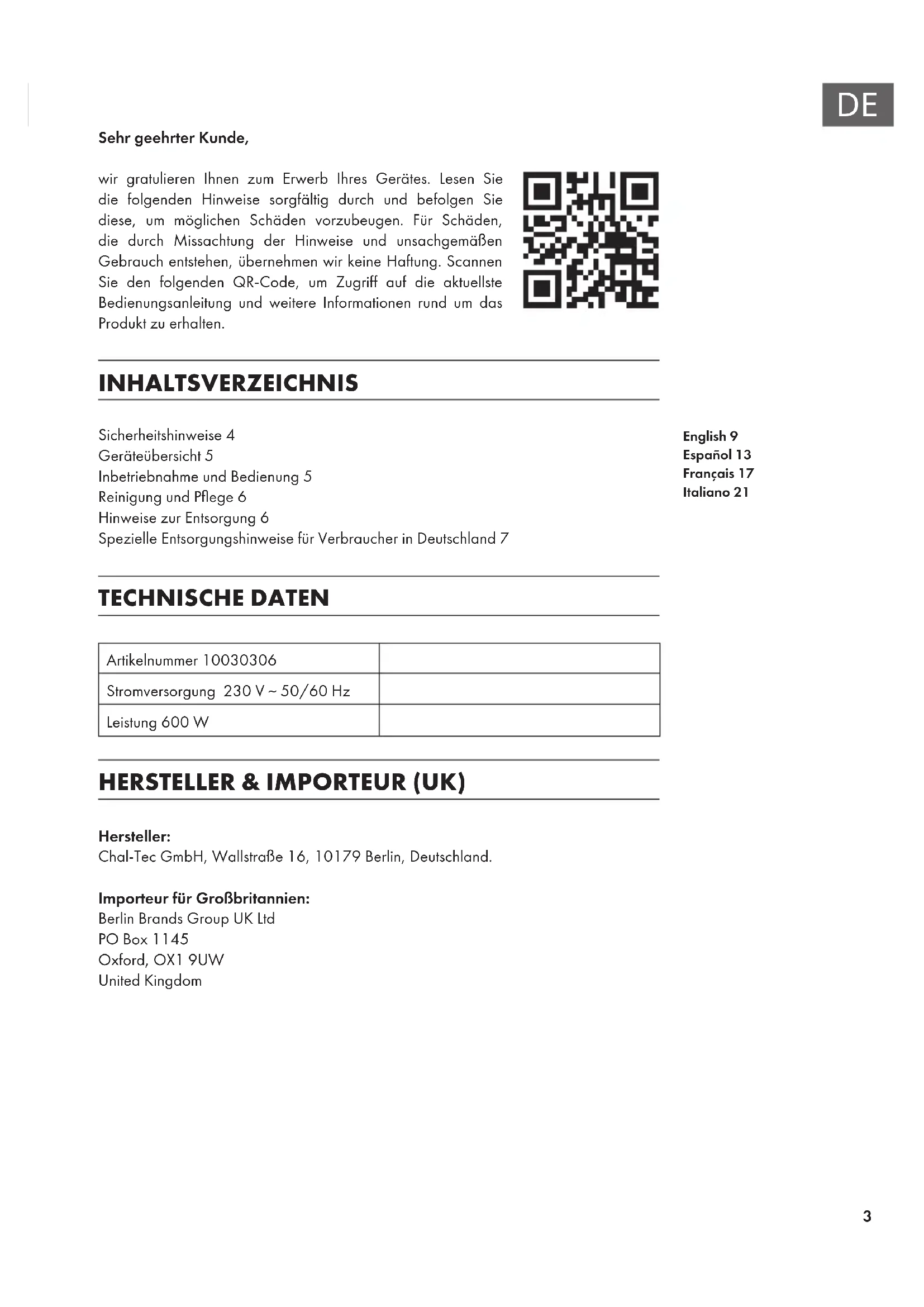 English 9 Español 13 Français 17 Italiano 21 Sehr geehrter Kunde, wir gratulieren Ihnen zum Erwerb Ihres Gerätes. Lesen Sie die folgenden Hinweise sorgfältig durch und befolgen Sie diese, um möglichen Schäden vorzubeugen. Für Schäden, die durch Missachtung der Hinweise und unsachgemäßen Gebrauch entstehen, übernehmen wir keine Haftung. Scannen Sie den folgenden QR-Code, um Zugriff auf die aktuellste Bedienungsanleitung und weitere Informationen rund um das Produkt zu erhalten. INHALTSVERZEICHNIS Sicherheitshinweise4 Geräteübersicht5 Inbetriebnahme und Bedienung5 Reinigung und Pege6 Hinweise zur Entsorgung6 Spezielle Entsorgungshinweise für Verbraucher in Deutschland7 TECHNISCHE DATEN Artikelnummer 10030306 Stromversorgung 230 V ~ 50/60 Hz Leistung 600 W HERSTELLER & IMPORTEUR (UK) Hersteller: Chal-Tec GmbH, Wallstraße 16, 10179 Berlin, Deutschland. Importeur für Großbritannien: Berlin Brands Group UK Ltd PO Box 1145 Oxford, OX1 9UW United Kingdom4