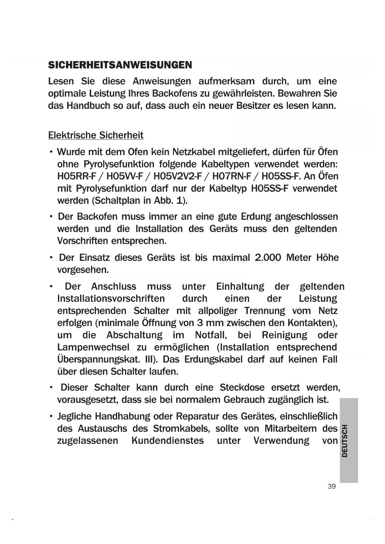 - Wurde mit dem Ofen kein Netzkabel mitgeliefert, dürfen für Öfen ohne Pyrolysefunktion folgende Kabeltypen verwendet werden: H05RR-F / H05VV-F / H05V2V2-F / H07RN-F / H05SS-F. An Öfen mit Pyrolysefunktion darf nur der Kabeltyp H05SS-F verwendet werden (Schaltplan in Abb. 1).