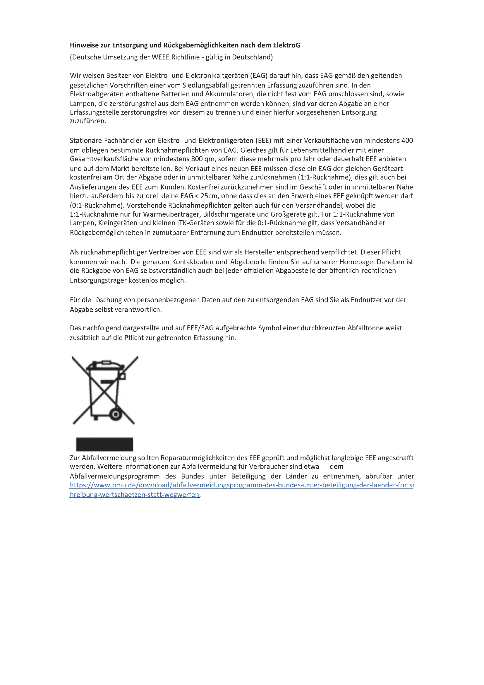 234Hinweise zur Entsorgung und Rückgabemöglichkeiten nach dem ElektroG (Deutsche Umsetzung der WEEE Richtlinie - gültig in Deutschland) Wir weisen Besitzer von Elektro- und Elektronikaltgeräten (EAG) darauf hin, dass EAG gemäß den geltenden gesetzlichen Vorschriften einer vom Siedlungsabfall getrennten Erfassung zuzuführen sind. In den Elektroaltgeräten enthaltene Batterien und Akkumulatoren, die nicht fest vom EAG umschlossen sind, sowie Lampen, die zerstörungsfrei aus dem EAG entnommen werden können, sind vor deren Abgabe an einer Erfassungsstelle zerstörungsfrei von diesem zu trennen und einer hierfür vorgesehenen Entsorgung zuzuführen. Stationäre Fachhändler von Elektro- und Elektronikgeräten (EEE) mit einer Verkaufsfläche von mindestens 400 qm obliegen bestimmte Rücknahmepflichten von EAG. Gleiches gilt für Lebensmittelhändler mit einer Gesamtverkaufsfläche von mindestens 800 qm, sofern diese mehrmals pro Jahr oder dauerhaft EEE anbieten und auf dem Markt bereitstellen. Bei Verkauf eines neuen EEE müssen diese ein EAG der gleichen Geräteart kostenfrei am Ort der Abgabe oder in unmittelbarer Nähe zurücknehmen (1:1-Rücknahme); dies gilt auch bei Auslieferungen des EEE zum Kunden. Kostenfrei zurückzunehmen sind im Geschäft oder in unmittelbarer Nähe hierzu außerdem bis zu drei kleine EAG < 25cm, ohne dass dies an den Erwerb eines EEE geknüpft werden darf (0:1-Rücknahme). Vorstehende Rücknahmepflichten gelten auch für den Versandhandel, wobei die 1:1-Rücknahme nur für Wärmeüberträger, Bildschirmgeräte und Großgeräte gilt. Für 1:1-Rücknahme von Lampen, Kleingeräten und kleinen ITK-Geräten sowie für die 0:1-Rücknahme gilt, dass Versandhändler Rückgabemöglichkeiten in zumutbarer Entfernung zum Endnutzer bereitstellen müssen. Als rücknahmepflichtiger Vertreiber von EEE sind wir als Hersteller entsprechend verpflichtet. Dieser Pflicht kommen wir nach. Die genauen Kontaktdaten und Abgabeorte finden Sie auf unserer Homepage. Daneben ist die Rückgabe von EAG selbstverständlich auch bei jeder offiziellen Abgabestelle der öffentlich-rechtlichen Entsorgungsträger kostenlos möglich. Für die Löschung von personenbezogenen Daten auf den zu entsorgenden EAG sind Sie als Endnutzer vor der Abgabe selbst verantwortlich. Das nachfolgend dargestellte und auf EEE/EAG aufgebrachte Symbol einer durchkreuzten Abfalltonne weist zusätzlich auf die Pflicht zur getrennten Erfassung hin. Zur Abfallvermeidung sollten Reparaturmöglichkeiten des EEE geprüft und möglichst langlebige EEE angeschafft werden. Weitere Informationen zur Abfallvermeidung für Verbraucher sind etwa dem Abfallvermeidungsprogramm des Bundes unter Beteiligung der Länder zu entnehmen, abrufbar unter https://www.bmu.de/download/abfallvermeidungsprogramm-des-bundes-unter-beteiligung-der-laender-fortsc hreibung-wertschaetzen-statt-wegwerfen.Deutsch 3 Sicherheitshinweise Höchstdruckreiniger Lesen Sie vor der ers- ten Benutzung des Ge- räts diese Sicherheitshinweise und die Originalbetriebsanlei- tung. Handeln Sie danach. Be- wahren Sie beide Hefte für den späteren Gebrauch oder für Nachbesitzer auf. Neben den Hinweisen in der Betriebsanleitung müssen Sie die allgemeinen Sicherheits- und Unfallverhütungsvor- schriften des Gesetzgebers berücksichtigen. Am Gerät angebrachte Warn- und Hinweisschilder geben wichtige Hinweise für den ge- fahrlosen Betrieb. Gefahrenstufen GEFAHR Hinweis auf eine unmittelbar drohende Gefahr, die zu schwe- ren Körperverletzungen oder zum Tod führt. 몇 WARNUNG Hinweis auf eine möglicherwei- se gefährliche Situation, die zu schweren Körperverletzungen oder zum Tod führen kann. 몇 VORSICHT Hinweis auf eine möglicherweise gefährliche Situation, die zu leich- ten Verletzungen führen kann. ACHTUNG Hinweis auf eine möglicherwei- se gefährliche Situation, die zu Sachschäden führen kann. Persönliche Schutzausrüstung 몇 VORSICHT Tragen Sie bei Arbeiten am Gerät geeignete Handschuhe. Während des Gebrauchs von Hochdruckreini- gern können Aerosole entste- hen. Das Einatmen von Aerosolen kann zu gesundheitli- chen Schäden führen. Der Ar- beitgeber ist verpflichtet eine Gefährdungsbeurteilung vorzu- nehmen, um in Abhängigkeit von der zu reinigenden Oberflä- che und der Umgebung die not- wendigen Schutzmaßnahmen gegen das Einatmen von Aero- solen festzulegen. Atemschutz- masken der Klasse FFP 2 oder höher eignen sich zum Schutz vor wässrigen Aerosolen. Tra- gen Sie beim Arbeiten geeigne- te Schutzausrüstung entsprechend der EU-Verord- nung 2016/425: Schutzhelm, Schutzbrille, Schutzscheibe (Gesichtsschutz), Kapselgehör- schutz, Schutzhandschuhe, Schutzjacke, Schutzhose (Schutzlatzhose), Schutzstiefel. Die Schutzkleidung bietet nur Schutz vor Sprühwasser und abspringenden Partikeln. Bei di- rektem Kontakt mit dem Hoch- druckstrahl ist keine ausreichende Schutzwirkung vorhanden.4 Deutsch Allgemeine Sicherheitshinweise GEFAHR Erstickungsge- fahr. Halten Sie Verpackungsfo- lien von Kindern fern. 몇 WARNUNG Verwenden Sie das Gerät nur bestimmungsge- mäß. Berücksichtigen Sie die örtlichen Gegebenheiten und achten Sie beim Arbeiten mit dem Gerät auf Dritte, insbeson- dere Kinder. Das Gerät ist nicht dafür bestimmt, durch Per- sonen mit eingeschränkten phy- sischen, sensorischen oder geistigen Fähigkeiten oder man- gels Erfahrung und / oder man- gels Wissen benutzt zu werden. l Nur Personen, die in der Handhabung des Geräts unter- wiesen sind oder Ihre Fähigkei- ten zur Bedienung nachgewiesen haben und aus- drücklich mit der Benutzung be- auftragt sind, dürfen das Gerät benutzen. Beaufsichtigen Sie Kinder, um sicherzustellen, dass sie nicht mit dem Gerät spielen. l Kinder und Jugendliche dür- fen das Gerät nicht betreiben. 몇 VORSICHT Sicherheitsein- richtungen dienen Ihrem Schutz. Verändern oder umge- hen Sie niemals Sicherheitsein- richtungen. Stromschlaggefahr GEFAHR Schließen Sie Schutzklasse I - Geräte nur an ordnungs