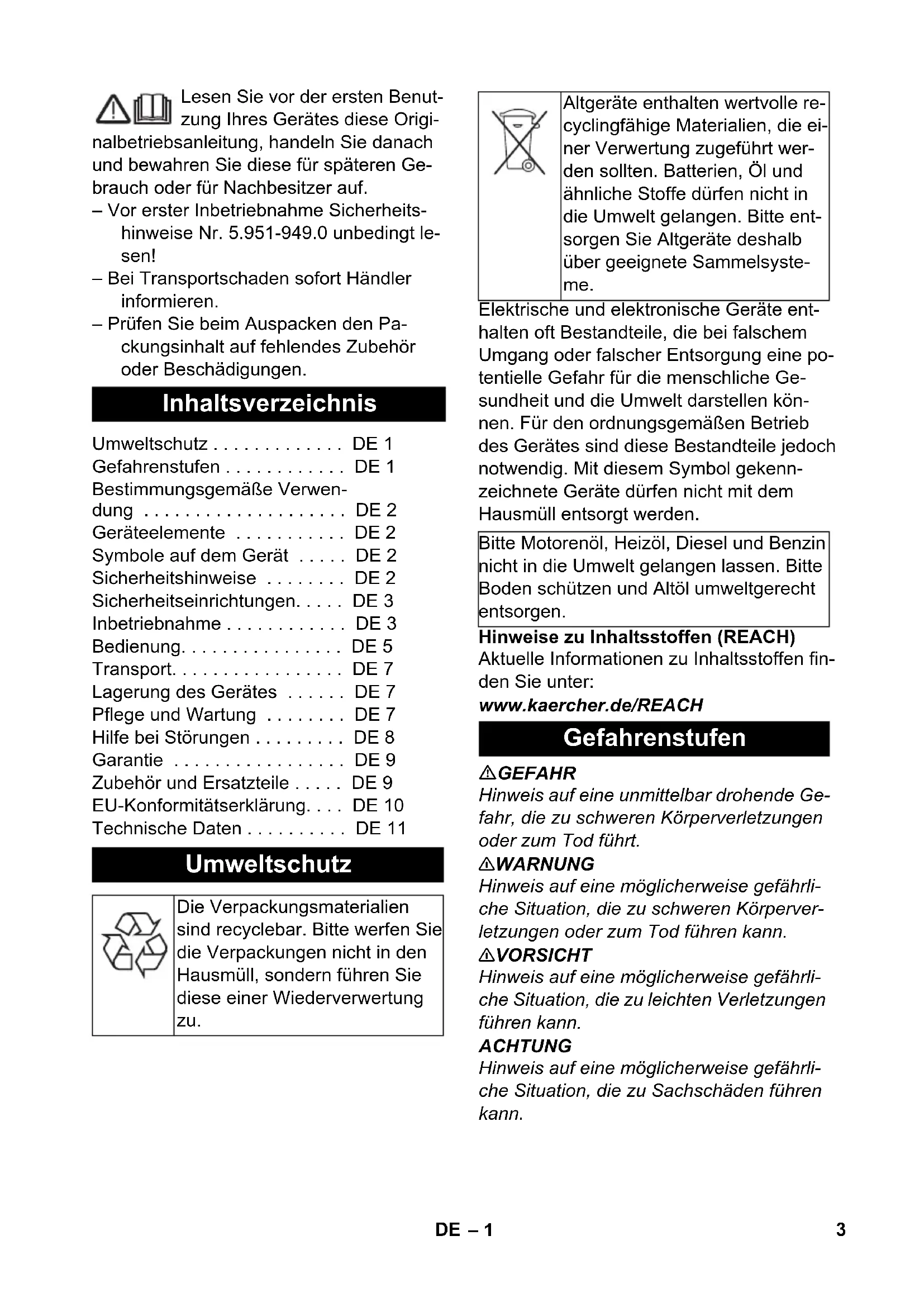 59669240 05/19 Deutsch 3 English 14 Français 25 Italiano 37 Nederlands 49 Español 60 Português 72 Dansk 84 Norsk 95 Svenska 105 Suomi 115 Ελληνικά 126 Türkçe 139 Русский 150 Magyar 163 Čeština 174 Slovenščina 185 Polski 196 Româneşte 208 Slovenčina 219 Hrvatski 230 Srpski 241 Български 252 Eesti 265 Latviešu 276 Lietuviškai 287 Українська 2982– 1 Lesen Sie vor der ersten Benut- zung Ihres Gerätes diese Origi- nalbetriebsanleitung, handeln Sie danach und bewahren Sie diese für späteren Ge- brauch oder für Nachbesitzer auf. – Vor erster Inbetriebnahme Sicherheits- hinweise Nr. 5.951-949.0 unbedingt le- sen! – Bei Transportschaden sofort Händler informieren. – Prüfen Sie beim Auspacken den Pa- ckungsinhalt auf fehlendes Zubehör oder Beschädigungen. Elektrische und elektronische Geräte ent- halten oft Bestandteile, die bei falschem Umgang oder falscher Entsorgung eine po- tentielle Gefahr für die menschliche Ge- sundheit und die Umwelt darstellen kön- nen. Für den ordnungsgemäßen Betrieb des Gerätes sind diese Bestandteile jedoch notwendig. Mit diesem Symbol gekenn- zeichnete Geräte dürfen nicht mit dem Hausmüll entsorgt werden. Hinweise zu Inhaltsstoffen (REACH) Aktuelle Informationen zu Inhaltsstoffen fin- den Sie unter: www.kaercher.de/REACH GEFAHR Hinweis auf eine unmittelbar drohende Ge- fahr, die zu schweren Körperverletzungen oder zum Tod führt. 몇 WARNUNG Hinweis auf eine möglicherweise gefährli- che Situation, die zu schweren Körperver- letzungen oder zum Tod führen kann. 몇 VORSICHT Hinweis auf eine möglicherweise gefährli- che Situation, die zu leichten Verletzungen führen kann. ACHTUNG Hinweis auf eine möglicherweise gefährli- che Situation, die zu Sachschäden führen kann. Inhaltsverzeichnis Umweltschutz ... DE 1 Gefahrenstufen ... DE 1 Bestimmungsgemäße Verwen- dung ... DE 2 Geräteelemente ... DE 2 Symbole auf dem Gerät ... DE 2 Sicherheitshinweise ... DE 2 Sicherheitseinrichtungen... DE 3 Inbetriebnahme ... DE 3 Bedienung... DE 5 Transport... DE 7 Lagerung des Gerätes ... DE 7 Pflege und Wartung ... DE 7 Hilfe bei Störungen ... DE 8 Garantie ... DE 9 Zubehör und Ersatzteile ... DE 9 EU-Konformitätserklärung... DE 10 Technische Daten ... DE 11 Umweltschutz Die Verpackungsmaterialien sind recyclebar. Bitte werfen Sie die Verpackungen nicht in den Hausmüll, sondern führen Sie diese einer Wiederverwertung zu. Altgeräte enthalten wertvolle re- cyclingfähige Materialien, die ei- ner Verwertung zugeführt wer- den sollten. Batterien, Öl und ähnliche Stoffe dürfen nicht in die Umwelt gelangen. Bitte ent- sorgen Sie Altgeräte deshalb über geeignete Sammelsyste- me. Bitte Motorenöl, Heizöl, Diesel und Benzin nicht in die Umwelt gelangen lassen. Bitte Boden schützen und Altöl umweltgerecht entsorgen. Gefahrenstufen 3DE– 2 Verwenden Sie diesen Hochdruckreiniger ausschließlich: – zum Reinigen von Maschinen, Fahr- zeugen, Bauwerken, Werkzeugen. – mit von Kärcher zugelassenem Zube- hör und Ersatzteilen. Abbildungen siehe Seite 2 1 Handspritzpistole EASY!Force 2 Sicherungsraste 3 Abzugshebel 4 Sicherungshebel 5 Drehkupplung (nicht bei HD 16/15-4 Cage) 6 Hochdruckschlauch EASY!Lock 7 Betriebsstundenzähler (Option) 8 Strahlrohrablage 9 Schubbügel 10 Schlauch-/Kabelhalter 11 Geräteschalter 12 Stopfen 13 Kontrollleuchte Betriebszustand / Stö- rung 14 Netzanschlusskabel mit Stecker 15 Öleinfüllstutzen (Ölbehälter bei HD 25/ 15-4) 16 Wasseranschluss mit Filter 17 Druck-/Mengenregulierung 18 Zubehörfach 19 Ölablassschraube 20 Ölstandsanzeige 21 Hochdruckanschluss EASY!Lock 22 Manometer 23 Strebe für Kranverladung 24 Powerdüse mit Überwurfmutter 25 Strahlrohr EASY!Lock 26 Servo-Press-Drehregler – Bedienelemente für den Reinigungs- prozess sind gelb. – Bedienelemente für die Wartung und den Service sind hellgrau. 몇 WARNUNG Vorschriften des Wasserversorgungsunter- nehmens beachten. Gemäß gültiger Vorschriften darf das Gerät nie ohne Systemtrenner am Trinkwassernetz betrieben werden. Es ist ein geeigneter Sys- temtrenner der Fa. KÄRCHER oder alter- nativ ein Systemtrenner gemäß EN 12729 Typ BA zu verwenden. Wasser, das durch einen Systemtrenner ge- flossen ist, wird als nicht trinkbar eingestuft. 몇 VORSICHT Systemtrenner immer an der Wasserversor- gung, niemals direkt am Gerät anschließen. GEFAHR Verletzungsgefahr! – Nur Original-Hochdruckschläuche ver- wenden.