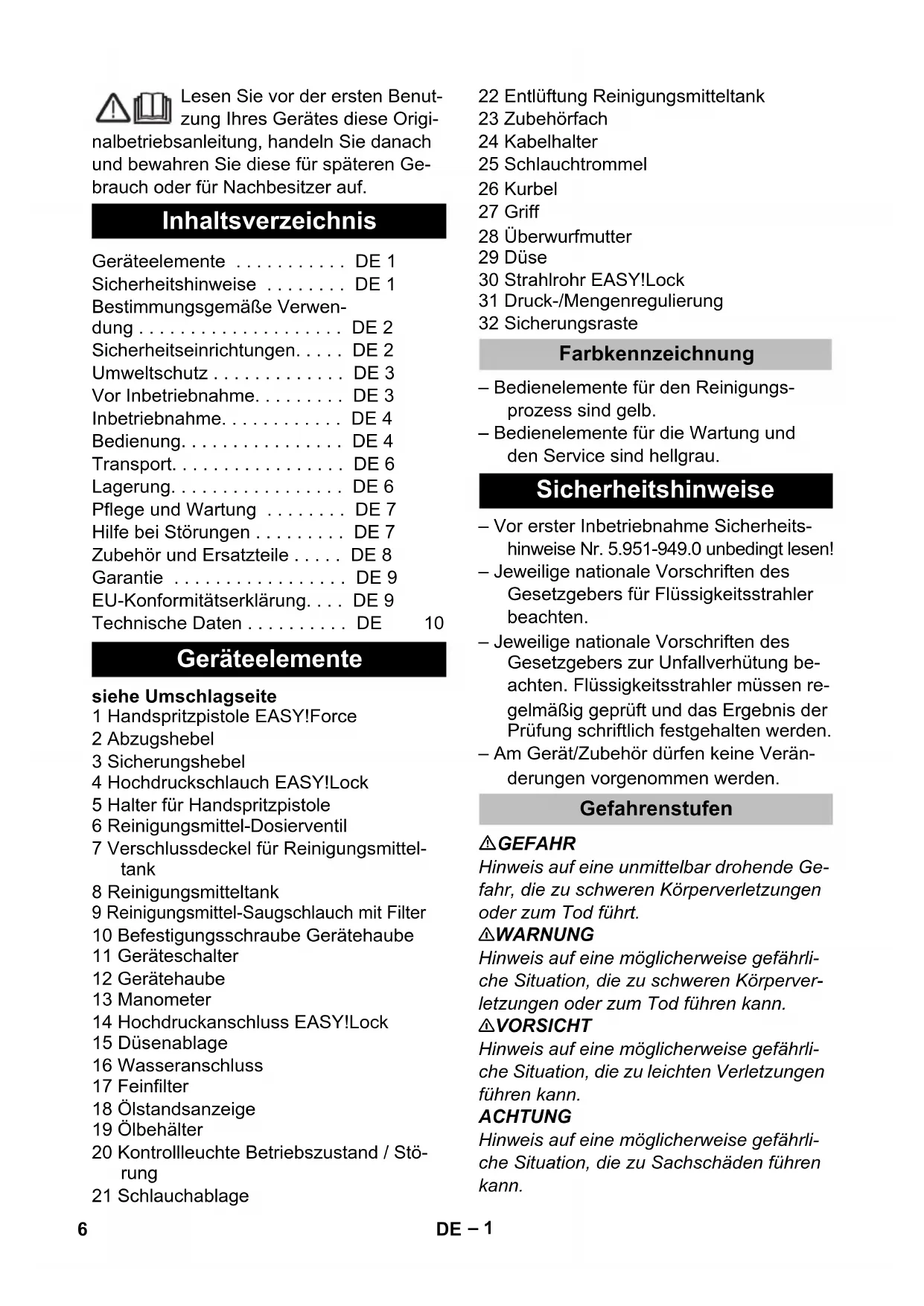 - 59657500 04/19 Deutsch 6 English 16 Français 26 Italiano 37 Nederlands 48 Español 58 Português 69 Dansk 80 Norsk 90 Svenska 100 Suomi 109 Ελληνικά 119 Türkçe 130 Русский 140 Magyar 152 Čeština 162 Slovenščina 172 Polski 181 Româneşte 192 Slovenčina 202 Hrvatski 212 Srpski 222 Български 232 Eesti 243 Latviešu 252 Lietuviškai 262 Українська 272 Indonesia 2832345– 1 Lesen Sie vor der ersten Benut- zung Ihres Gerätes diese Origi- nalbetriebsanleitung, handeln Sie danach und bewahren Sie diese für späteren Ge- brauch oder für Nachbesitzer auf. siehe Umschlagseite 1 Handspritzpistole EASY!Force 2 Abzugshebel 3 Sicherungshebel 4 Hochdruckschlauch EASY!Lock 5 Halter für Handspritzpistole 6 Reinigungsmittel-Dosierventil 7 Verschlussdeckel für Reinigungsmittel- tank 8 Reinigungsmitteltank 9 Reinigungsmittel-Saugschlauch mit Filter 10 Befestigungsschraube Gerätehaube 11 Geräteschalter 12 Gerätehaube 13 Manometer 14 Hochdruckanschluss EASY!Lock 15 Düsenablage 16 Wasseranschluss 17 Feinfilter 18 Ölstandsanzeige 19 Ölbehälter 20 Kontrollleuchte Betriebszustand / Stö- rung 21 Schlauchablage 22 Entlüftung Reinigungsmitteltank 23 Zubehörfach 24 Kabelhalter 25 Schlauchtrommel 26 Kurbel 27 Griff 28 Überwurfmutter 29 Düse 30 Strahlrohr EASY!Lock 31 Druck-/Mengenregulierung 32 Sicherungsraste – Bedienelemente für den Reinigungs- prozess sind gelb. – Bedienelemente für die Wartung und den Service sind hellgrau. – Vor erster Inbetriebnahme Sicherheits- hinweise Nr. 5.951-949.0 unbedingt lesen! – Jeweilige nationale Vorschriften des Gesetzgebers für Flüssigkeitsstrahler beachten. – Jeweilige nationale Vorschriften des Gesetzgebers zur Unfallverhütung be- achten. Flüssigkeitsstrahler müssen re- gelmäßig geprüft und das Ergebnis der Prüfung schriftlich festgehalten werden. – Am Gerät/Zubehör dürfen keine Verän- derungen vorgenommen werden. GEFAHR Hinweis auf eine unmittelbar drohende Ge- fahr, die zu schweren Körperverletzungen oder zum Tod führt. 몇 WARNUNG Hinweis auf eine möglicherweise gefährli- che Situation, die zu schweren Körperver- letzungen oder zum Tod führen kann. 몇 VORSICHT Hinweis auf eine möglicherweise gefährli- che Situation, die zu leichten Verletzungen führen kann. ACHTUNG Hinweis auf eine möglicherweise gefährli- che Situation, die zu Sachschäden führen kann. Inhaltsverzeichnis Geräteelemente DE 1 Sicherheitshinweise DE 1 Bestimmungsgemäße Verwen- dung DE 2 Sicherheitseinrichtungen DE 2 Umweltschutz DE 3 Vor Inbetriebnahme DE 3 Inbetriebnahme DE 4 Bedienung DE 4 Transport DE 6 Lagerung DE 6 Pflege und Wartung DE 7 Hilfe bei Störungen DE 7 Zubehör und Ersatzteile DE 8 Garantie DE 9 EU-Konformitätserklärung DE 9 Technische Daten