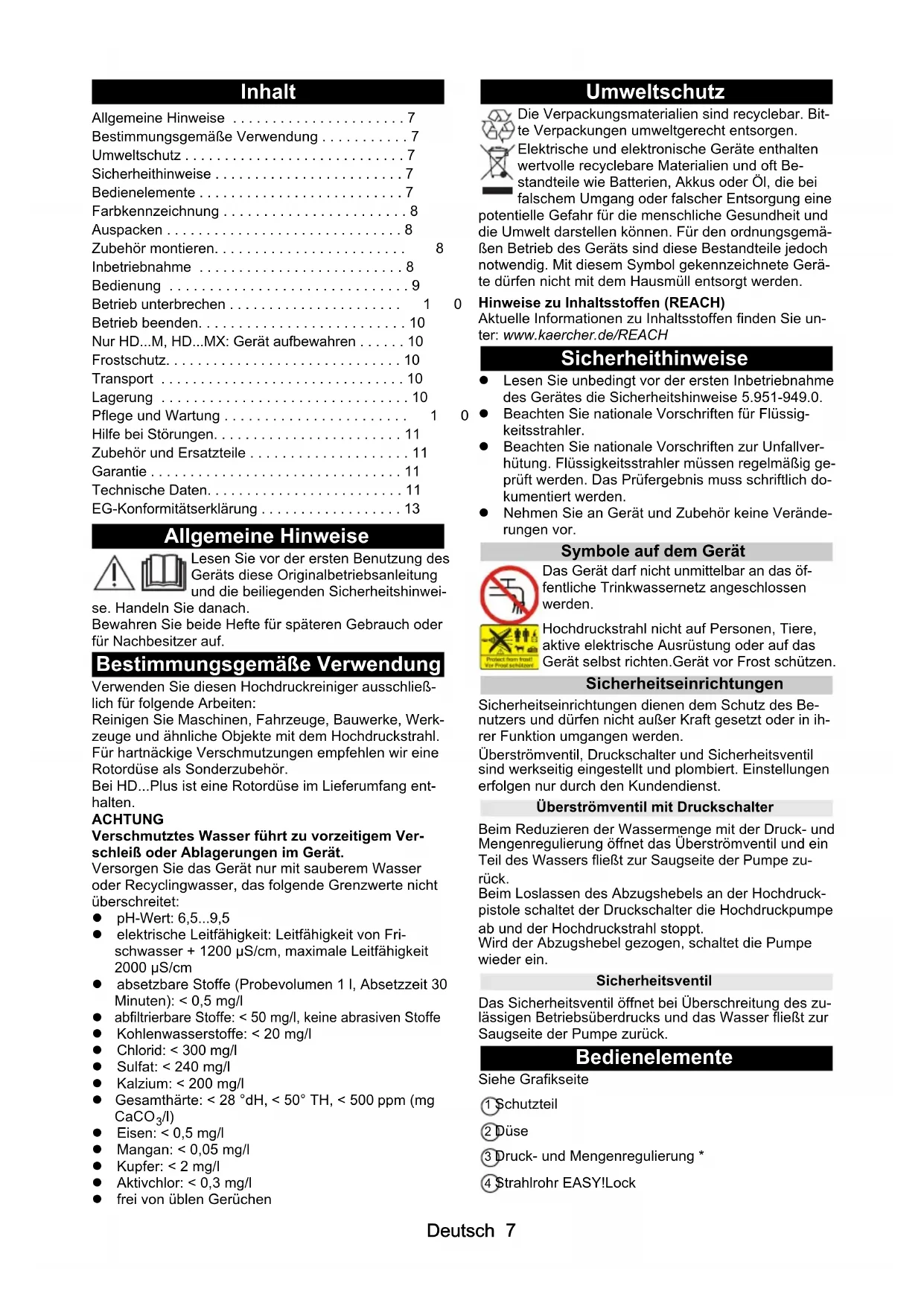 - /l) Eisen: < 0,5 mg/l Mangan: < 0,05 mg/l Kupfer: < 2 mg/l Aktivchlor: < 0,3 mg/l frei von üblen Gerüchen Umweltschutz Die Verpackungsmaterialien sind recyclebar. Bit- te Verpackungen umweltgerecht entsorgen. Elektrische und elektronische Geräte enthalten wertvolle recyclebare Materialien und oft Be- standteile wie Batterien, Akkus oder Öl, die bei falschem Umgang oder falscher Entsorgung eine potentielle Gefahr für die menschliche Gesundheit und die Umwelt darstellen können. Für den ordnungsgemä- ßen Betrieb des Geräts sind diese Bestandteile jedoch notwendig. Mit diesem Symbol gekennzeichnete Gerä- te dürfen nicht mit dem Hausmüll entsorgt werden. Hinweise zu Inhaltsstoffen (REACH) Aktuelle Informationen zu Inhaltsstoffen finden Sie un- ter: www.kaercher.de/REACH Sicherheithinweise Lesen Sie unbedingt vor der ersten Inbetriebnahme des Gerätes die Sicherheitshinweise 5.951-949.0. Beachten Sie nationale Vorschriften für Flüssig- keitsstrahler. Beachten Sie nationale Vorschriften zur Unfallver- hütung. Flüssigkeitsstrahler müssen regelmäßig ge- prüft werden. Das Prüfergebnis muss schriftlich do- kumentiert werden. Nehmen Sie an Gerät und Zubehör keine Verände- rungen vor. Symbole auf dem Gerät Das Gerät darf nicht unmittelbar an das öf- fentliche Trinkwassernetz angeschlossen werden. Hochdruckstrahl nicht auf Personen, Tiere, aktive elektrische Ausrüstung oder auf das Gerät selbst richten.Gerät vor Frost schützen. Sicherheitseinrichtungen Sicherheitseinrichtungen dienen dem Schutz des Be- nutzers und dürfen nicht außer Kraft gesetzt oder in ih- rer Funktion umgangen werden. Überströmventil, Druckschalter und Sicherheitsventil sind werkseitig eingestellt und plombiert. Einstellungen erfolgen nur durch den Kundendienst. Überströmventil mit Druckschalter Beim Reduzieren der Wassermenge mit der Druck- und Mengenregulierung öffnet das Überströmventil und ein Teil des Wassers fließt zur Saugseite der Pumpe zu- rück. Beim Loslassen des Abzugshebels an der Hochdruck- pistole schaltet der Druckschalter die Hochdruckpumpe ab und der Hochdruckstrahl stoppt. Wird der Abzugshebel gezogen, schaltet die Pumpe wieder ein. Sicherheitsventil Das Sicherheitsventil öffnet bei Überschreitung des zu- lässigen Betriebsüberdrucks und das Wasser fließt zur Saugseite der Pumpe zurück. Bedienelemente Siehe Grafikseite 1 Schutzteil 2 Düse 3 Druck- und Mengenregulierung * 4 Strahlrohr EASY!Lock Allgemeine Hinweise p. 7