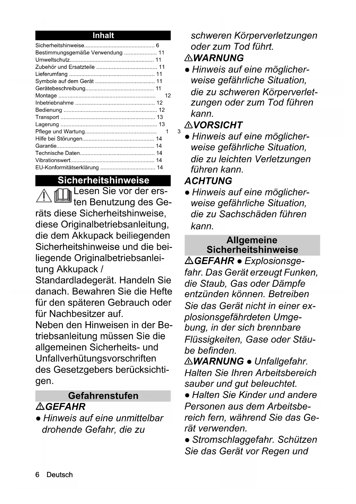 - L M N O P QR S6 Deutsch Inhalt Sicherheitshinweise Lesen Sie vor der ers- ten Benutzung des Ge- räts diese Sicherheitshinweise, diese Originalbetriebsanleitung, die dem Akkupack beiliegenden Sicherheitshinweise und die bei- liegende Originalbetriebsanlei- tung Akkupack / Standardladegerät. Handeln Sie danach. Bewahren Sie die Hefte für den späteren Gebrauch oder für Nachbesitzer auf. Neben den Hinweisen in der Be- triebsanleitung müssen Sie die allgemeinen Sicherheits- und Unfallverhütungsvorschriften des Gesetzgebers berücksichti- gen. Gefahrenstufen GEFAHR ● Hinweis auf eine unmittelbar drohende Gefahr, die zu schweren Körperverletzungen oder zum Tod führt. 몇 WARNUNG ● Hinweis auf eine möglicher- weise gefährliche Situation, die zu schweren Körperverlet- zungen oder zum Tod führen kann. 몇 VORSICHT ● Hinweis auf eine möglicher- weise gefährliche Situation, die zu leichten Verletzungen führen kann. ACHTUNG ● Hinweis auf eine möglicher- weise gefährliche Situation, die zu Sachschäden führen kann. Allgemeine Sicherheitshinweise GEFAHR ● Explosionsge- fahr. Das Gerät erzeugt Funken, die Staub, Gas oder Dämpfe entzünden können. Betreiben Sie das Gerät nicht in einer ex- plosionsgefährdeten Umge- bung, in der sich brennbare Flüssigkeiten, Gase oder Stäu- be befinden. 몇 WARNUNG ● Unfallgefahr. Halten Sie Ihren Arbeitsbereich sauber und gut beleuchtet. ● Halten Sie Kinder und andere Personen aus dem Arbeitsbe- reich fern, während Sie das Ge- rät verwenden. ● Stromschlaggefahr. Schützen Sie das Gerät vor Regen und Sicherheitshinweise p. 6