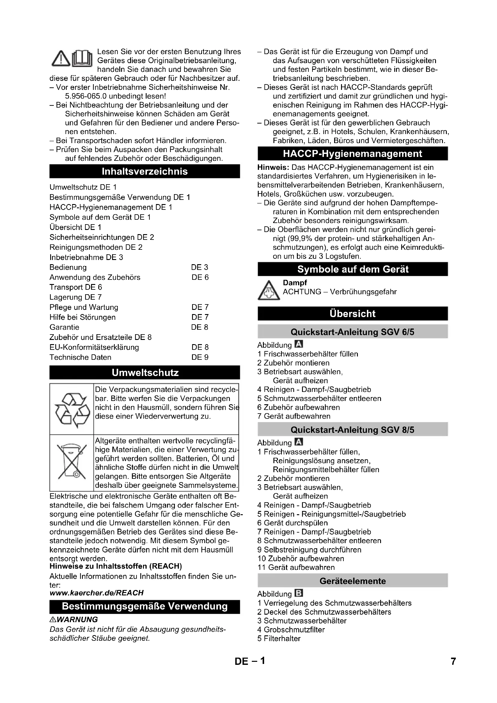 6– 1 Lesen Sie vor der ersten Benutzung Ihres Gerätes diese Originalbetriebsanleitung, handeln Sie danach und bewahren Sie diese für späteren Gebrauch oder für Nachbesitzer auf. – Vor erster Inbetriebnahme Sicherheitshinweise Nr. 5.956-065.0 unbedingt lesen! – Bei Nichtbeachtung der Betriebsanleitung und der Sicherheitshinweise können Schäden am Gerät und Gefahren für den Bediener und andere Perso- nen entstehen. – Bei Transportschaden sofort Händler informieren. – Prüfen Sie beim Auspacken den Packungsinhalt auf fehlendes Zubehör oder Beschädigungen. Elektrische und elektronische Geräte enthalten oft Be- standteile, die bei falschem Umgang oder falscher Ent- sorgung eine potentielle Gefahr für die menschliche Ge- sundheit und die Umwelt darstellen können. Für den ordnungsgemäßen Betrieb des Gerätes sind diese Be- standteile jedoch notwendig. Mit diesem Symbol ge- kennzeichnete Geräte dürfen nicht mit dem Hausmüll entsorgt werden. Hinweise zu Inhaltsstoffen (REACH) Aktuelle Informationen zu Inhaltsstoffen finden Sie un- ter: www.kaercher.de/REACH 몇 WARNUNG Das Gerät ist nicht für die Absaugung gesundheits- schädlicher Stäube geeignet. – Das Gerät ist für die Erzeugung von Dampf und das Aufsaugen von verschütteten Flüssigkeiten und festen Partikeln bestimmt, wie in dieser Be- triebsanleitung beschrieben. – Dieses Gerät ist nach HACCP-Standards geprüft und zertifiziert und damit zur gründlichen und hygi- enischen Reinigung im Rahmen des HACCP-Hygi- enemanagements geeignet. – Dieses Gerät ist für den gewerblichen Gebrauch geeignet, z.B. in Hotels, Schulen, Krankenhäusern, Fabriken, Läden, Büros und Vermietergeschäften. Hinweis: Das HACCP-Hygienemanagement ist ein standardisiertes Verfahren, um Hygienerisiken in le- bensmittelverarbeitenden Betrieben, Krankenhäusern, Hotels, Großküchen usw. vorzubeugen. – Die Geräte sind aufgrund der hohen Dampftempe- raturen in Kombination mit dem entsprechenden Zubehör besonders reinigungswirksam. – Die Oberflächen werden nicht nur gründlich gerei- nigt (99,9% der protein- und stärkehaltigen An- schmutzungen), es erfolgt auch eine Keimredukti- on um bis zu 3 Logstufen. Dampf ACHTUNG – Verbrühungsgefahr Abbildung 1 Frischwasserbehälter füllen 2 Zubehör montieren 3 Betriebsart auswählen, Gerät aufheizen 4 Reinigen - Dampf-/Saugbetrieb 5 Schmutzwasserbehälter entleeren 6 Zubehör aufbewahren 7 Gerät aufbewahren Abbildung 1 Frischwasserbehälter füllen, Reinigungslösung ansetzen, Reinigungsmittelbehälter füllen 2 Zubehör montieren 3 Betriebsart auswählen, Gerät aufheizen 4 Reinigen - Dampf-/Saugbetrieb 5 Reinigen - Reinigungsmittel-/Saugbetrieb 6 Gerät durchspülen 7 Reinigen - Dampf-/Saugbetrieb 8 Schmutzwasserbehälter entleeren 9 Selbstreinigung durchführen 10 Zubehör aufbewahren 11 Gerät aufbewahren Abbildung 1 Verriegelung des Schmutzwasserbehälters 2 Deckel des Schmutzwasserbehälters 3 Schmutzwasserbehälter 4 Grobschmutzfilter 5 Filterhalter Inhaltsverzeichnis Umweltschutz DE 1 Bestimmungsgemäße Verwendung DE 1 HACCP-Hygienemanagement DE 1 Symbole auf dem Gerät DE 1 Übersicht DE 1 Sicherheitseinrichtungen DE 2 Reinigungsmethoden DE 2 Inbetriebnahme DE 3 Bedienung DE 3 Anwendung des Zubehörs DE 6 Transport DE 6 Lagerung DE 7 Pflege und Wartung DE 7 Hilfe bei Störungen DE 7 Garantie DE 8 Zubehör und Ersatzteile DE 8 EU-Konformitätserklärung DE 8 Technische Daten DE 9 Umweltschutz Die Verpackungsmaterialien sind recycle- bar. Bitte werfen Sie die Verpackungen nicht in den Hausmüll, sondern führen Sie diese einer Wiederverwertung zu. Altgeräte enthalten wertvolle recyclingfä- hige Materialien, die einer Verwertung zu- geführt werden sollten. Batterien, Öl und ähnliche Stoffe dürfen nicht in die Umwelt gelangen. Bitte entsorgen Sie Altgeräte deshalb über geeignete Sammelsysteme. Bestimmungsgemäße Verwendung HACCP-Hygienemanagement Symbole auf dem Gerät Übersicht Quickstart-Anleitung SGV 6/5 Quickstart-Anleitung SGV 8/5 Geräteelemente 7DE– 2 6 Dampfsaugschlauch 7 Schubbügel 8 Schlauchhalter 9 Adapter für Zubehör (Homebase) 10 Halter für Dampfsaugrohr (Parkposition) 11 Aufnahme des Dampfsaugrohrs (Selbstreinigung) (nur SGV 8/5) 12 Halter für Bodendüse (Parkposition) 13 Lenkrolle mit Feststellbremse 14 Reinigungsmittelbehälter (SGV 8/5) Behälter für Reinigungsmittel-Sprühflasche (SGV 6/5) 15 Griffmulde 16 Frischwasserbehälter 17 Zubehörsteckdose 18 Verriegelung des Zubehörsteckers 19 Gummilippeneinsatz für Bodendüse 20 Bodendüse 21 Verriegelung der Einsätze für Bodendüse 22 Dreieckdüse 23 Zubehörstecker 24 Abdeckung der Zubehörsteckdose 25 Bedienfeld 26 Abdeckung der Zubehörablage 27 Zubehörablage 28 Zubehörarretierung 29 Drehverschluss des Reinigungsmittelbehälters (nur SGV 8/5) 30 Drehverschluss des Frischwasserbehälters 31 Tragegriff des Frischwasserbehälters, klappbar 32 Reinigungsmittel-Sprühflasche (nur SGV 6/5) 33 Dampfsaugrohr 34 Rundbürste 35 Handgriff 36 Punktstrahldüse/Adapter für Fugendüse 37 Verlängerung für Punktstrahldüse 38 Gummilippe für Handdüse 39 Handdüse 40 Bürstenkranz für Handdüse 41 Fugendüse 42 Bürstenstreifeneinsatz für Bodendüse 43 Trittmulde 44 Ablage für Bodendüse 45 Kabelhaken, drehbar 46 Luftaustritt, Arbeitsluft 47 Halter für Dampfsaugrohr 48 Netzkabel 49 Halter für Dreieckdüse 50 Quickstart-Anleitung 51 Abdeckung des Schmutzwasserbehälters 52 Verschluss des Schmutzwasserbehälters 53 Typenschild Abbildung 10/OFF 2 Betriebsart: Kaltwasser-/Saugbetrieb 3 Betriebsart: Dampf-/Heißwasser-/Kaltwasser-/ Saugbetrieb (eco!efficiency) 4 Betriebsart: Dampf-/Heißwasser-/Kaltwasser-/ Saugbetrieb 5 Betriebsart: Spülen (nur SGV 8/5) 6 Betriebsart: Reinigungsmittel-/Saugbetrieb (nur SGV 8/5) 7 Betriebsart: Selbstreinigung (nur SGV 8/5) 8 Drehschalter 9 Display (nur SGV 8/5) 10 Kontrolllampe „Betriebsbereitschaft“ (grün) 11 Kontrolllampe „Heizung ein“ (grün) 12 Kont