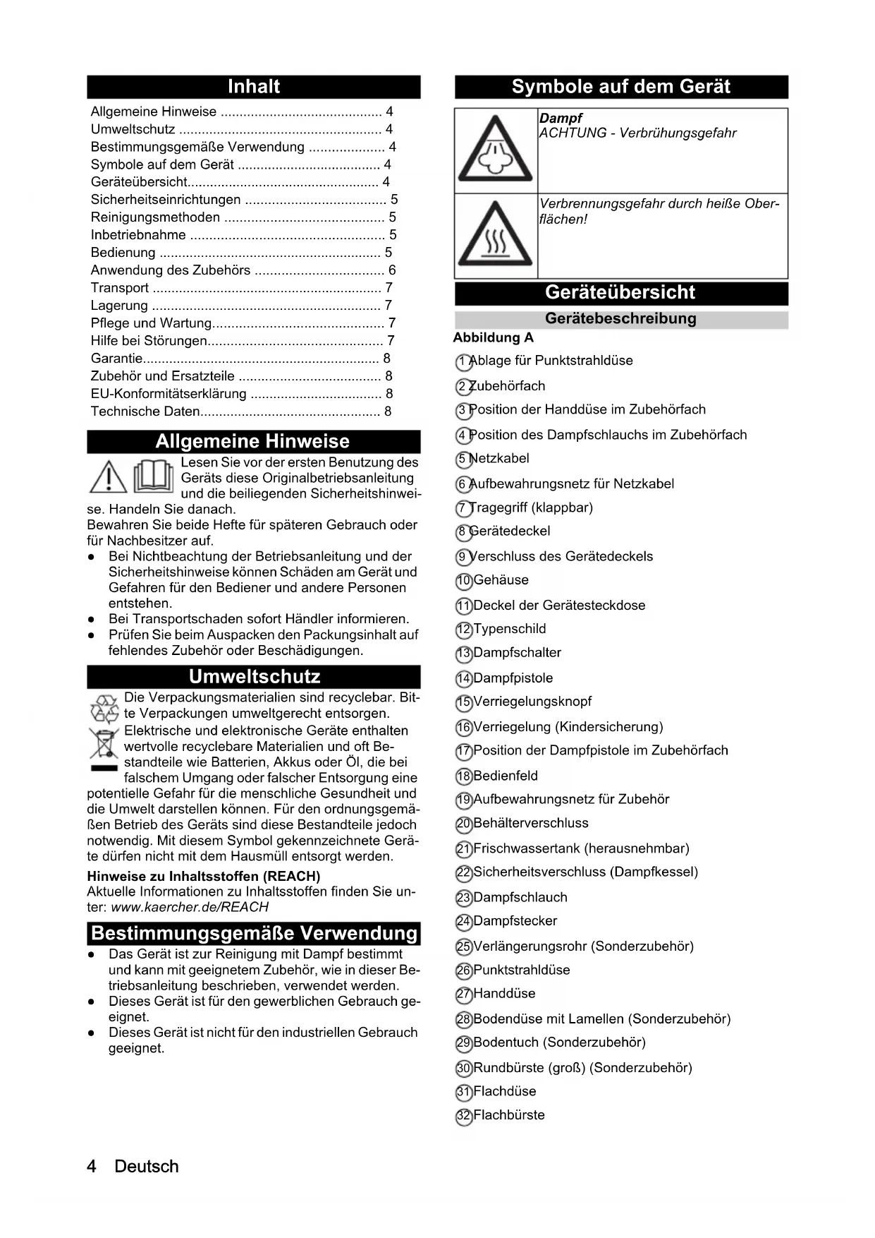 • B C D E4 Deutsch Inhalt Allgemeine Hinweise Lesen Sie vor der ersten Benutzung des Geräts diese Originalbetriebsanleitung und die beiliegenden Sicherheitshinwei- se. Handeln Sie danach. Bewahren Sie beide Hefte für späteren Gebrauch oder für Nachbesitzer auf. ● Bei Nichtbeachtung der Betriebsanleitung und der Sicherheitshinweise können Schäden am Gerät und Gefahren für den Bediener und andere Personen entstehen. ● Bei Transportschaden sofort Händler informieren. ● Prüfen Sie beim Auspacken den Packungsinhalt auf fehlendes Zubehör oder Beschädigungen. Umweltschutz Die Verpackungsmaterialien sind recyclebar. Bit- te Verpackungen umweltgerecht entsorgen. Elektrische und elektronische Geräte enthalten wertvolle recyclebare Materialien und oft Be- standteile wie Batterien, Akkus oder Öl, die bei falschem Umgang oder falscher Entsorgung eine potentielle Gefahr für die menschliche Gesundheit und die Umwelt darstellen können. Für den ordnungsgemä- ßen Betrieb des Geräts sind diese Bestandteile jedoch notwendig. Mit diesem Symbol gekennzeichnete Gerä- te dürfen nicht mit dem Hausmüll entsorgt werden. Hinweise zu Inhaltsstoffen (REACH) Aktuelle Informationen zu Inhaltsstoffen finden Sie un- ter: www.kaercher.de/REACH Bestimmungsgemäße Verwendung ● Das Gerät ist zur Reinigung mit Dampf bestimmt und kann mit geeignetem Zubehör, wie in dieser Be- triebsanleitung beschrieben, verwendet werden. ● Dieses Gerät ist für den gewerblichen Gebrauch ge- eignet. ● Dieses Gerät ist nicht für den industriellen Gebrauch geeignet. Symbole auf dem Gerät Geräteübersicht Gerätebeschreibung Abbildung A 1 Ablage für Punktstrahldüse 2 Zubehörfach 3 Position der Handdüse im Zubehörfach 4 Position des Dampfschlauchs im Zubehörfach 5 Netzkabel 6 Aufbewahrungsnetz für Netzkabel 7 Tragegriff (klappbar) 8 Gerätedeckel 9 Verschluss des Gerätedeckels 10 Gehäuse 11 Deckel der Gerätesteckdose 12 Typenschild 13 Dampfschalter 14 Dampfpistole 15 Verriegelungsknopf 16 Verriegelung (Kindersicherung) 17 Position der Dampfpistole im Zubehörfach 18 Bedienfeld 19 Aufbewahrungsnetz für Zubehör 20 Behälterverschluss 21 Frischwassertank (herausnehmbar) 22 Sicherheitsverschluss (Dampfkessel) 23 Dampfschlauch 24 Dampfstecker 25 Verlängerungsrohr (Sonderzubehör) 26 Punktstrahldüse 27 Handdüse 28 Bodendüse mit Lamellen (Sonderzubehör) 29 Bodentuch (Sonderzubehör) 30 Rundbürste (groß) (Sonderzubehör) 31 Flachdüse 32 Flachbürste Allgemeine Hinweise p. 4