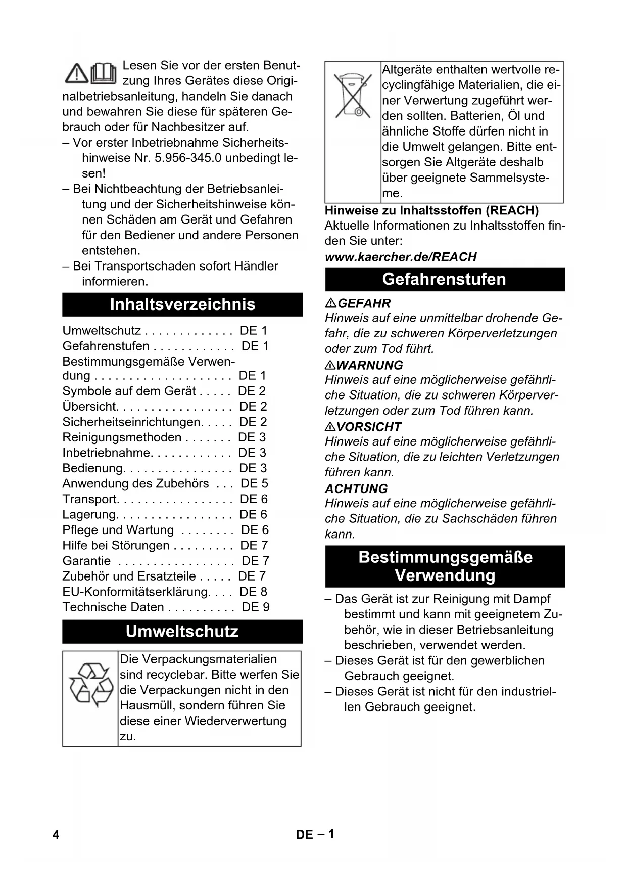 3– 1 Lesen Sie vor der ersten Benut- zung Ihres Gerätes diese Origi- nalbetriebsanleitung, handeln Sie danach und bewahren Sie diese für späteren Ge- brauch oder für Nachbesitzer auf. – Vor erster Inbetriebnahme Sicherheits- hinweise Nr. 5.956-345.0 unbedingt le- sen! – Bei Nichtbeachtung der Betriebsanlei- tung und der Sicherheitshinweise kön- nen Schäden am Gerät und Gefahren für den Bediener und andere Personen entstehen. – Bei Transportschaden sofort Händler informieren. Hinweise zu Inhaltsstoffen (REACH) Aktuelle Informationen zu Inhaltsstoffen fin- den Sie unter: www.kaercher.de/REACH GEFAHR Hinweis auf eine unmittelbar drohende Ge- fahr, die zu schweren Körperverletzungen oder zum Tod führt. 몇 WARNUNG Hinweis auf eine möglicherweise gefährli- che Situation, die zu schweren Körperver- letzungen oder zum Tod führen kann. 몇 VORSICHT Hinweis auf eine möglicherweise gefährli- che Situation, die zu leichten Verletzungen führen kann. ACHTUNG Hinweis auf eine möglicherweise gefährli- che Situation, die zu Sachschäden führen kann. – Das Gerät ist zur Reinigung mit Dampf bestimmt und kann mit geeignetem Zu- behör, wie in dieser Betriebsanleitung beschrieben, verwendet werden. – Dieses Gerät ist für den gewerblichen Gebrauch geeignet. – Dieses Gerät ist nicht für den industriel- len Gebrauch geeignet. Inhaltsverzeichnis Umweltschutz ... DE 1 Gefahrenstufen ... DE 1 Bestimmungsgemäße Verwen- dung ... DE 1 Symbole auf dem Gerät ... DE 2 Übersicht... DE 2 Sicherheitseinrichtungen... DE 2 Reinigungsmethoden ... DE 3 Inbetriebnahme... DE 3 Bedienung... DE 3 Anwendung des Zubehörs ... DE 5 Transport... DE 6 Lagerung... DE 6 Pflege und Wartung ... DE 6 Hilfe bei Störungen ... DE 7 Garantie ... DE 7 Zubehör und Ersatzteile ... DE 7 EU-Konformitätserklärung... DE 8 Technische Daten ... DE 9 Umweltschutz Die Verpackungsmaterialien sind recyclebar. Bitte werfen Sie die Verpackungen nicht in den Hausmüll, sondern führen Sie diese einer Wiederverwertung zu. Altgeräte enthalten wertvolle re- cyclingfähige Materialien, die ei- ner Verwertung zugeführt wer- den sollten. Batterien, Öl und ähnliche Stoffe dürfen nicht in die Umwelt gelangen. Bitte ent- sorgen Sie Altgeräte deshalb über geeignete Sammelsyste- me. Gefahrenstufen Bestimmungsgemäße Verwendung 4 DE– 2 Dampf ACHTUNG – Verbrühungsgefahr Abbildung 1 Sicherheitsverschluss (Dampfkessel) 2 Bedienfeld 3 Dampfschlauch 4 Rückstelltaster - Entkalken 5 Dampfschalter 6 Zubehörfach 7 Deckel der Gerätesteckdose 8 Dampfstecker 9 Tragegriff 10 Kabelhaken 11 Haube 12 Behälterverschluss (Frischwassertank) 13 Frotteeüberzug 14 Einfülltrichter 15 Handdüse 16 Fensterdüse (Sonderzubehör) 17 Netzkabel 18 Halteklammer 19 Bodendüse mit Borsten 20 Bodentuch (Bodendüse mit Borsten) 21 Rundbürste 22 Powerdüse (rot) 23 Verlängerung 24 Bodendüse mit Lamellen 25 Punktstrahldüse (120 mm) 26 Punktstrahldüse (180 mm) 27 Bodentuch (Bodendüse mit Lamellen) 28 Verriegelungsknopf 29 Verlängerungsrohr 30 Verriegelung (Kindersicherung) 31 Dampfpistole Abbildung 1 Schalter - Pumpe Frischwassertank 2 Kontrolllampe - Heizung (gelb) 3 Kontrolllampe - Wassermangel Dampf- kessel (rot) 4 Temperaturanzeige 5 Drehknopf zur VAPOHYDRO-Regulie- rung 6 Drehknopf zur Dampfmengenregulie- rung 7 Arbeitstemperaturbereich 8 Kontrolllampe - Entkalken (weiß) 9 Kontrolllampe - Wassermangel Frisch- wassertank (rot) 10 Schalter - Heizung (Ein/Aus) – Bedienelemente für den Reinigungs- prozess sind gelb. – Bedienelemente für die Wartung und den Service sind hellgrau. Sicherheitseinrichtungen dienen dem Schutz des Benutzers und dürfen nicht au- ßer Kraft gesetzt oder in ihrer Funktion um- gangen werden. Der Druckregler hält den Kesseldruck wäh- rend des Betriebs möglichst konstant. Die Heizung wird bei Erreichen des maximalen Betriebsdrucks im Kessel abgeschaltet und bei einem Druckabfall im Kessel infolge von Dampfentnahme wieder zugeschaltet. Wenn das Wasser im Kessel zur Neige geht, steigt die Temperatur an der Heizung an. Der Wassermangelthermostat schaltet die Heizung ab und die Kontrolllampe „Wassermangel“ leuchtet rot. Die Wieder- einschaltung der Heizung wird so lange verhindert, bis der Kessel abgekühlt ist oder neu befüllt wird. Symbole auf dem Gerät Verbrennungsgefahr durch heiße Oberflächen! Übersicht Geräteelemente Bedienfeld Farbkennzeichnung Sicherheitseinrichtungen Druckregler Wassermangelthermostat 5DE– 3 – Fällt der Wassermangelthermostat aus und überhitzt sich das Gerät, so schal- tet der Sicherheitsthermostat das Gerät aus. – Wenden Sie sich zum Rückstellen des Sicherheitsthermostats an den zustän- digen KÄRCHER Kundendienst. – Der Sicherheitsverschluss verschließt den Kessel gegen den anstehenden Dampfdruck. Sollte der Druckregler de- fekt sein, und im Kessel Überdruck ent- stehen, öffnet im Sicherheitsverschluss ein Überdruckventil und Dampf tritt durch den Verschluss nach außen aus. – Wenden Sie sich vor Wiederinbetrieb- nahme des Gerätes an den zuständi- gen KÄRCHER Kundendienst. Vor Behandlung mit dem Gerät immer die Verträglichkeit der Textilien an verdeckter Stelle prüfen: Zuerst Eindampfen, dann trocknen lassen und anschließend auf Farb- oder Formveränderung prüfen. Beim Reinigen von lackierten oder kunst- stoffbeschichteten Oberflächen wie z.B. Kü- chen- und Wohnmöbeln, Türen, Parkett, Lin- oleum können sich Wachs, Möbelpolitur, Kunststoffbeschichtungen oder Farbe lösen oder Flecken entstehen. Bei der Reinigung dieser Oberflächen ein Tuch kurz eindamp- fen und damit über die Oberflächen wischen. Fensterscheibe in Jahreszeiten mit beson- ders niedrigen Temperaturen vorwärmen. Dazu die gesamte Glasoberfläche in einem Abstand von ca. 50 cm leicht eindampfen. So werden Spannungen an der Oberfläche vermieden, die zu Glasbruch führen können. Deckel der Gerätesteckdose aufklap- pen und Dampfstecker fest in das Gerät stecken. Dabei 