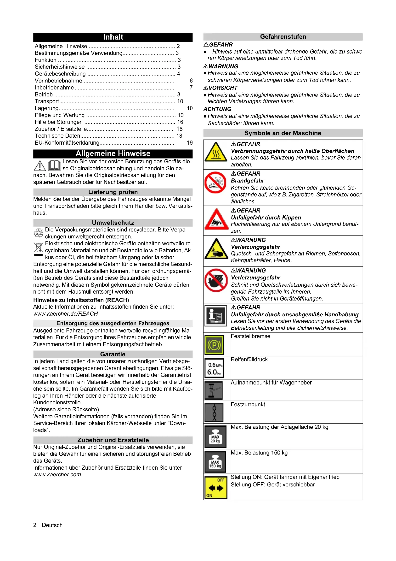 - 4812 Deutsch Inhalt Allgemeine Hinweise Lesen Sie vor der ersten Benutzung des Geräts die- se Originalbetriebsanleitung und handeln Sie da- nach. Bewahren Sie die Originalbetriebsanleitung für den späteren Gebrauch oder für Nachbesitzer auf. Lieferung prüfen Melden Sie bei der Übergabe des Fahrzeuges erkannte Mängel und Transportschäden bitte gleich Ihrem Händler bzw. Verkaufs- haus. Umweltschutz Die Verpackungsmaterialien sind recyclebar. Bitte Verpa- ckungen umweltgerecht entsorgen. Elektrische und elektronische Geräte enthalten wertvolle re- cyclebare Materialien und oft Bestandteile wie Batterien, Ak- kus oder Öl, die bei falschem Umgang oder falscher Entsorgung eine potenzielle Gefahr für die menschliche Gesund- heit und die Umwelt darstellen können. Für den ordnungsgemä- ßen Betrieb des Geräts sind diese Bestandteile jedoch notwendig. Mit diesem Symbol gekennzeichnete Geräte dürfen nicht mit dem Hausmüll entsorgt werden. Hinweise zu Inhaltsstoffen (REACH) Aktuelle Informationen zu Inhaltsstoffen finden Sie unter: www.kaercher.de/REACH Entsorgung des ausgedienten Fahrzeuges Ausgediente Fahrzeuge enthalten wertvolle recyclingfähige Ma- terialien. Für die Entsorgung ihres Fahrzeuges empfehlen wir die Zusammenarbeit mit einem Entsorgungsfachbetrieb. Garantie In jedem Land gelten die von unserer zuständigen Vertriebsge- sellschaft herausgegebenen Garantiebedingungen. Etwaige Stö- rungen an Ihrem Gerät beseitigen wir innerhalb der Garantiefrist kostenlos, sofern ein Material- oder Herstellungsfehler die Ursa- che sein sollte. Im Garantiefall wenden Sie sich bitte mit Kaufbe- leg an Ihren Händler oder die nächste autorisierte Kundendienststelle. (Adresse siehe Rückseite) Weitere Garantieinformationen (falls vorhanden) finden Sie im Service-Bereich Ihrer lokalen Kärcher-Webseite unter "Down- loads". Zubehör und Ersatzteile Nur Original-Zubehör und Original-Ersatzteile verwenden, sie bieten die Gewähr für einen sicheren und störungsfreien Betrieb des Geräts. Informationen über Zubehör und Ersatzteile finden Sie unter www.kaercher.com. Gefahrenstufen GEFAHR ● Hinweis auf eine unmittelbar drohende Gefahr, die zu schwe- ren Körperverletzungen oder zum Tod führt. 몇 WARNUNG ● Hinweis auf eine möglicherweise gefährliche Situation, die zu schweren Körperverletzungen oder zum Tod führen kann. 몇 VORSICHT ● Hinweis auf eine möglicherweise gefährliche Situation, die zu leichten Verletzungen führen kann. ACHTUNG ● Hinweis auf eine möglicherweise gefährliche Situation, die zu Sachschäden führen kann. Symbole an der Maschine Allgemeine Hinweise p. 2