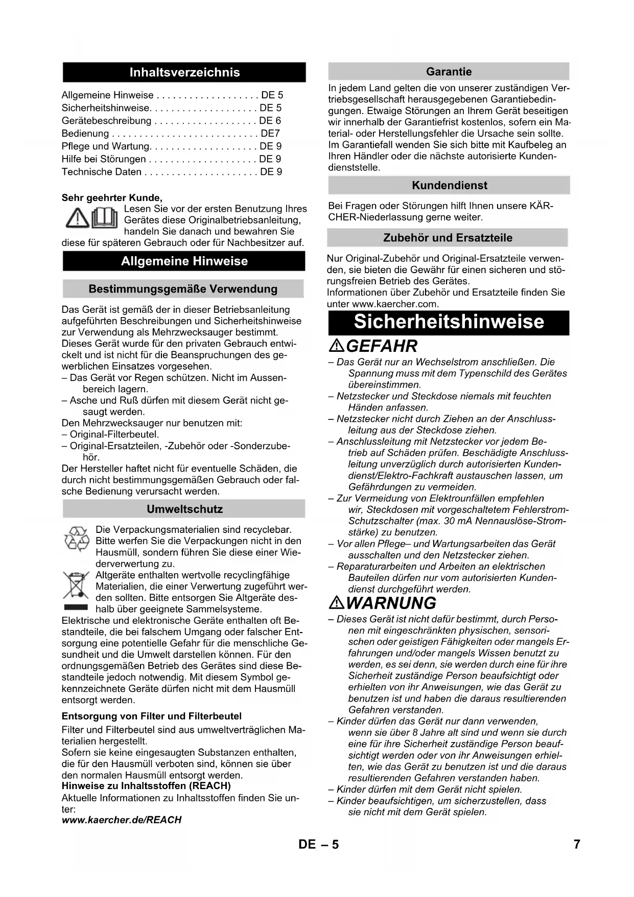 CH: 1300 WCH: 1300 WCH: 1300 WCH: 1300 WCH: 1300 WCH: 1300 WCH: 1300 W EU: 2100 W AU: 2100 W CH: 1000 W EU: 2100 W AU: 2100 W CH: 1100 W EU: 16 A AU: 16 A CH: 10 A 15 l 20 l 13 l 18 l 71 dB(A) 71 dB(A) 71 dB(A) H 05VV-F3G1,5 H 05VV-F2x0,75 WD 5: 8,2 kgWD 5 Premium: 8,7 kg 9,4 kg WD 5 P: 8,7 kgWD 5 P Premium: 9,1 kg 6– 5 Sehr geehrter Kunde, Lesen Sie vor der ersten Benutzung Ihres Gerätes diese Originalbetriebsanleitung, handeln Sie danach und bewahren Sie diese für späteren Gebrauch oder für Nachbesitzer auf. Das Gerät ist gemäß der in dieser Betriebsanleitung aufgeführten Beschreibungen und Sicherheitshinweise zur Verwendung als Mehrzwecksauger bestimmt. Dieses Gerät wurde für den privaten Gebrauch entwi- ckelt und ist nicht für die Beanspruchungen des ge- werblichen Einsatzes vorgesehen. – Das Gerät vor Regen schützen. Nicht im Aussen- bereich lagern. – Asche und Ruß dürfen mit diesem Gerät nicht ge- saugt werden. Den Mehrzwecksauger nur benutzen mit: – Original-Filterbeutel. – Original-Ersatzteilen, -Zubehör oder -Sonderzube- hör. Der Hersteller haftet nicht für eventuelle Schäden, die durch nicht bestimmungsgemäßen Gebrauch oder fal- sche Bedienung verursacht werden. Die Verpackungsmaterialien sind recyclebar. Bitte werfen Sie die Verpackungen nicht in den Hausmüll, sondern führen Sie diese einer Wie- derverwertung zu. Altgeräte enthalten wertvolle recyclingfähige Materialien, die einer Verwertung zugeführt wer- den sollten. Bitte entsorgen Sie Altgeräte des- halb über geeignete Sammelsysteme. Elektrische und elektronische Geräte enthalten oft Be- standteile, die bei falschem Umgang oder falscher Ent- sorgung eine potentielle Gefahr für die menschliche Ge- sundheit und die Umwelt darstellen können. Für den ordnungsgemäßen Betrieb des Gerätes sind diese Be- standteile jedoch notwendig. Mit diesem Symbol ge- kennzeichnete Geräte dürfen nicht mit dem Hausmüll entsorgt werden. Filter und Filterbeutel sind aus umweltverträglichen Ma- terialien hergestellt. Sofern sie keine eingesaugten Substanzen enthalten, die für den Hausmüll verboten sind, können sie über den normalen Hausmüll entsorgt werden. Hinweise zu Inhaltsstoffen (REACH) Aktuelle Informationen zu Inhaltsstoffen finden Sie un- ter: www.kaercher.de/REACH In jedem Land gelten die von unserer zuständigen Ver- triebsgesellschaft herausgegebenen Garantiebedin- gungen. Etwaige Störungen an Ihrem Gerät beseitigen wir innerhalb der Garantiefrist kostenlos, sofern ein Ma- terial- oder Herstellungsfehler die Ursache sein sollte. Im Garantiefall wenden Sie sich bitte mit Kaufbeleg an Ihren Händler oder die nächste autorisierte Kunden- dienststelle. Bei Fragen oder Störungen hilft Ihnen unsere KÄR- CHER-Niederlassung gerne weiter. GEFAHR – Das Gerät nur an Wechselstrom anschließen. Die Spannung muss mit dem Typenschild des Gerätes übereinstimmen. – Netzstecker und Steckdose niemals mit feuchten Händen anfassen. – Netzstecker nicht durch Ziehen an der Anschluss- leitung aus der Steckdose ziehen. – Anschlussleitung mit Netzstecker vor jedem Be- trieb auf Schäden prüfen. Beschädigte Anschluss- leitung unverzüglich durch autorisierten Kunden- dienst/Elektro-Fachkraft austauschen lassen, um Gefährdungen zu vermeiden. – Zur Vermeidung von Elektrounfällen empfehlen wir, Steckdosen mit vorgeschaltetem Fehlerstrom- Schutzschalter (max. 30 mA Nennauslöse-Strom- stärke) zu benutzen. – Vor allen Pflege– und Wartungsarbeiten das Gerät ausschalten und den Netzstecker ziehen. – Reparaturarbeiten und Arbeiten an elektrischen Bauteilen dürfen nur vom autorisierten Kunden- dienst durchgeführt werden. WARNUNG – Dieses Gerät ist nicht dafür bestimmt, durch Perso- nen mit eingeschränkten physischen, sensori- schen oder geistigen Fähigkeiten oder mangels Er- fahrungen und/oder mangels Wissen benutzt zu werden, es sei denn, sie werden durch eine für ihre Sicherheit zuständige Person beaufsichtigt oder erhielten von ihr Anweisungen, wie das Gerät zu benutzen ist und haben die daraus resultierenden Gefahren verstanden. – Kinder dürfen das Gerät nur dann verwenden, wenn sie über 8 Jahre alt sind und wenn sie durch eine für ihre Sicherheit zuständige Person beauf- sichtigt werden oder von ihr Anweisungen erhiel- ten, wie das Gerät zu benutzen ist und die daraus resultierenden Gefahren verstanden haben. – Kinder dürfen mit dem Gerät nicht spielen. – Kinder beaufsichtigen, um sicherzustellen, dass sie nicht mit dem Gerät spielen. Inhaltsverzeichnis Allgemeine Hinweise ... DE 5 Sicherheitshinweise... DE 5 Gerätebeschreibung ... DE 6 Bedienung ... DE7 Pflege und Wartung... DE 9 Hilfe bei Störungen ... DE 9 Technische Daten ... DE 9 Allgemeine Hinweise Bestimmungsgemäße Verwendung Umweltschutz Entsorgung von Filter und Filterbeutel Garantie Kundendienst Sicherheitshinweise 7DE Nur Original-Zubehör und Original-Ersatzteile verwen- den, sie bieten die Gewähr für einen sicheren und stö- rungsfreien Betrieb des Gerätes. Informationen über Zubehör und Ersatzteile finden Sie unter www.kaercher.com. Zubehör und Ersatzteile– 6 – Die Reinigung und Anwenderwartung dürfen von Kindern nicht ohne Aufsicht durchgeführt werden.– Verpackungsfolien von Kindern fernhalten, es be-steht Erstickungsgefahr!– Gerät nach jedem Gebrauch und vor jeder Reini-gung/Wartung ausschalten.– Brandgefahr. Keine brennenden oder glimmenden Gegenstände aufsaugen.– Der Betrieb in explosionsgefährdeten Bereichen ist untersagt.– Bei Schaumbildung oder Flüssigkeitsaustritt das Ge-rät sofort ausschalten oder den Netzstecker ziehen!– Keine Scheuermittel, Glas- oder Allzweckreiniger verwenden! Gerät niemals in Wasser tauchen.Bestimmte Stoffe können durch die Verwirbelung mit der Saugluft explosive Dämpfe oder Gemische bilden!Nachfolgende Stoffe niemals aufsaugen:– Explosive oder brennbare Gase, Flüssigkeiten und Stäube (reaktive Stäube)– Reaktive Metall-St