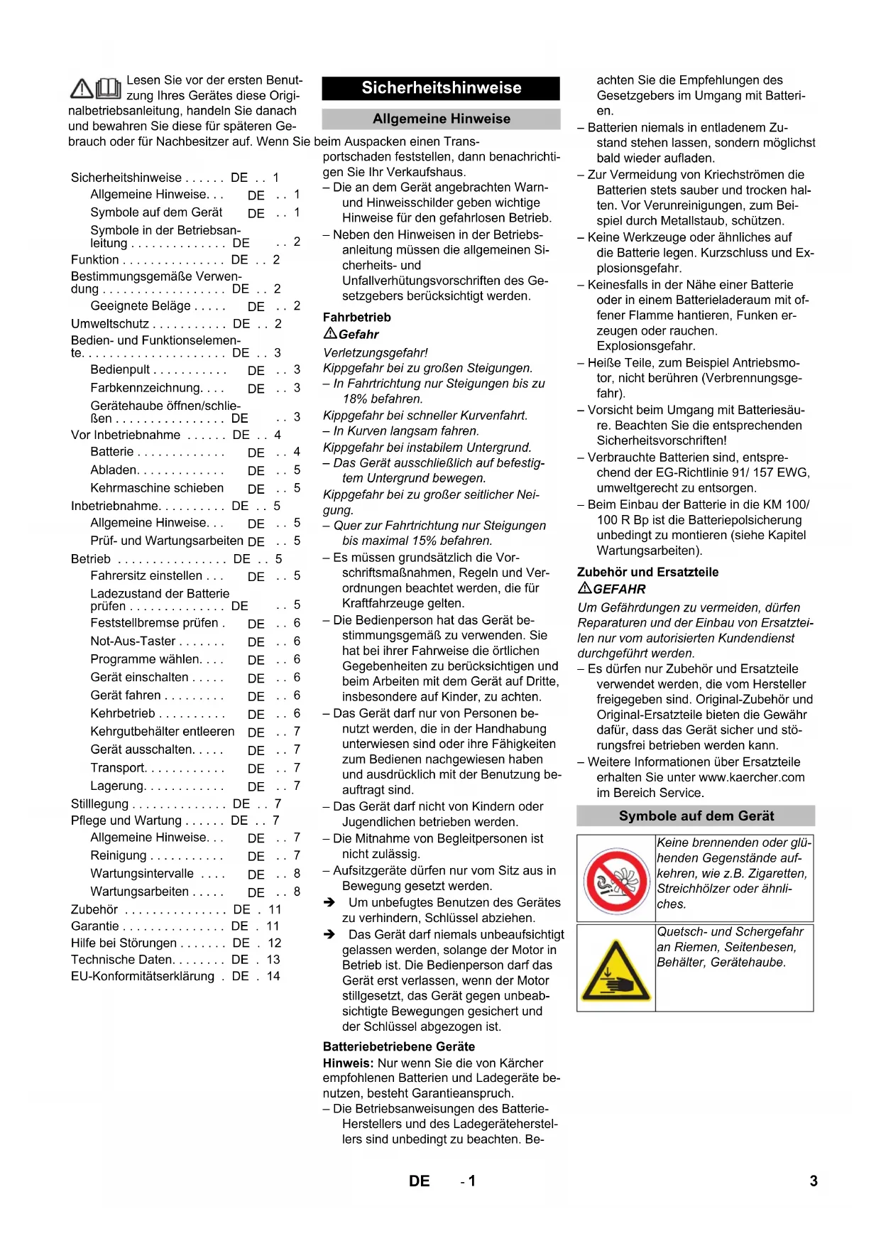 ﺔﯾﺒﺮﻌﻠا2- 1 Lesen Sie vor der ersten Benut- zung Ihres Gerätes diese Origi- nalbetriebsanleitung, handeln Sie danach und bewahren Sie diese für späteren Ge- brauch oder für Nachbesitzer auf. Wenn Sie beim Auspacken einen Trans- portschaden feststellen, dann benachrichti- gen Sie Ihr Verkaufshaus. – Die an dem Gerät angebrachten Warn- und Hinweisschilder geben wichtige Hinweise für den gefahrlosen Betrieb. – Neben den Hinweisen in der Betriebs- anleitung müssen die allgemeinen Si- cherheits- und Unfallverhütungsvorschriften des Ge- setzgebers berücksichtigt werden. Gefahr Verletzungsgefahr! Kippgefahr bei zu großen Steigungen. – In Fahrtrichtung nur Steigungen bis zu 18% befahren. Kippgefahr bei schneller Kurvenfahrt. – In Kurven langsam fahren. Kippgefahr bei instabilem Untergrund. – Das Gerät ausschließlich auf befestig- tem Untergrund bewegen. Kippgefahr bei zu großer seitlicher Nei- gung. – Quer zur Fahrtrichtung nur Steigungen bis maximal 15% befahren. – Es müssen grundsätzlich die Vor- schriftsmaßnahmen, Regeln und Ver- ordnungen beachtet werden, die für Kraftfahrzeuge gelten. – Die Bedienperson hat das Gerät be- stimmungsgemäß zu verwenden. Sie hat bei ihrer Fahrweise die örtlichen Gegebenheiten zu berücksichtigen und beim Arbeiten mit dem Gerät auf Dritte, insbesondere auf Kinder, zu achten. – Das Gerät darf nur von Personen be- nutzt werden, die in der Handhabung unterwiesen sind oder ihre Fähigkeiten zum Bedienen nachgewiesen haben und ausdrücklich mit der Benutzung be- auftragt sind. – Das Gerät darf nicht von Kindern oder Jugendlichen betrieben werden. – Die Mitnahme von Begleitpersonen ist nicht zulässig. – Aufsitzgeräte dürfen nur vom Sitz aus in Bewegung gesetzt werden. Um unbefugtes Benutzen des Gerätes zu verhindern, Schlüssel abziehen. Das Gerät darf niemals unbeaufsichtigt gelassen werden, solange der Motor in Betrieb ist. Die Bedienperson darf das Gerät erst verlassen, wenn der Motor stillgesetzt, das Gerät gegen unbeab- sichtigte Bewegungen gesichert und der Schlüssel abgezogen ist. Hinweis: Nur wenn Sie die von Kärcher empfohlenen Batterien und Ladegeräte be- nutzen, besteht Garantieanspruch. – Die Betriebsanweisungen des Batterie- Herstellers und des Ladegeräteherstel- lers sind unbedingt zu beachten. Be- achten Sie die Empfehlungen des Gesetzgebers im Umgang mit Batteri- en. – Batterien niemals in entladenem Zu- stand stehen lassen, sondern möglichst bald wieder aufladen. – Zur Vermeidung von Kriechströmen die Batterien stets sauber und trocken hal- ten. Vor Verunreinigungen, zum Bei- spiel durch Metallstaub, schützen. – Keine Werkzeuge oder ähnliches auf die Batterie legen. Kurzschluss und Ex- plosionsgefahr. – Keinesfalls in der Nähe einer Batterie oder in einem Batterieladeraum mit of- fener Flamme hantieren, Funken er- zeugen oder rauchen. Explosionsgefahr. – Heiße Teile, zum Beispiel Antriebsmo- tor, nicht berühren (Verbrennungsge- fahr). – Vorsicht beim Umgang mit Batteriesäu- re. Beachten Sie die entsprechenden Sicherheitsvorschriften! – Verbrauchte Batterien sind, entspre- chend der EG-Richtlinie 91/ 157 EWG, umweltgerecht zu entsorgen. – Beim Einbau der Batterie in die KM 100/ 100 R Bp ist die Batteriepolsicherung unbedingt zu montieren (siehe Kapitel Wartungsarbeiten). GEFAHR Um Gefährdungen zu vermeiden, dürfen Reparaturen und der Einbau von Ersatztei- len nur vom autorisierten Kundendienst durchgeführt werden. – Es dürfen nur Zubehör und Ersatzteile verwendet werden, die vom Hersteller freigegeben sind. Original-Zubehör und Original-Ersatzteile bieten die Gewähr dafür, dass das Gerät sicher und stö- rungsfrei betrieben werden kann. – Weitere Informationen über Ersatzteile erhalten Sie unter www.kaercher.com im Bereich Service. Sicherheitshinweise . . . . . . DE . . 1 Allgemeine Hinweise. . .