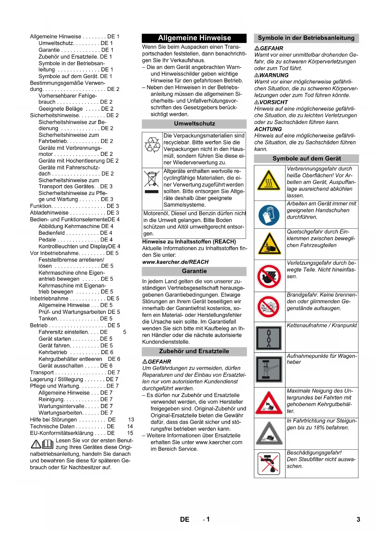 4322- 1 Lesen Sie vor der ersten Benut- zung Ihres Gerätes diese Origi- nalbetriebsanleitung, handeln Sie danach und bewahren Sie diese für späteren Ge- brauch oder für Nachbesitzer auf. Wenn Sie beim Auspacken einen Trans- portschaden feststellen, dann benachrichti- gen Sie Ihr Verkaufshaus. – Die an dem Gerät angebrachten Warn- und Hinweisschilder geben wichtige Hinweise für den gefahrlosen Betrieb. – Neben den Hinweisen in der Betriebs- anleitung müssen die allgemeinen Si- cherheits- und Unfallverhütungsvor- schriften des Gesetzgebers berück- sichtigt werden. Hinweise zu Inhaltsstoffen (REACH) Aktuelle Informationen zu Inhaltsstoffen fin- den Sie unter: www.kaercher.de/REACH In jedem Land gelten die von unserer zu- ständigen Vertriebsgesellschaft herausge- gebenen Garantiebedingungen. Etwaige Störungen an Ihrem Gerät beseitigen wir innerhalb der Garantiefrist kostenlos, so- fern ein Material- oder Herstellungsfehler die Ursache sein sollte. Im Garantiefall wenden Sie sich bitte mit Kaufbeleg an Ih- ren Händler oder die nächste autorisierte Kundendienststelle. GEFAHR Um Gefährdungen zu vermeiden, dürfen Reparaturen und der Einbau von Ersatztei- len nur vom autorisierten Kundendienst durchgeführt werden. – Es dürfen nur Zubehör und Ersatzteile verwendet werden, die vom Hersteller freigegeben sind. Original-Zubehör und Original-Ersatzteile bieten die Gewähr dafür, dass das Gerät sicher und stö- rungsfrei betrieben werden kann. – Weitere Informationen über Ersatzteile erhalten Sie unter www.kaercher.com im Bereich Service. GEFAHR Warnt vor einer unmittelbar drohenden Ge- fahr, die zu schweren Körperverletzungen oder zum Tod führt. 몇 WARNUNG Warnt vor einer möglicherweise gefährli- chen Situation, die zu schweren Körperver- letzungen oder zum Tod führen könnte. 몇 VORSICHT Hinweis auf eine möglicherweise gefährli- che Situation, die zu leichten Verletzungen oder zu Sachschäden führen kann. ACHTUNG Hinweis auf eine möglicherweise gefährli- che Situation, die zu Sachschäden führen kann. Allgemeine Hinweise . . . . . . . . DE 1 Umweltschutz. . . . . . . . . DE 1 Garantie . . . . . . . . . . . . . DE 1 Zubehör und Ersatzteile. DE 1 Symbole in der Betriebsan- leitung . . . . . . . . . . . . . . DE 1 Symbole auf dem Gerät. DE 1 Bestimmungsgemäße Verwen- dung. . . . . . . . . . . . . . . . . . . . . DE 2 Vorhersehbarer Fehlge- brauch . . . . . . . . . . . . . . DE 2 Geeignete Beläge . . . . . DE 2 Sicherheitshinweise. . . . . . . . . DE 2 Sicherheitshinweise zur Be- dienung . . . . . . . . . . . . . DE 2 Sicherheitshinweise zum Fahrbetrieb. . . . . . . . . . . DE 2 Geräte mit Verbrennungs- motor . . . . . . . . . . . . . . . DE 2 Geräte mit Hochentleerung DE 2 Geräte mit Fahrerschutz- dach . . . . . . . . . . . . . . . . DE 2 Sicherheitshinweise zum Transport des Gerätes. . DE 3 Sicherheitshinweise zu Pfle- ge und Wartung . . . . . . . DE 3 Funktion. . . . . . . . . . . . . . . . . . DE 3 Abladehinweise . . . . . . . . . . . . DE 3 Bedien- und FunktionselementeDE 4 Abbildung Kehrmaschine DE 4 Bedienfeld . . . . . . . . . . . DE 4 Pedale . . . . . . . . . . . . . . DE 4 Kontrollleuchten und DisplayDE 4 Vor Inbetriebnahme. . . . . . . . . DE 5 Feststellbremse arretieren/ lösen . . . . . . . . . . . . . . . DE 5 Kehrmaschine ohne Eigen- antrieb bewegen . . . . . . DE 5 Kehrmaschine mit Eigenan- trieb bewegen . . . . . . . . DE 5 Inbetriebnahme . . . . . . . . . . . . DE 5 Allgemeine Hinweise . . . DE 5 Prüf- und Wartungsarbeiten DE 5 Tanken. . . . . . . . . . . . . . DE 5 Betrieb . . . . . . . . . . . . . . . . . . . DE 5 Fahrersitz einstellen. . . . DE 5 Gerät starten . . . . . . . . . DE 5 Gerät fahren. . . . . . . . . . DE 5 Kehrbetrieb . . . . . . . . . . DE 6 Kehrgutbehälter entleeren DE 6 Gerät ausschalten . . . . . DE 6 Transport . . . . . . . . . . . . . . . . . DE 7 Lagerung / Stilllegung . . . . . . . DE 7 Pflege und Wartung. . . . . . . . . DE 7 Allgemeine Hinweise . . . DE 7 Reinigung. . . . . . . . . . . . DE 7 Wartungsintervalle . . . . . DE 7 Wartungsarbeiten. . . . . . DE 7 Hilfe bei Störungen . . . . . . . . . DE 13 Technische Daten . . . . . . . . . . DE 14 EU-Konformitätserklärung . . . . DE 15 Allgemeine Hinweise Umweltschutz Die Verpackungsmaterialien sind recyclebar. Bitte werfen Sie die Verpackungen nicht in den Haus- müll, sondern führen Sie diese ei- ner Wiederverwertung zu. Altgeräte enthalten wertvolle re- cyclingfähige Materialien, die ei- ner Verwertung zugeführt werden sollten. Bitte entsorgen Sie Altge- räte deshalb über geeignete Sammelsysteme. Motorenöl, Diesel und Benzin dürfen nicht in die Umwelt gelangen. Bitte Boden schützen und Altöl umweltgerecht entsor- gen. Garantie Zubehör und Ersatzteile Symbole in der Betriebsanleitung Symbole auf dem Gerät Verbrennungsgefahr durch heiße Oberflächen! Vor Ar- beiten am Gerät, Auspuffan- lage ausreichend abkühlen lassen. Arbeiten am Gerät immer mit geeigneten Handschuhen durchführen. Quetschgefahr durch Ein- klemmen zwischen bewegli- chen Fahrzeugteilen Verletzungsgefahr durch be- wegte Teile. Nicht hineinfas- sen. Brandgefahr. Keine brennen- den oder glimmenden Ge- genstände aufsaugen. Kettenaufnahme / Kranpunkt Aufnahmepunkte für Wagen- heber Maximale Neigung des Un- tergrundes bei Fahrten mit gehobenem Kehrgutbehäl- ter. In Fahrtrichtung nur Steigun- gen bis zu 18% befahren. Beschädigungsgefahr! Den Staubfilter nicht auswa- schen. 3DE- 2 Die Kehrmaschine ist zur Reinigung von Bodenflächen für den gewerblichen Ein- satz und z. B. für folgende Einsatzgebiete vorgesehen: Parkplätze Produktionsanlagen Logistikbereiche Hotel Einzelhandel Lagerbereiche Gehwege Verwenden Sie diese Kehrmaschine ausschließlich gemäß den Angaben in dieser Betriebsanleitung. Jede darüber hinausgehende Verwen- dung gilt als nicht bestimmungsgemäß. Für hieraus resultierende Schäden haf- tet der Hersteller nicht; das Risiko hier- für trägt allein d