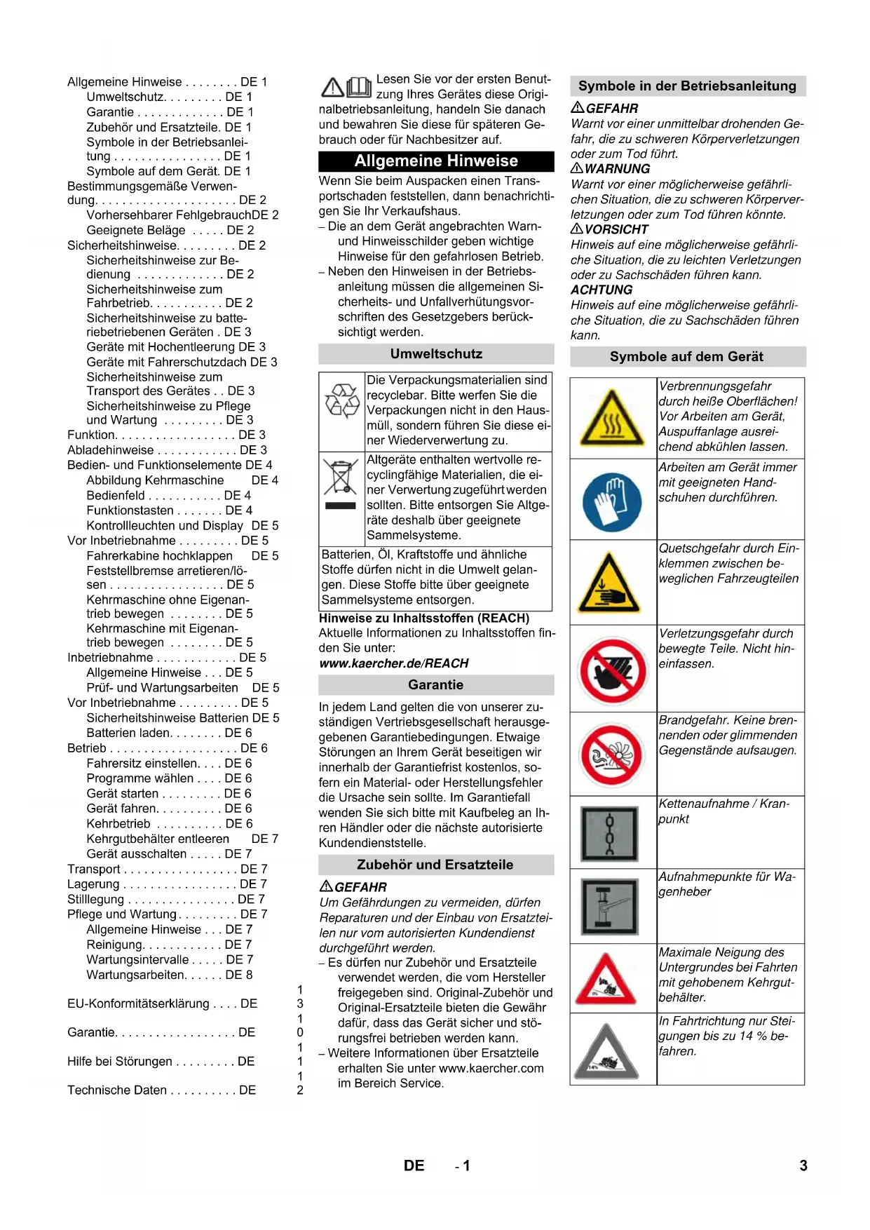 3702- 1 Lesen Sie vor der ersten Benut- zung Ihres Gerätes diese Origi- nalbetriebsanleitung, handeln Sie danach und bewahren Sie diese für späteren Ge- brauch oder für Nachbesitzer auf. Wenn Sie beim Auspacken einen Trans- portschaden feststellen, dann benachrichti- gen Sie Ihr Verkaufshaus. – Die an dem Gerät angebrachten Warn- und Hinweisschilder geben wichtige Hinweise für den gefahrlosen Betrieb. – Neben den Hinweisen in der Betriebs- anleitung müssen die allgemeinen Si- cherheits- und Unfallverhütungsvor- schriften des Gesetzgebers berück- sichtigt werden. Hinweise zu Inhaltsstoffen (REACH) Aktuelle Informationen zu Inhaltsstoffen fin- den Sie unter: www.kaercher.de/REACH In jedem Land gelten die von unserer zu- ständigen Vertriebsgesellschaft herausge- gebenen Garantiebedingungen. Etwaige Störungen an Ihrem Gerät beseitigen wir innerhalb der Garantiefrist kostenlos, so- fern ein Material- oder Herstellungsfehler die Ursache sein sollte. Im Garantiefall wenden Sie sich bitte mit Kaufbeleg an Ih- ren Händler oder die nächste autorisierte Kundendienststelle. GEFAHR Um Gefährdungen zu vermeiden, dürfen Reparaturen und der Einbau von Ersatztei- len nur vom autorisierten Kundendienst durchgeführt werden. – Es dürfen nur Zubehör und Ersatzteile verwendet werden, die vom Hersteller freigegeben sind. Original-Zubehör und Original-Ersatzteile bieten die Gewähr dafür, dass das Gerät sicher und stö- rungsfrei betrieben werden kann. – Weitere Informationen über Ersatzteile erhalten Sie unter www.kaercher.com im Bereich Service. GEFAHR Warnt vor einer unmittelbar drohenden Ge- fahr, die zu schweren Körperverletzungen oder zum Tod führt. 몇 WARNUNG Warnt vor einer möglicherweise gefährli- chen Situation, die zu schweren Körperver- letzungen oder zum Tod führen könnte. 몇 VORSICHT Hinweis auf eine möglicherweise gefährli- che Situation, die zu leichten Verletzungen oder zu Sachschäden führen kann. ACHTUNG Hinweis auf eine möglicherweise gefährli- che Situation, die zu Sachschäden führen kann. Allgemeine Hinweise . . . . . . . . DE 1 Umweltschutz. . . . . . . . . DE 1 Garantie . . . . . . . . . . . . . DE 1 Zubehör und Ersatzteile. DE 1 Symbole in der Betriebsanlei- tung . . . . . . . . . . . . . . . . DE 1 Symbole auf dem Gerät. DE 1 Bestimmungsgemäße Verwen- dung. . . . . . . . . . . . . . . . . . . . . DE 2 Vorhersehbarer FehlgebrauchDE 2 Geeignete Beläge . . . . . DE 2 Sicherheitshinweise. . . . . . . . . DE 2 Sicherheitshinweise zur Be- dienung . . . . . . . . . . . . . DE 2 Sicherheitshinweise zum Fahrbetrieb. . . . . . . . . . . DE 2 Sicherheitshinweise zu batte- riebetriebenen Geräten . DE 3 Geräte mit Hochentleerung DE 3 Geräte mit Fahrerschutzdach DE 3 Sicherheitshinweise zum Transport des Gerätes . . DE 3 Sicherheitshinweise zu Pflege und Wartung . . . . . . . . . DE 3 Funktion. . . . . . . . . . . . . . . . . . DE 3 Abladehinweise . . . . . . . . . . . . DE 3 Bedien- und Funktionselemente DE 4 Abbildung Kehrmaschine DE 4 Bedienfeld . . . . . . . . . . . DE 4 Funktionstasten . . . . . . . DE 4 Kontrollleuchten und Display DE 5 Vor Inbetriebnahme . . . . . . . . . DE 5 Fahrerkabine hochklappen DE 5 Feststellbremse arretieren/lö- sen . . . . . . . . . . . . . . . . . DE 5 Kehrmaschine ohne Eigenan- trieb bewegen . . . . . . . . DE 5 Kehrmaschine mit Eigenan- trieb bewegen . . . . . . . . DE 5 Inbetriebnahme . . . . . . . . . . . . DE 5 Allgemeine Hinweise . . . DE 5 Prüf- und Wartungsarbeiten DE 5 Vor Inbetriebnahme . . . . . . . . . DE 5 Sicherheitshinweise Batterien DE 5 Batterien laden. . . . . . . . DE 6 Betrieb . . . . . . . . . . . . . . . . . . . DE 6 Fahrersitz einstellen. . . . DE 6 Programme wählen . . . . DE 6 Gerät starten . . . . . . . . . DE 6 Gerät fahren. . . . . . . . . . DE 6 Kehrbetrieb . . . . . . . . . . DE 6 Kehrgutbehälter entleeren DE 7 Gerät ausschalten . . . . . DE 7 Transport . . . . . . . . . . . . . . . . . DE 7 Lagerung . . . . . . . . . . . . . . . . . DE 7 Stilllegung . . . . . . . . . . . . . . . . DE 7 Pflege und Wartung . . . . . . . . . DE 7 Allgemeine Hinweise . . . DE 7 Reinigung. . . . . . . . . . . . DE 7 Wartungsintervalle . . . . . DE 7 Wartungsarbeiten. . . . . . DE 8 EU-Konformitätserklärung . . . . DE